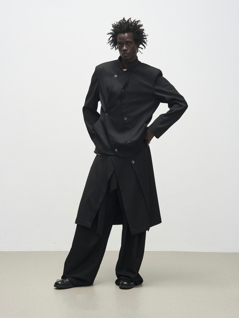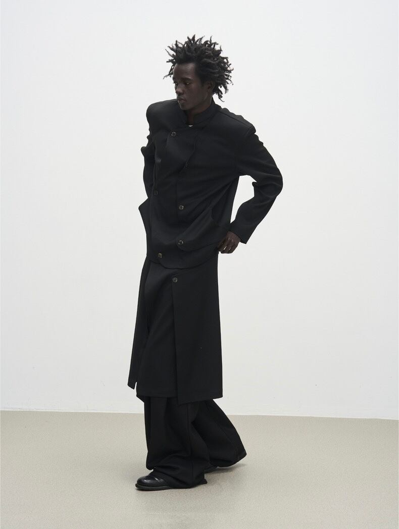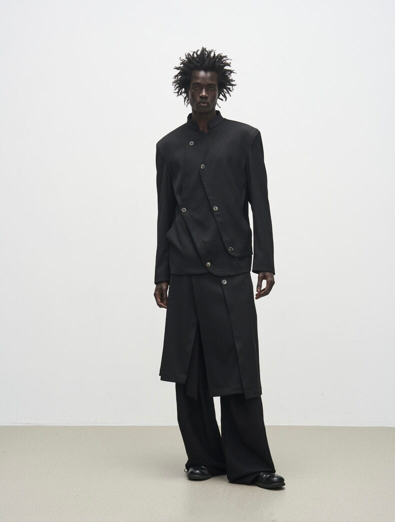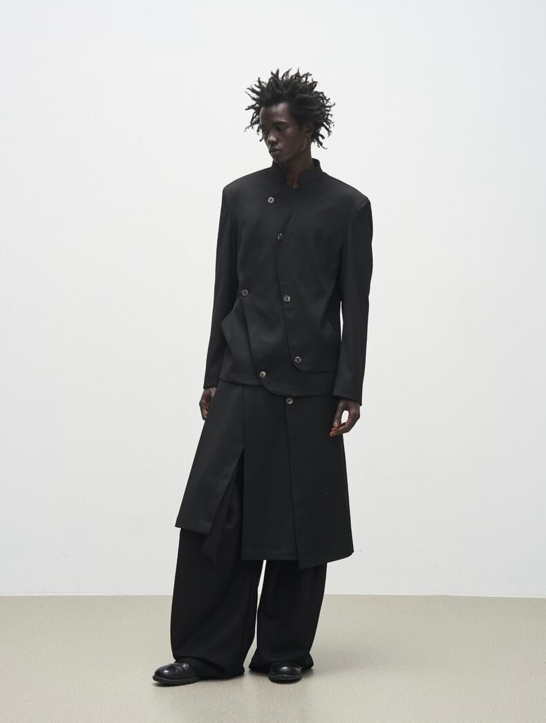 複数のボタンディテールがアクセントになり、斬新なシルエットを演出します。