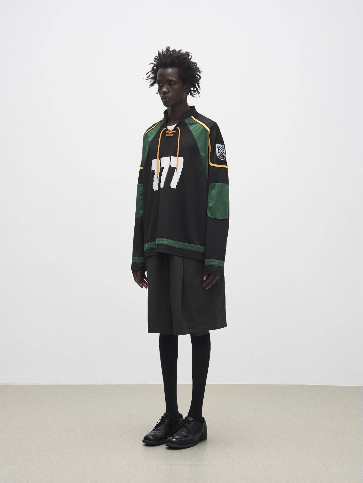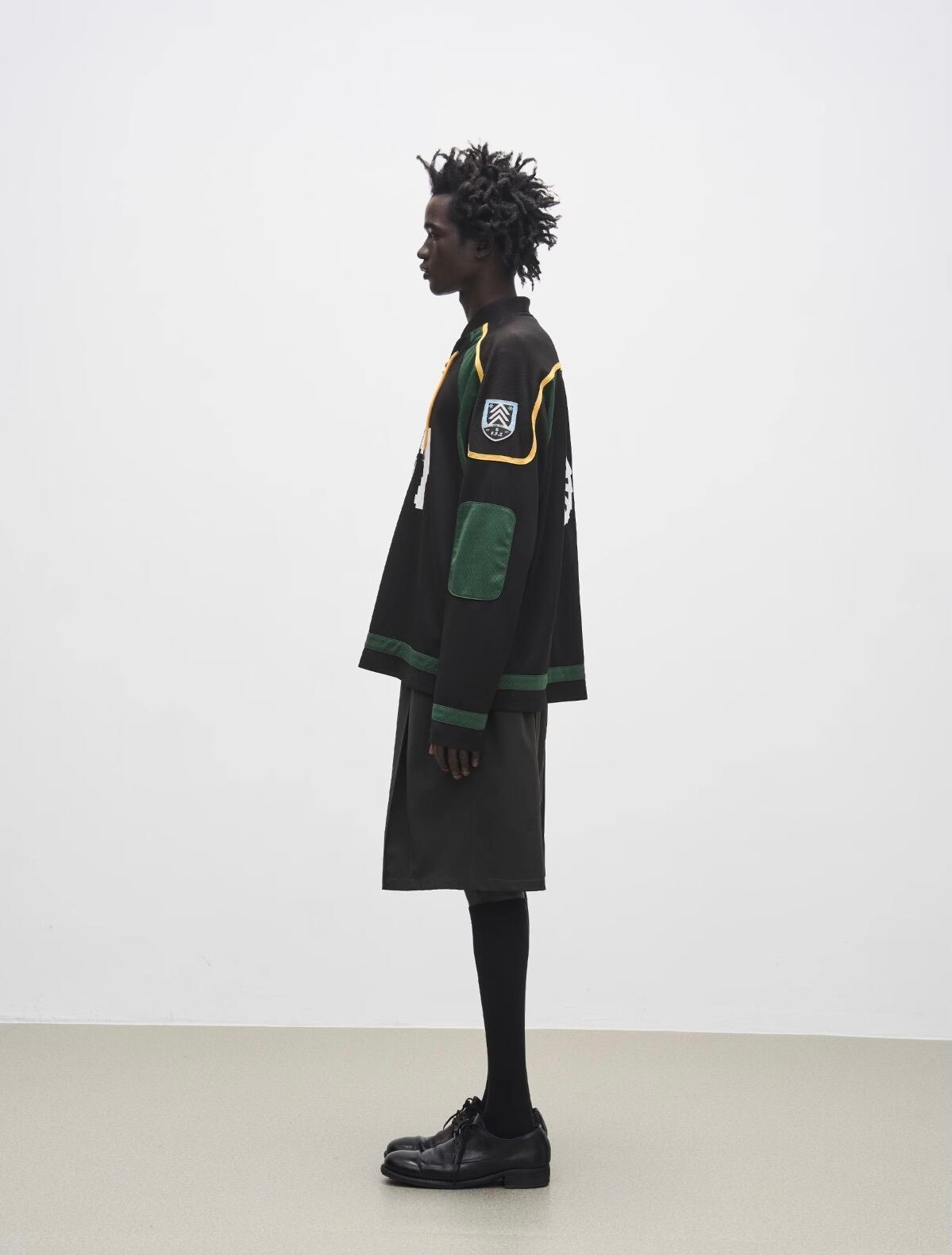 袖には刺繍ワッペンが施され、ディテールにこだわったスタイルを表現。
