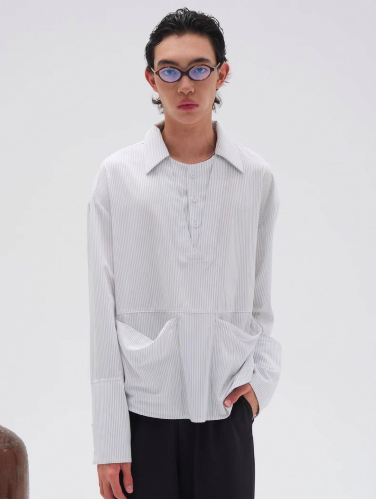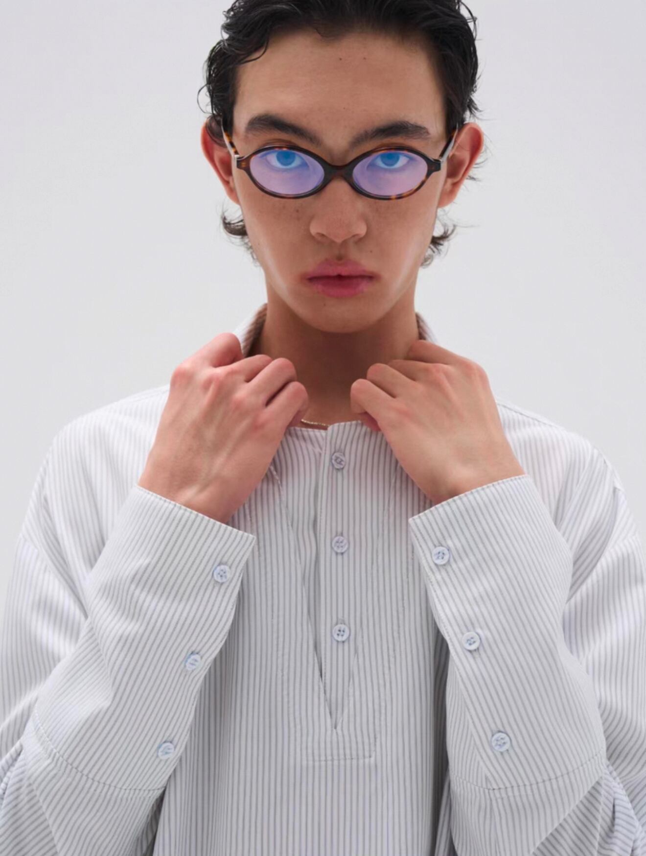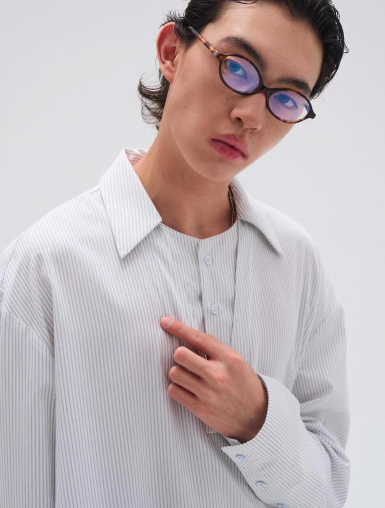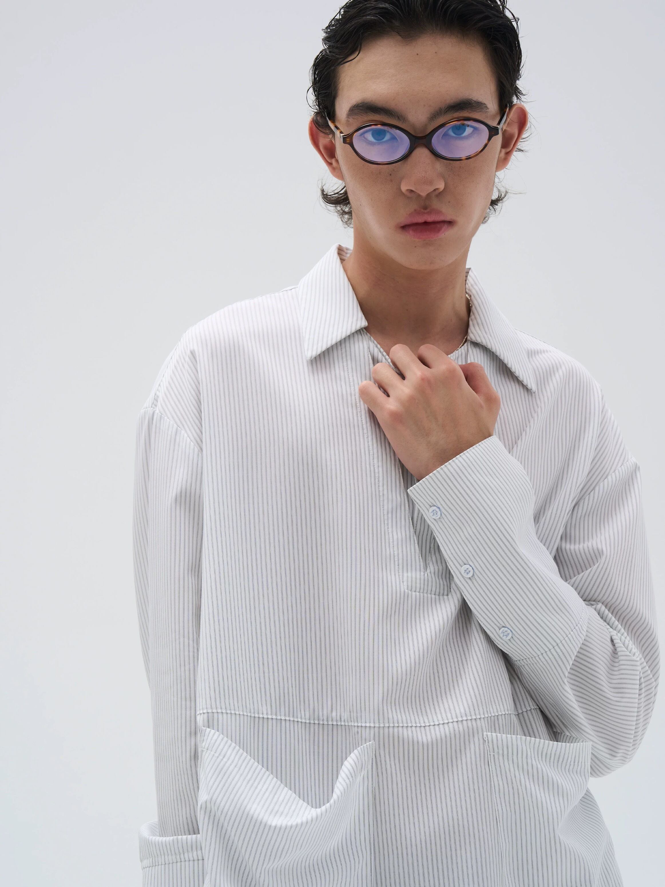 襟元は二重襟仕様で、奥行きと立体感をプラスし、袖口部分には3つのアイレットディテールを施し、細部までこだわったデザインが魅力。