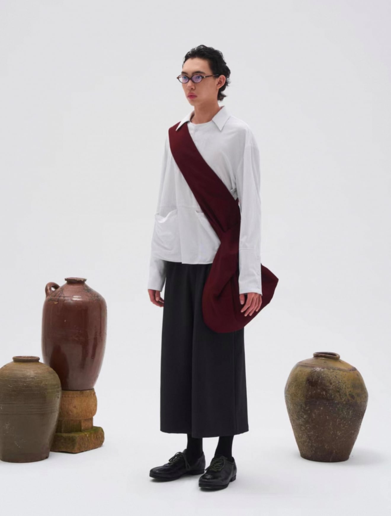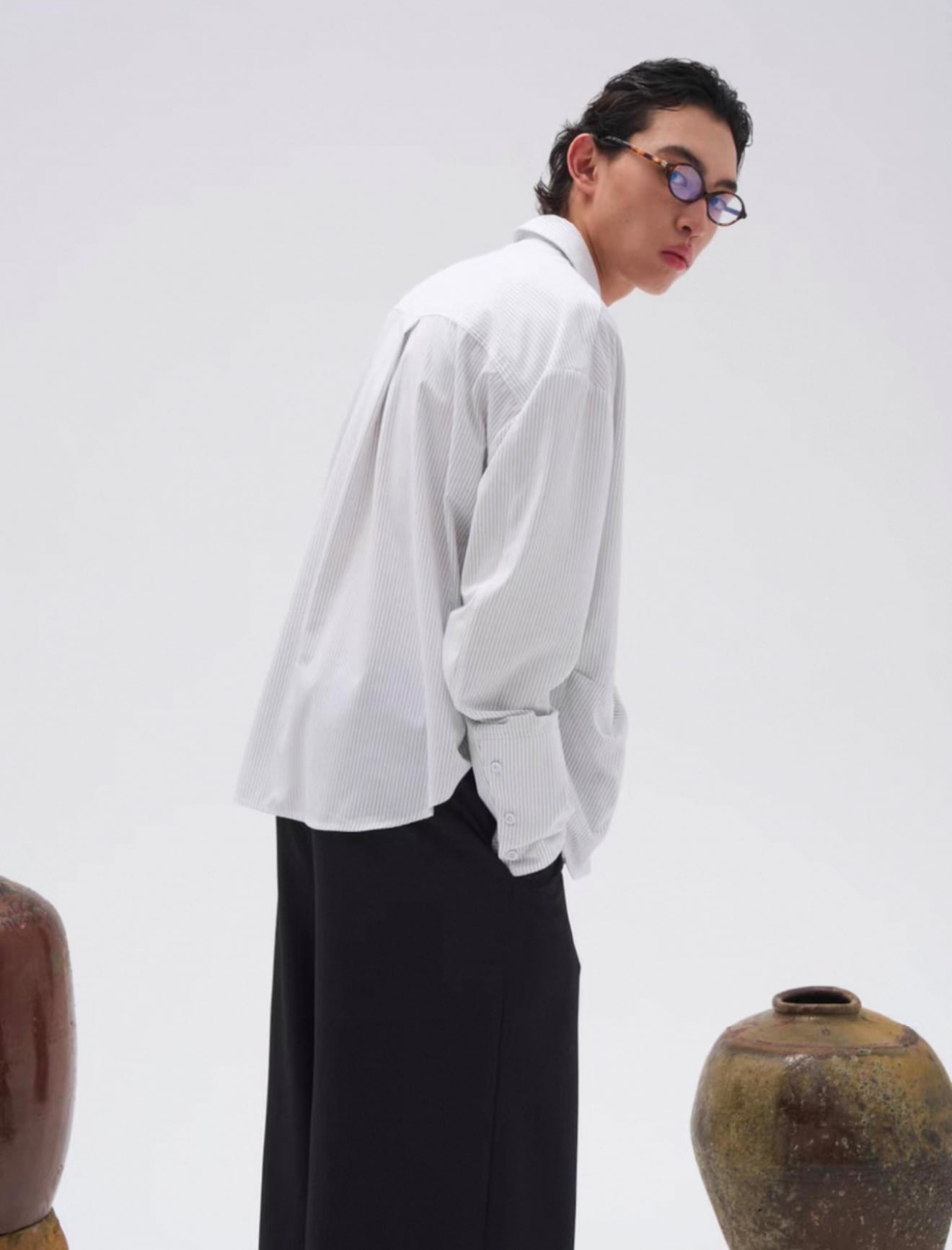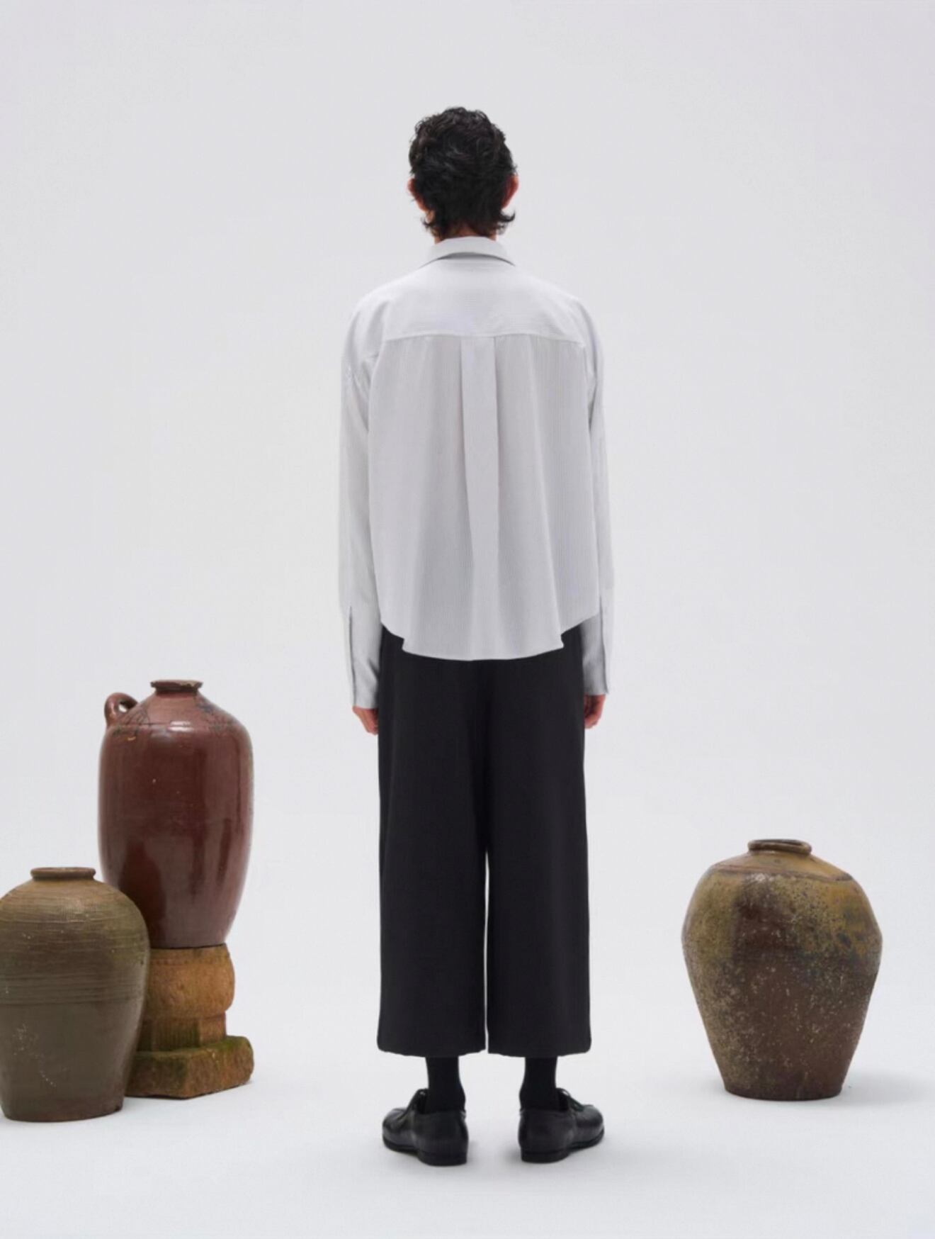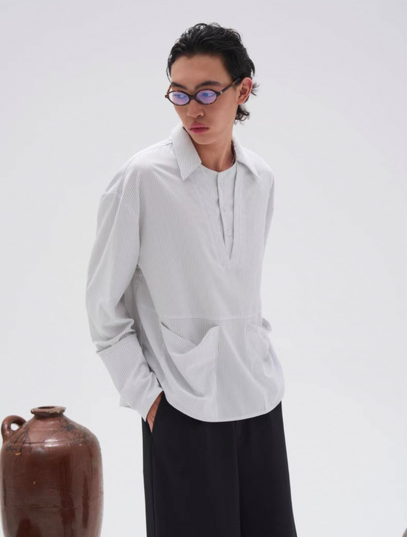襟元は二重襟仕様で、奥行きと立体感をプラスし、袖口部分には3つのアイレットディテールを施し、細部までこだわったデザインが魅力。