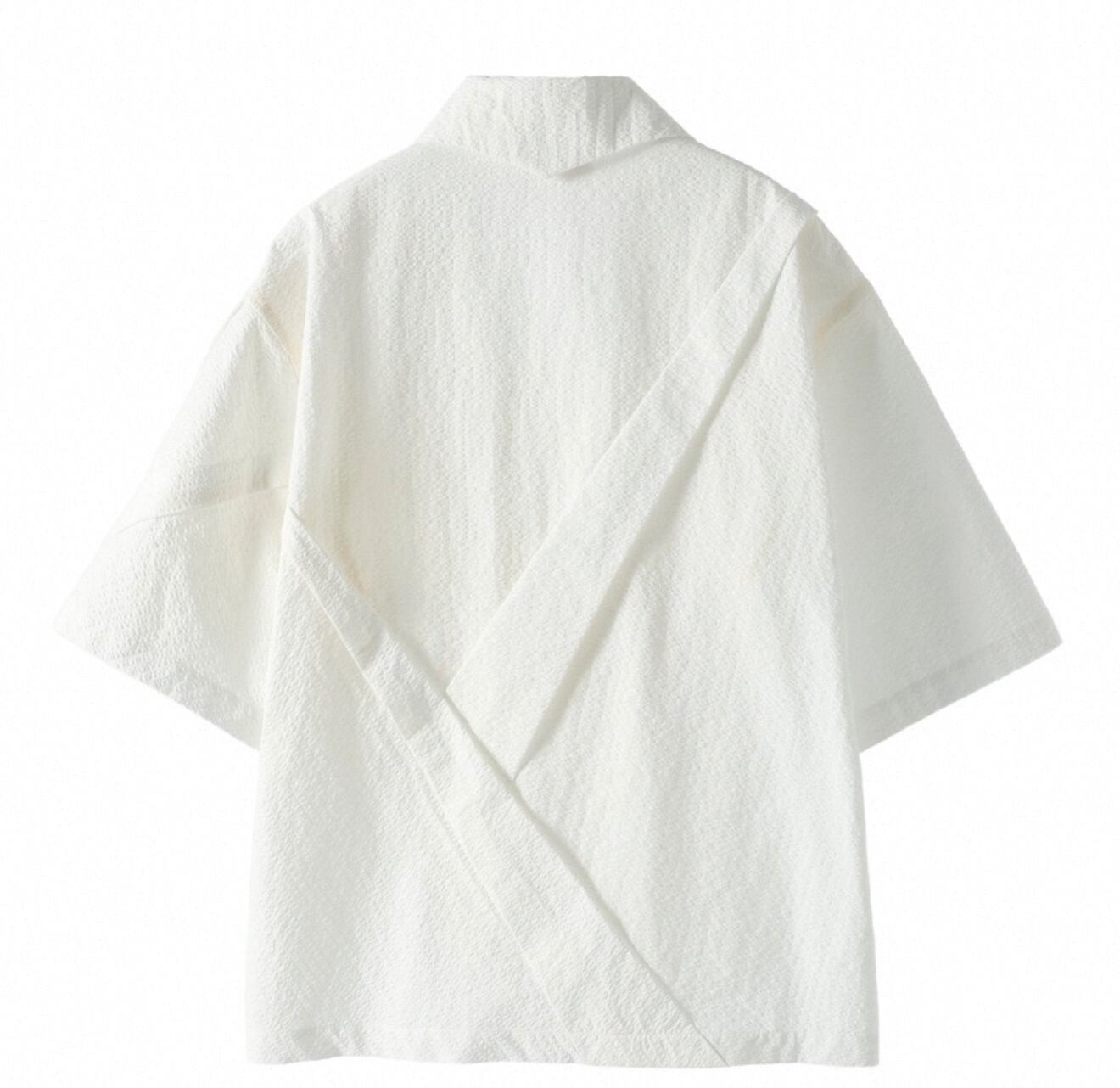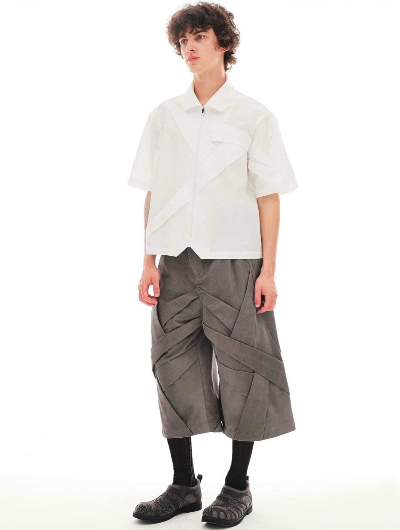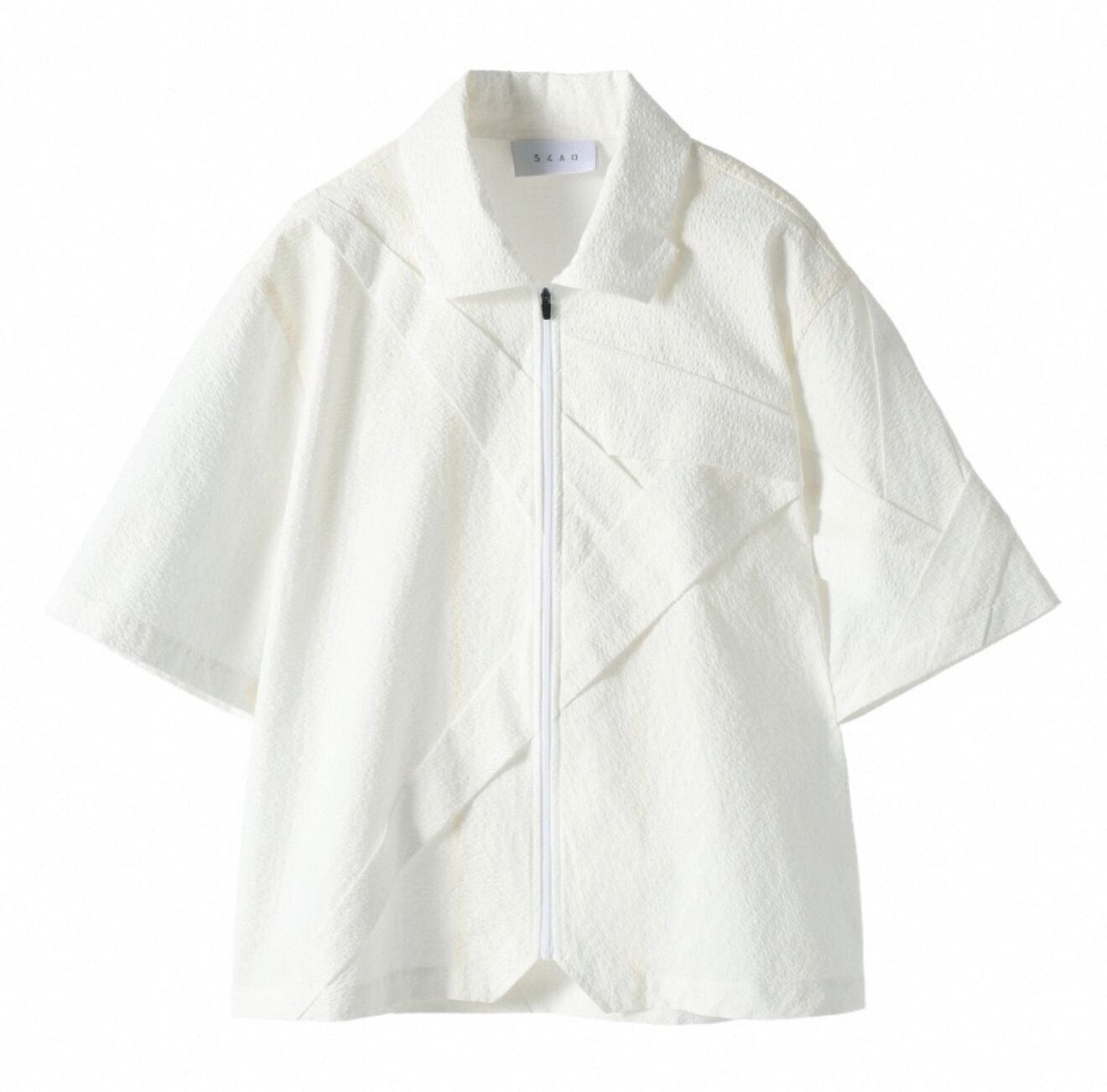 幾何学的なカッティングと、複雑に重ねられたドレープが特徴的なデザインシャツ。
