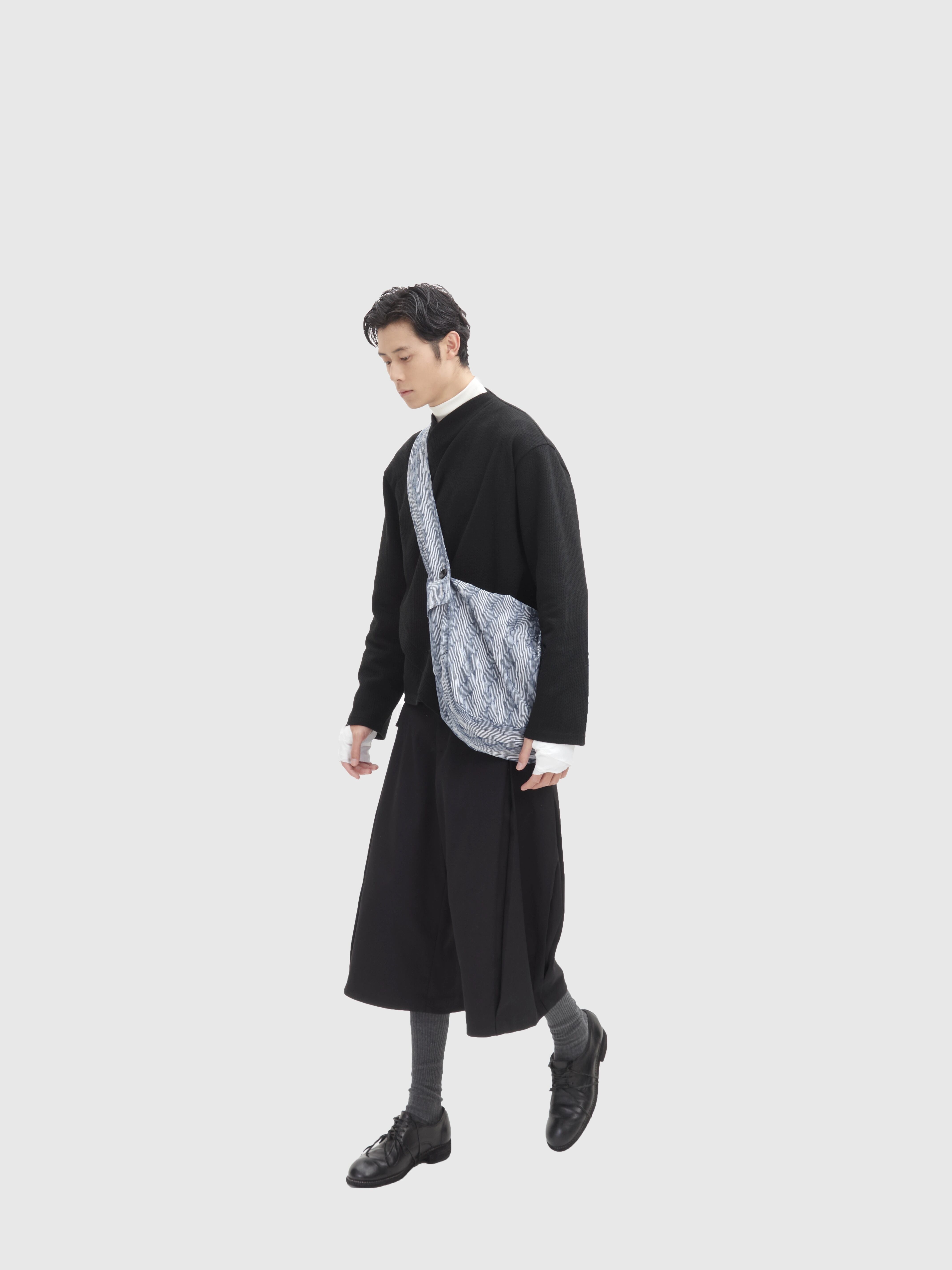 ドレープ感のある厚手の生地を使用し、全体的に立体的なシルエットを構築。