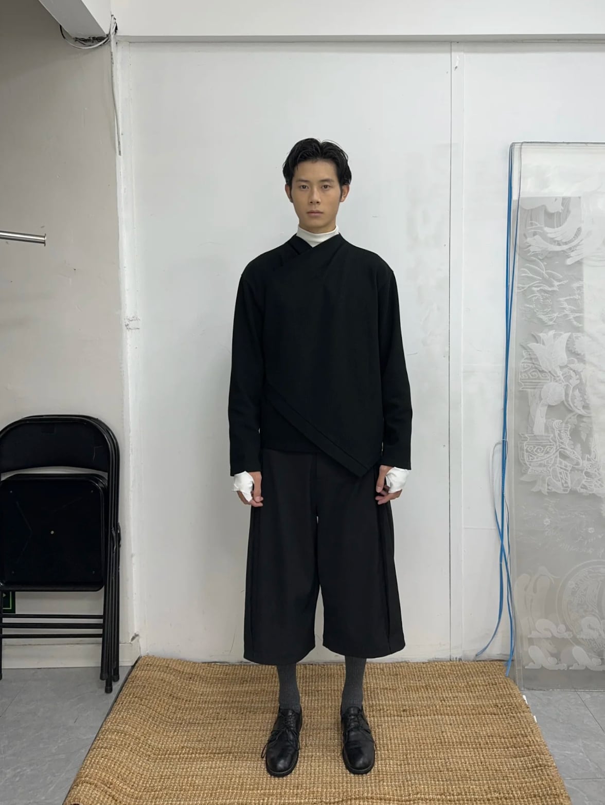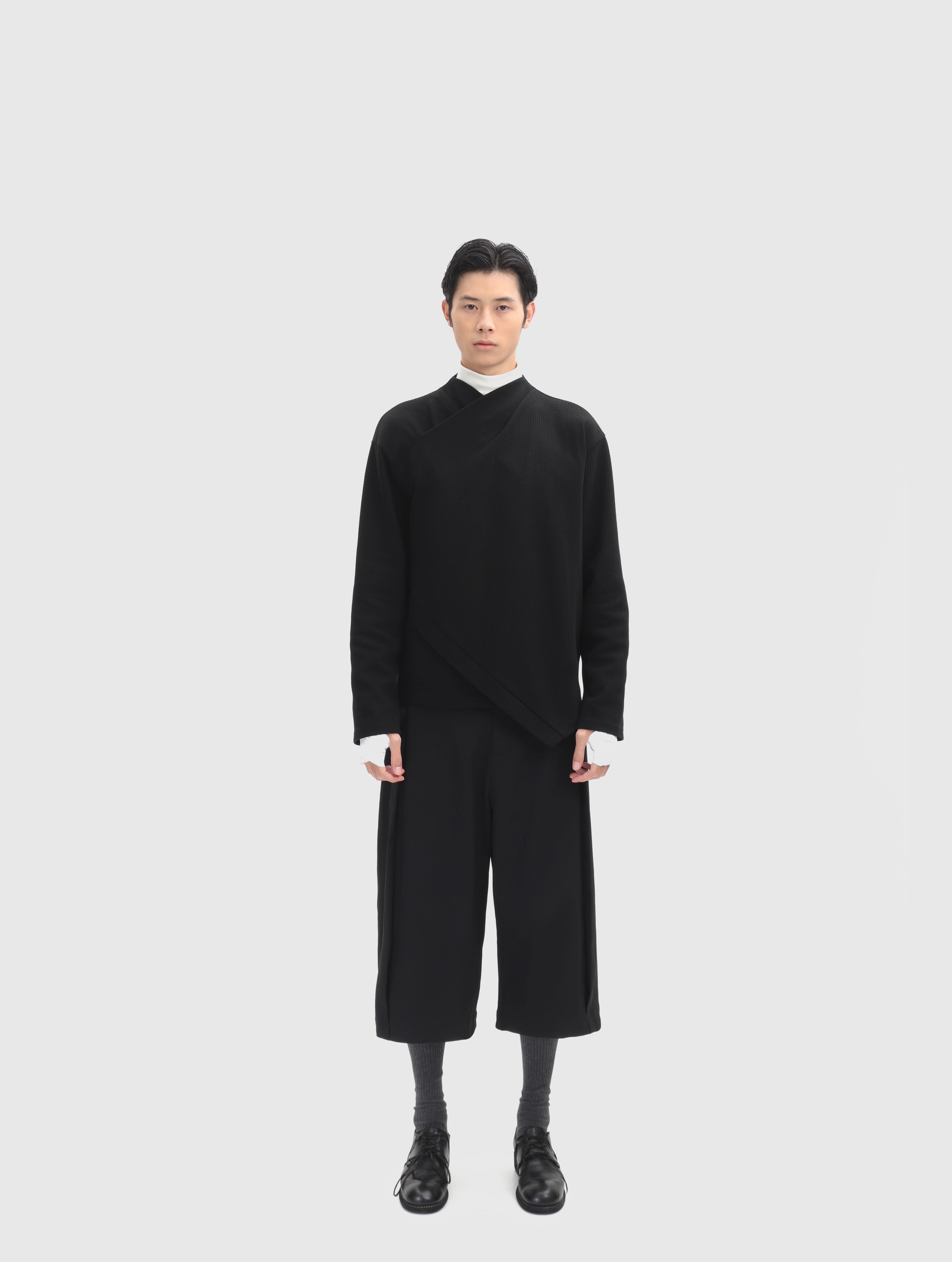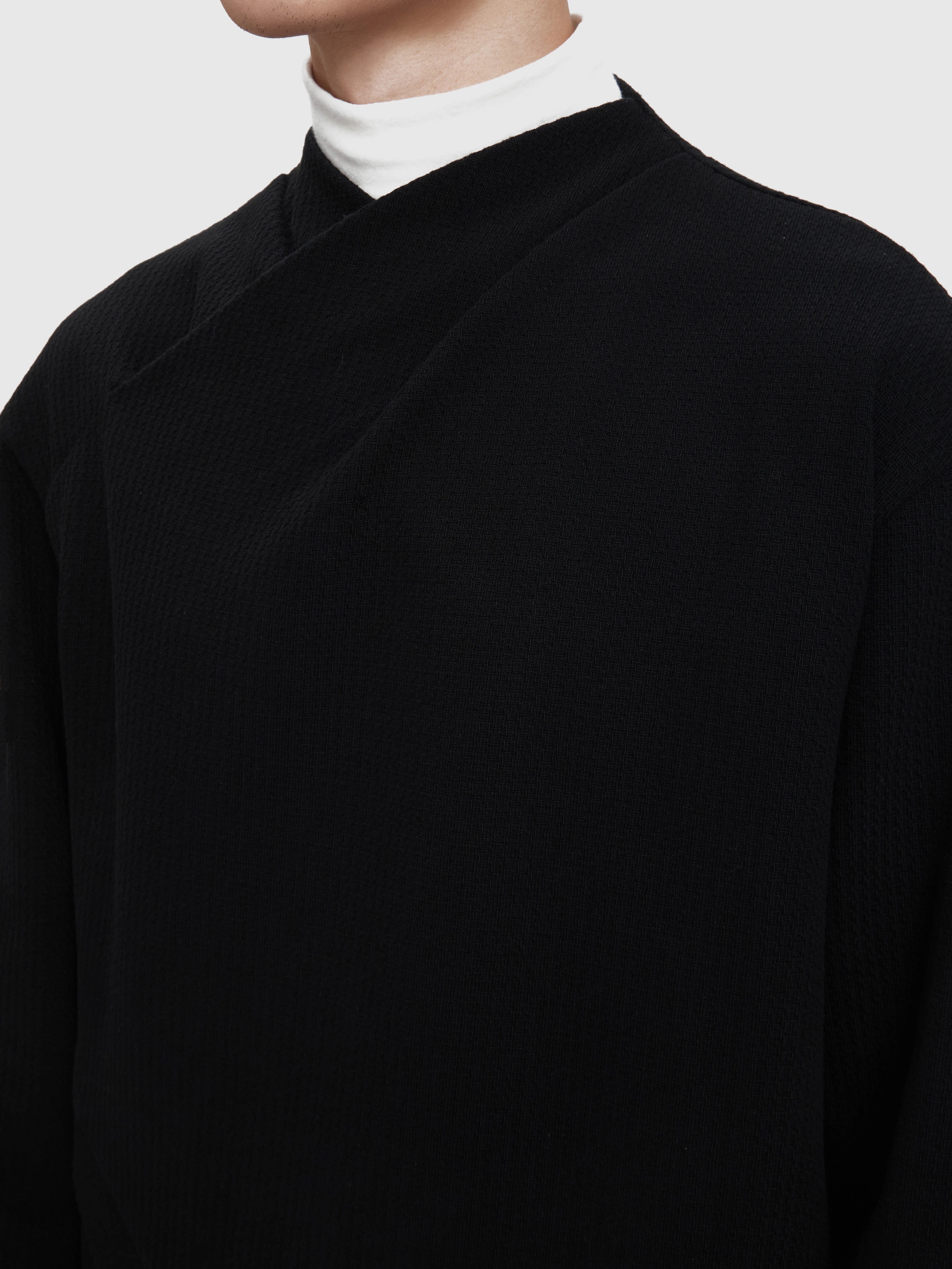首元には交差するようなユニークなデザインが施され、洗練された印象を与えます。