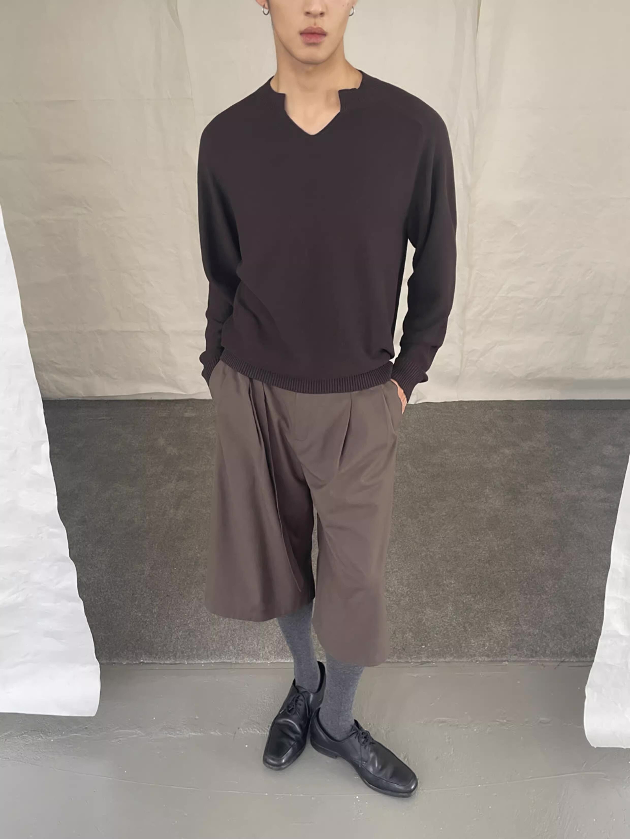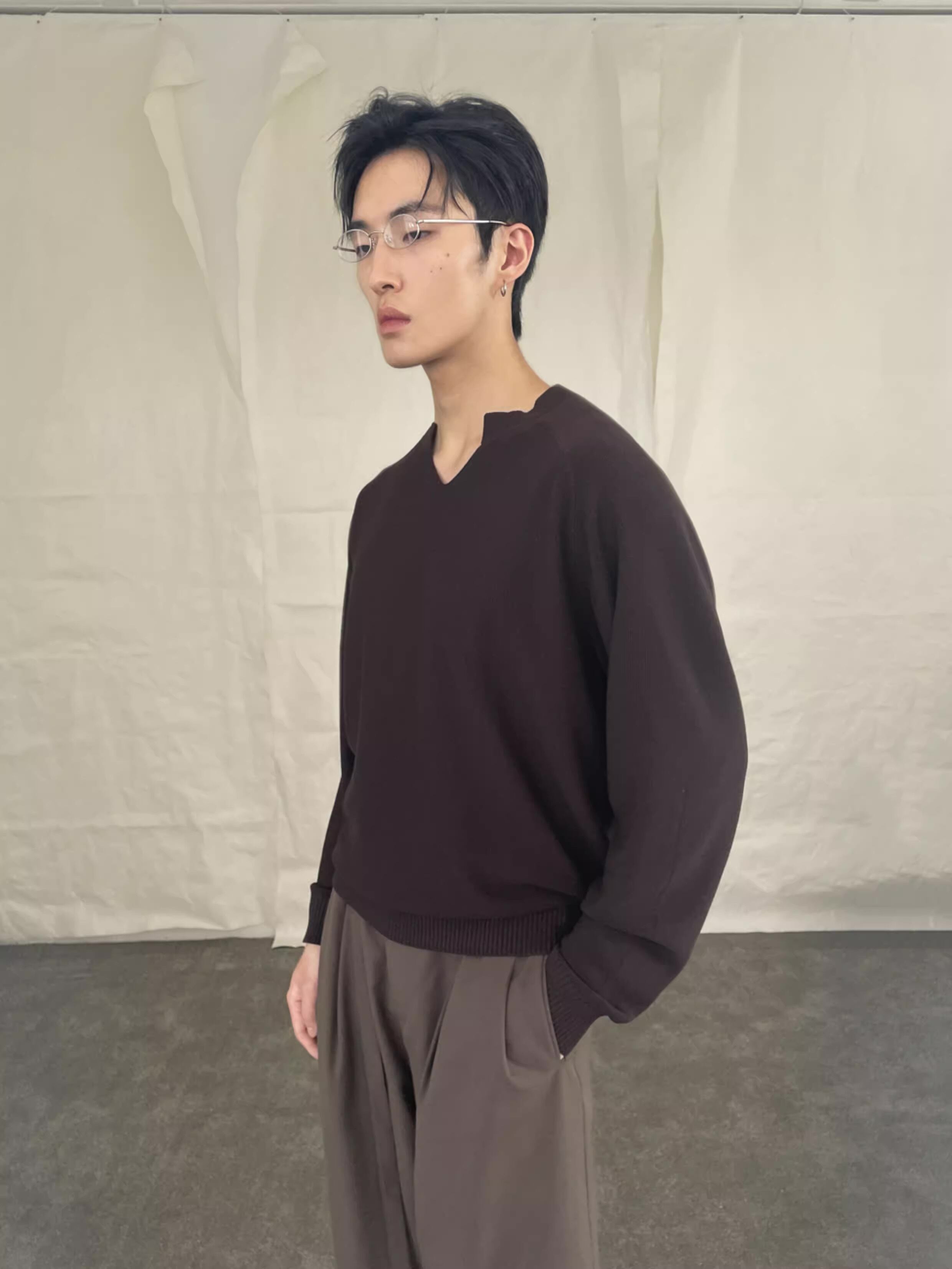 ユニークなアシンメトリーVネックが特徴的なセーター。