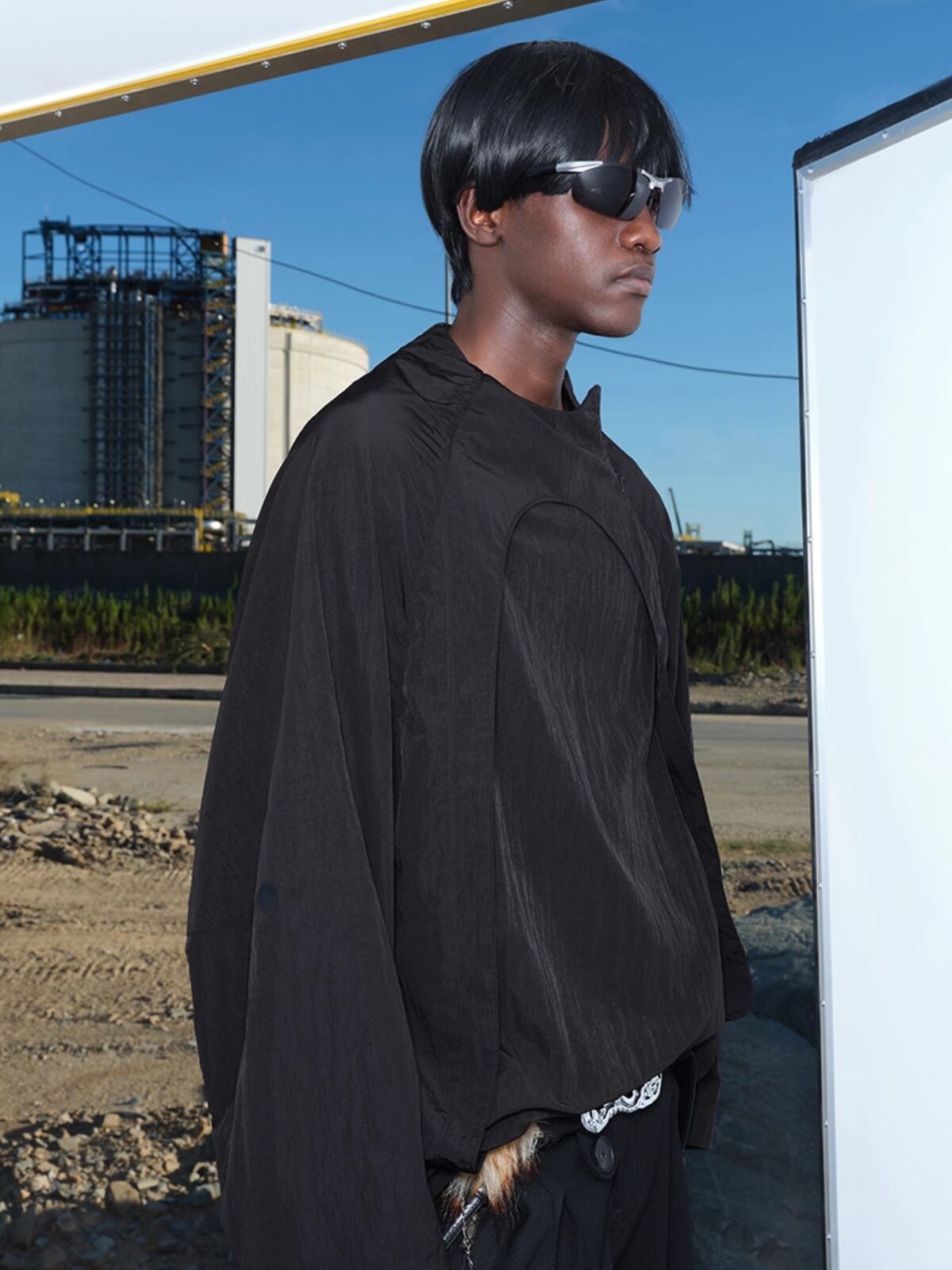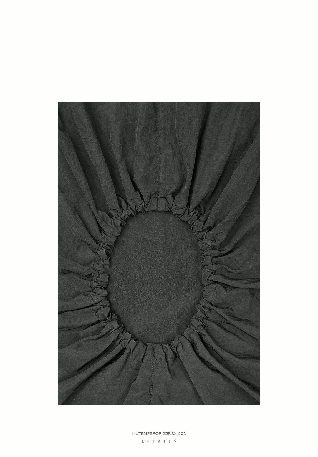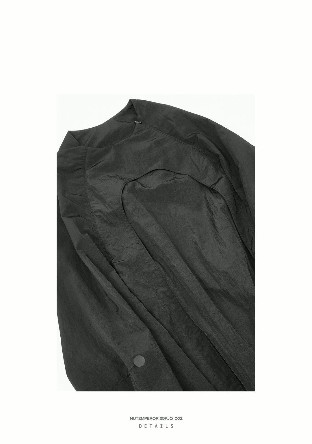 ゆったりとしたオーバーサイズのシルエットと、ポリエステル・ナイロン混紡のしなやかな生地が、ドレープ感のあるモードなスタイルを演出します。