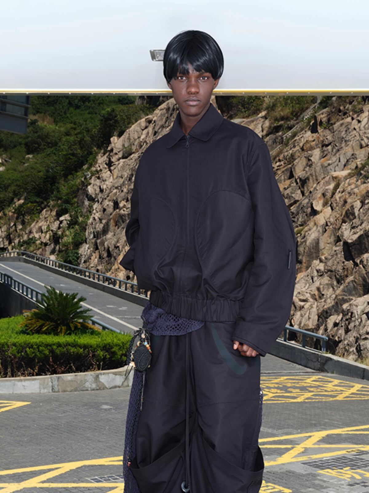 不規則なカッティングと立体的なディテールが際立つ、デザイン性の高いボンバージャケット。