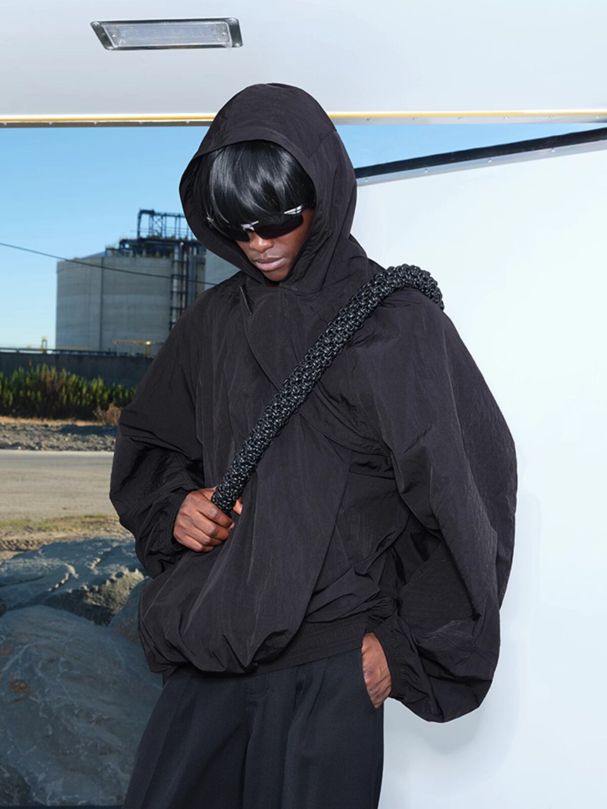 フードと一体型のネックデザインが、全体のモードな雰囲気を高めます。