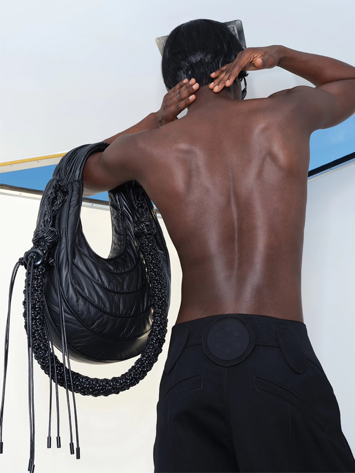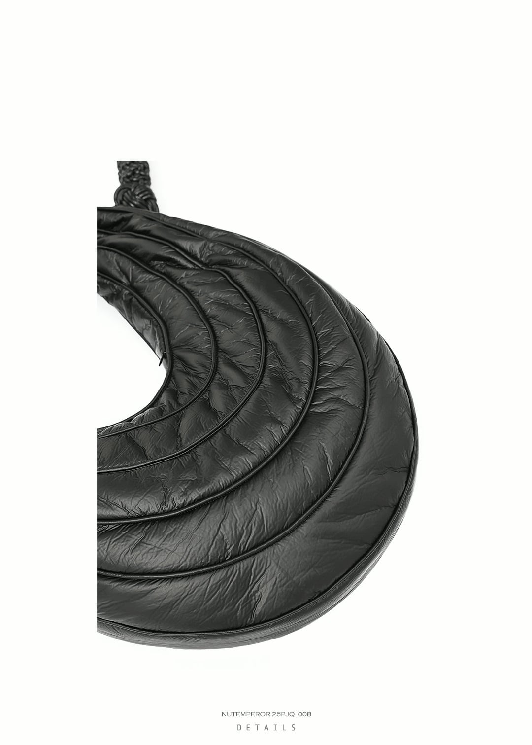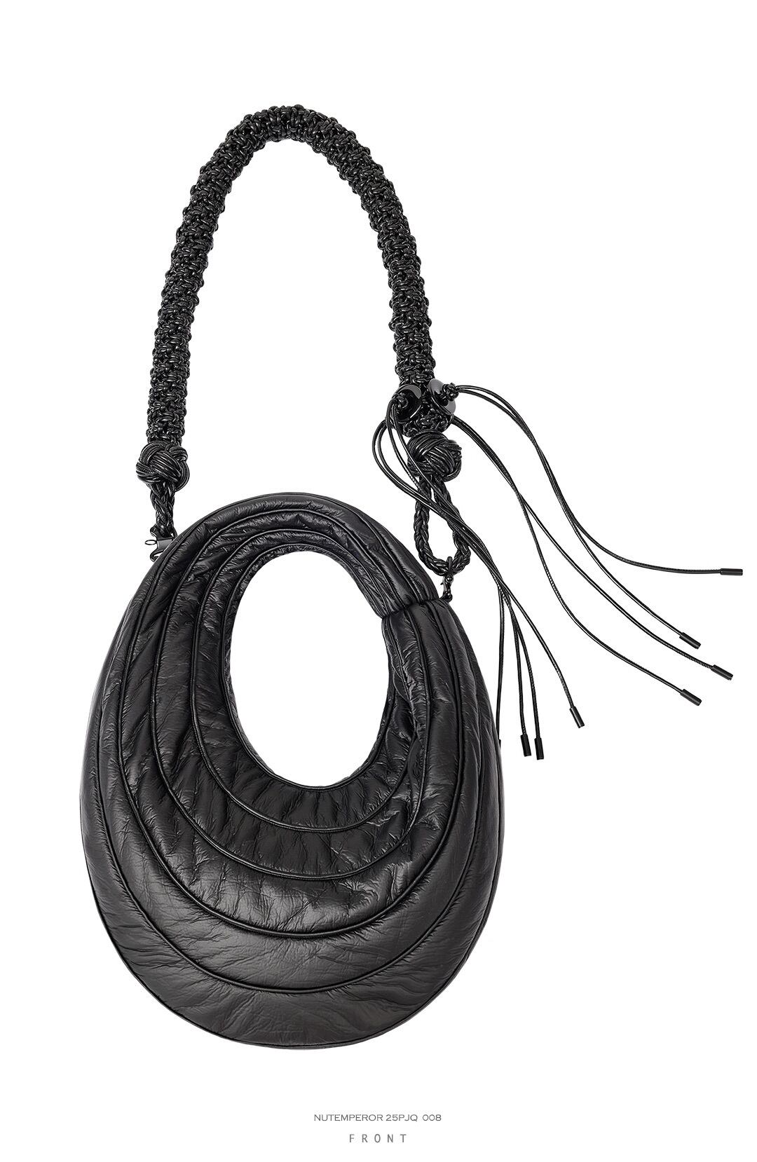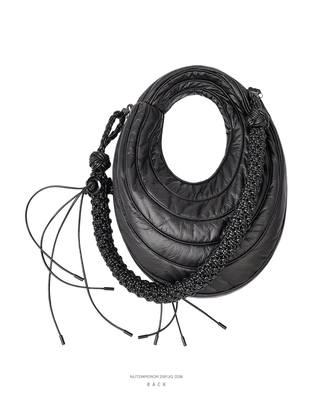 ユニークな三日月型とキルティング加工が目を引くショルダーバッグ。
