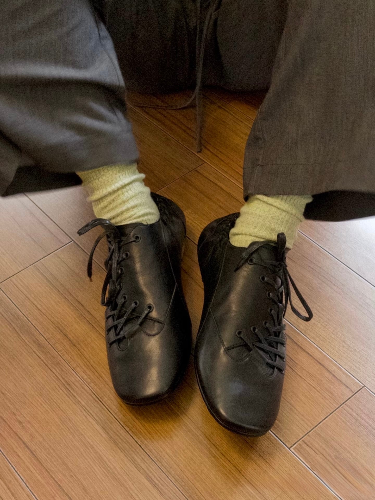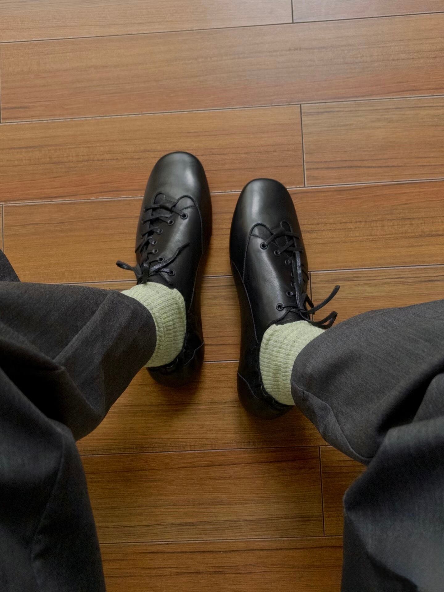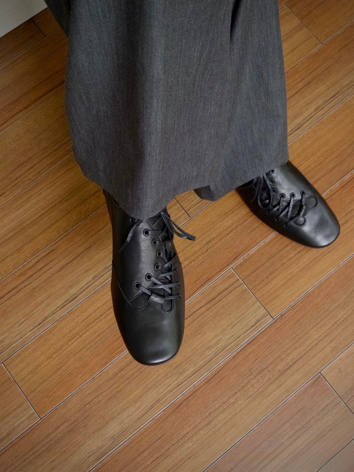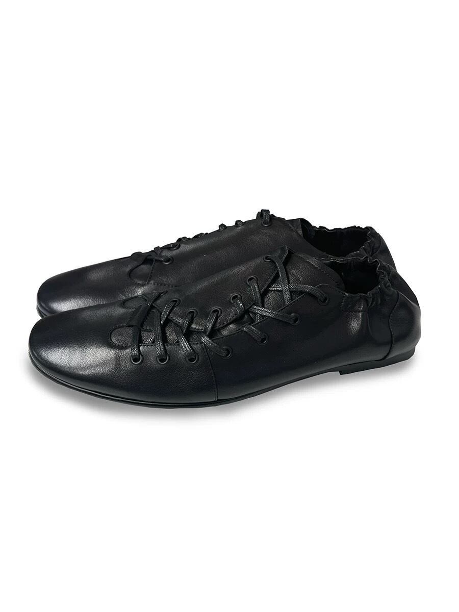 斜めにデザインされたシューレースと、かかと部分のギャザーデザインが、シンプルながらも個性的なスタイルを演出。