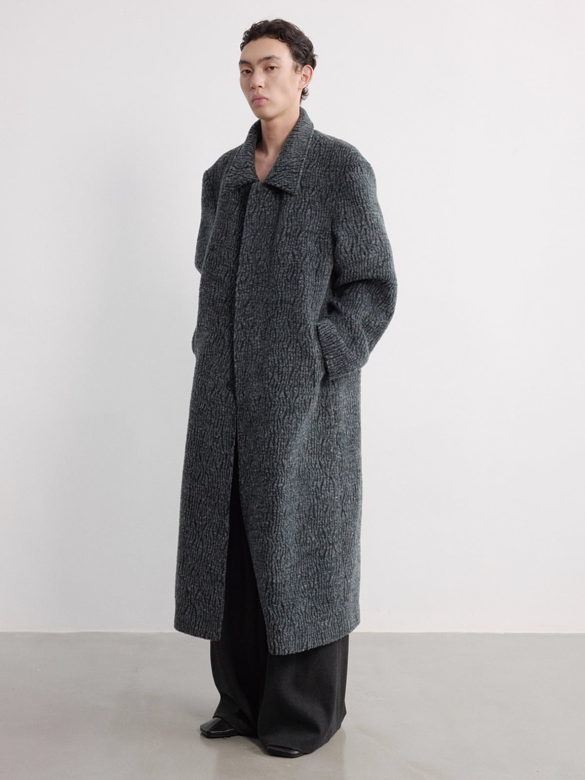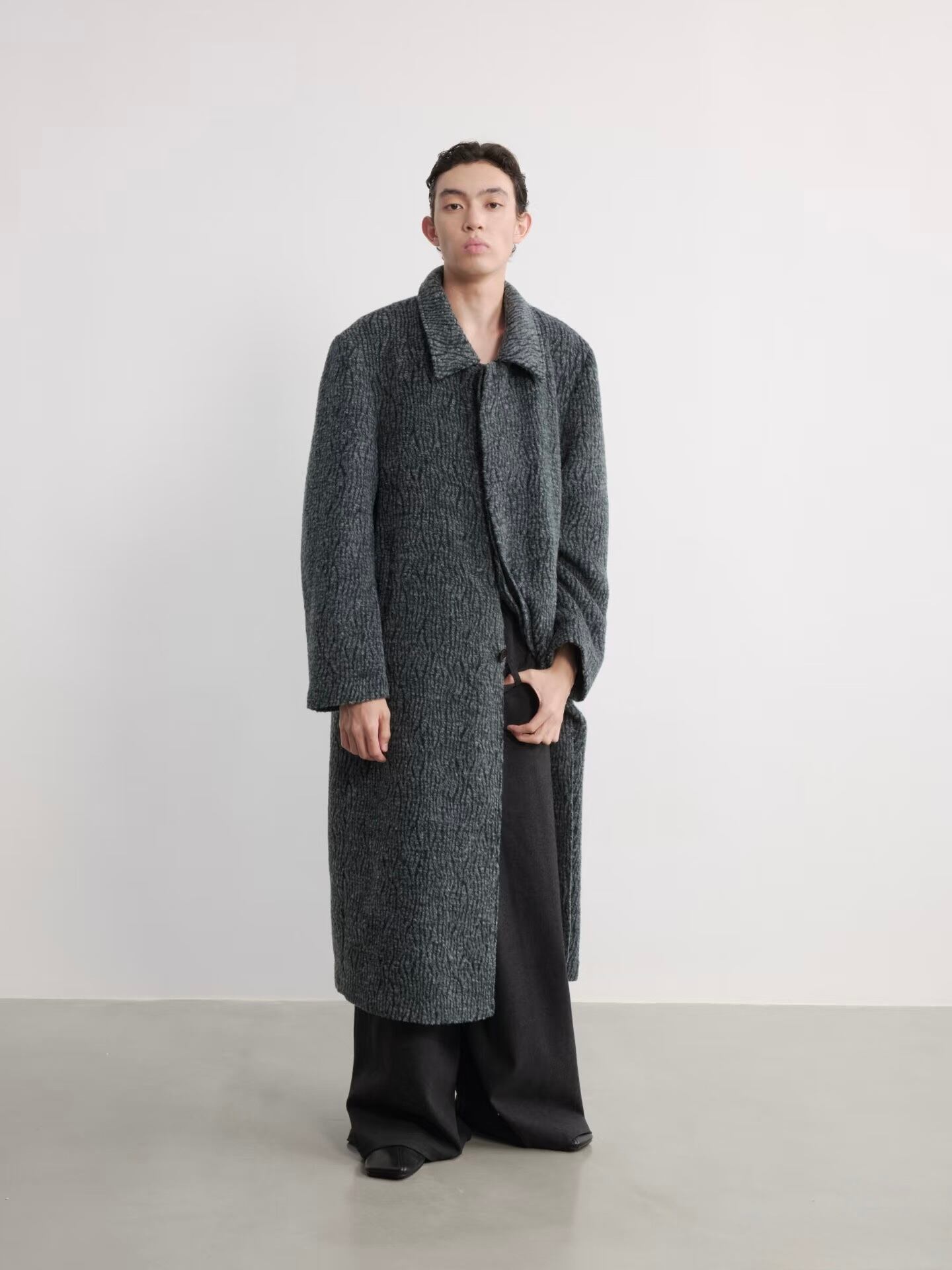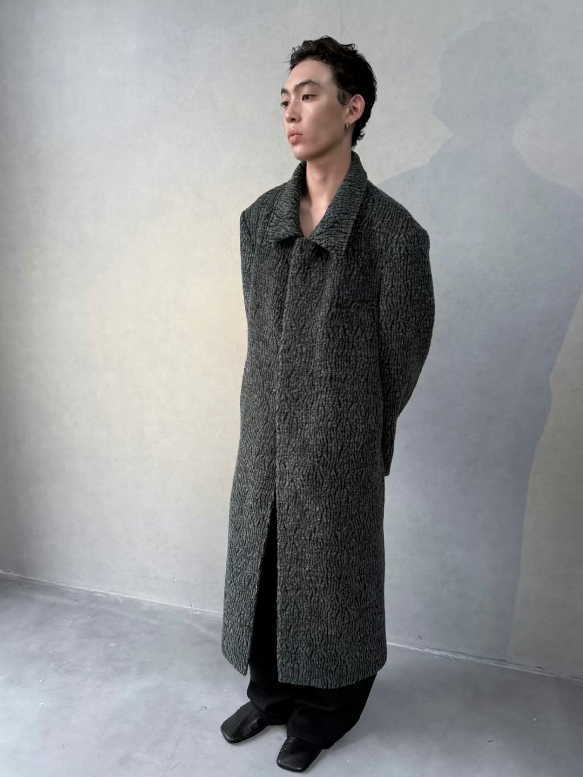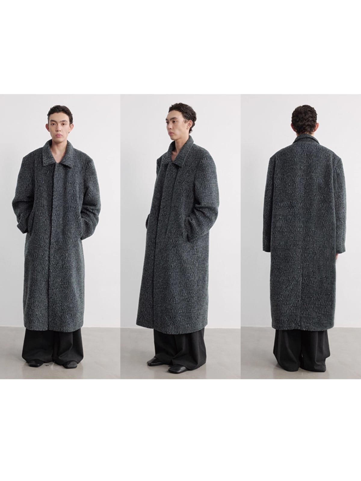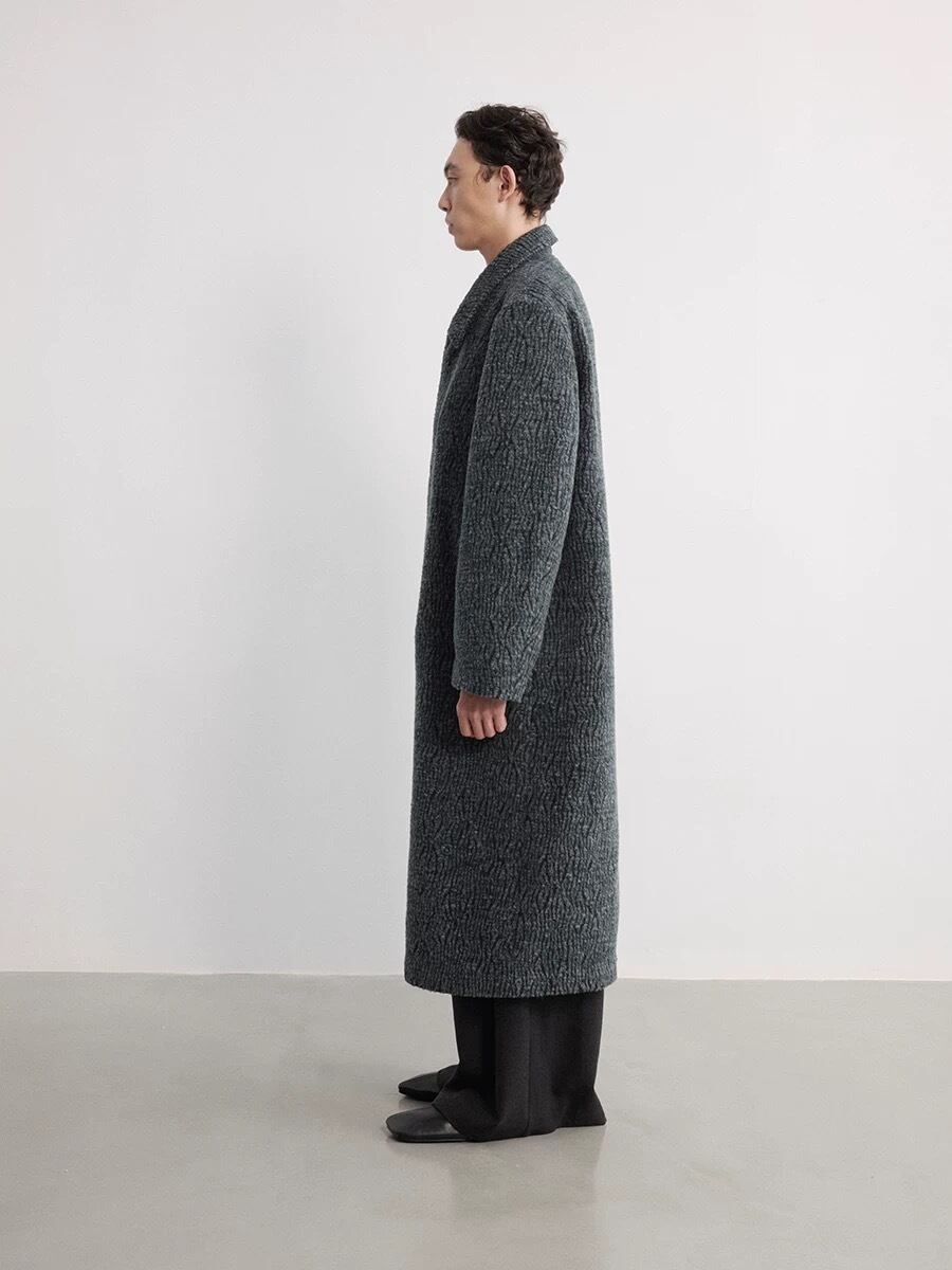 襟元は折り返して着用する**ステンカラー(関門領)**デザインで、ゆったりとしたシルエットがモダンで洗練されたスタイルを構築します。
