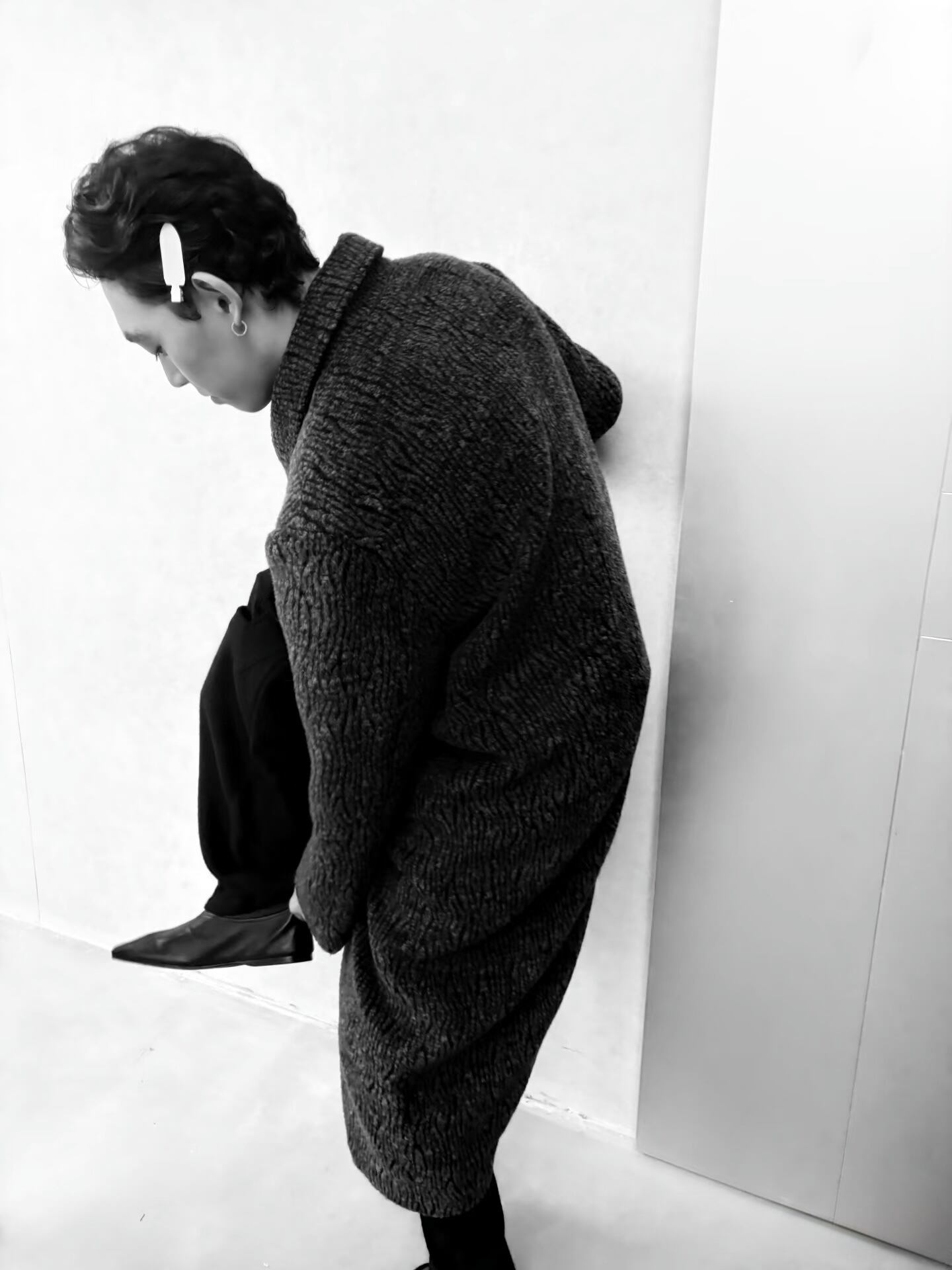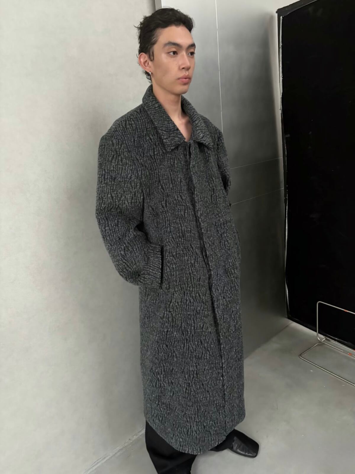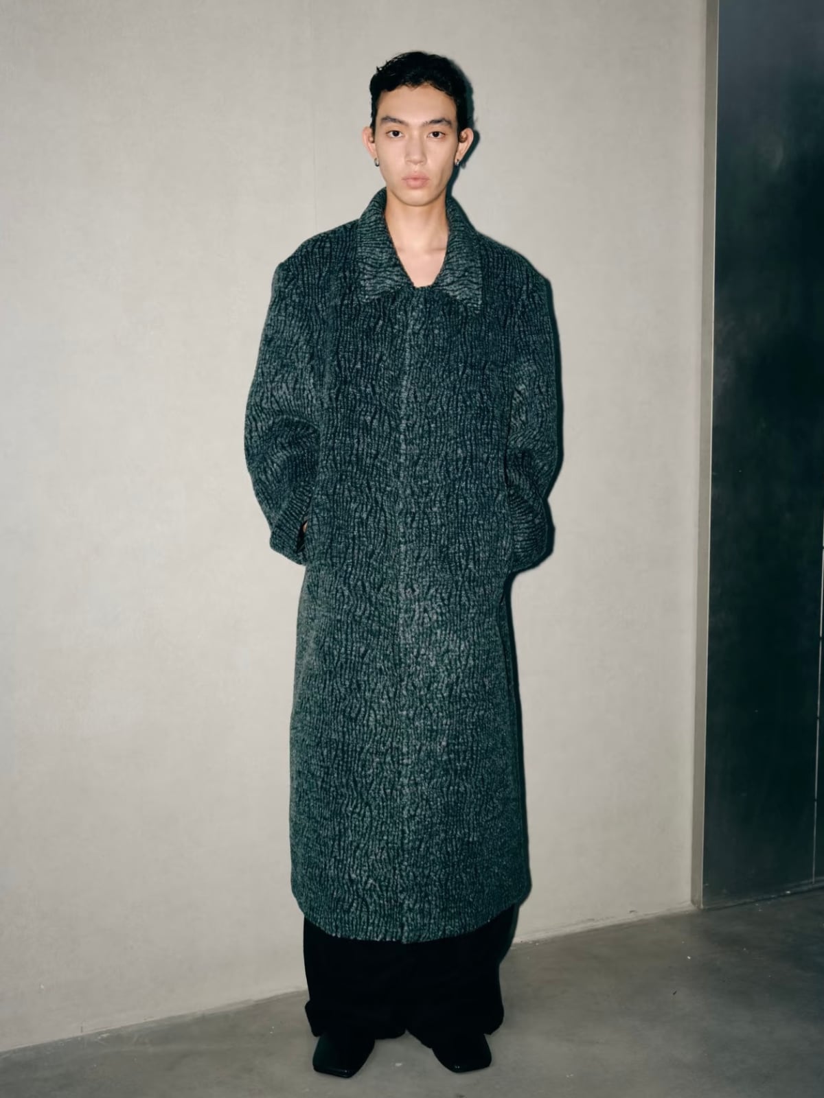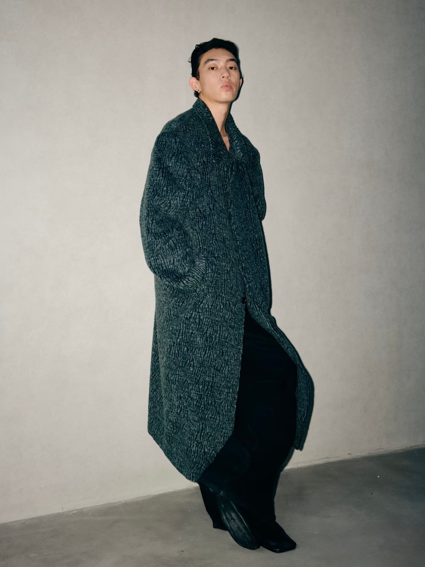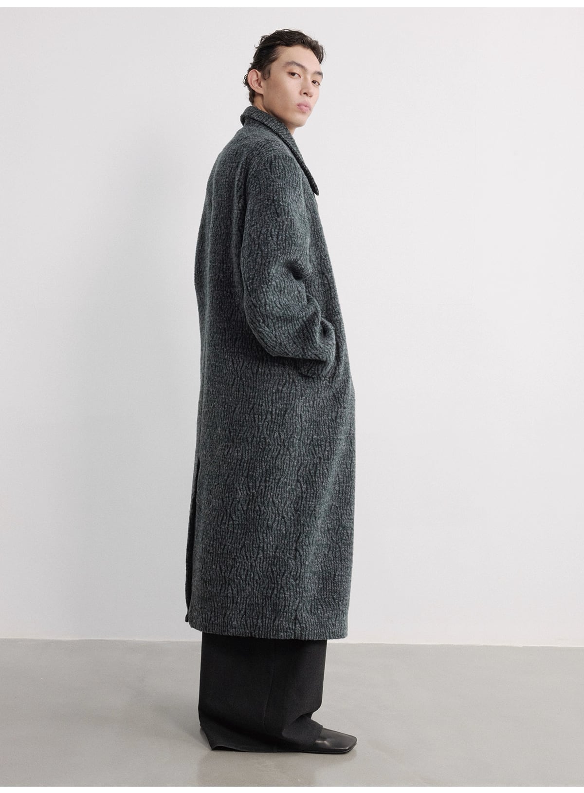 襟元は折り返して着用する**ステンカラー(関門領)**デザインで、ゆったりとしたシルエットがモダンで洗練されたスタイルを構築します。