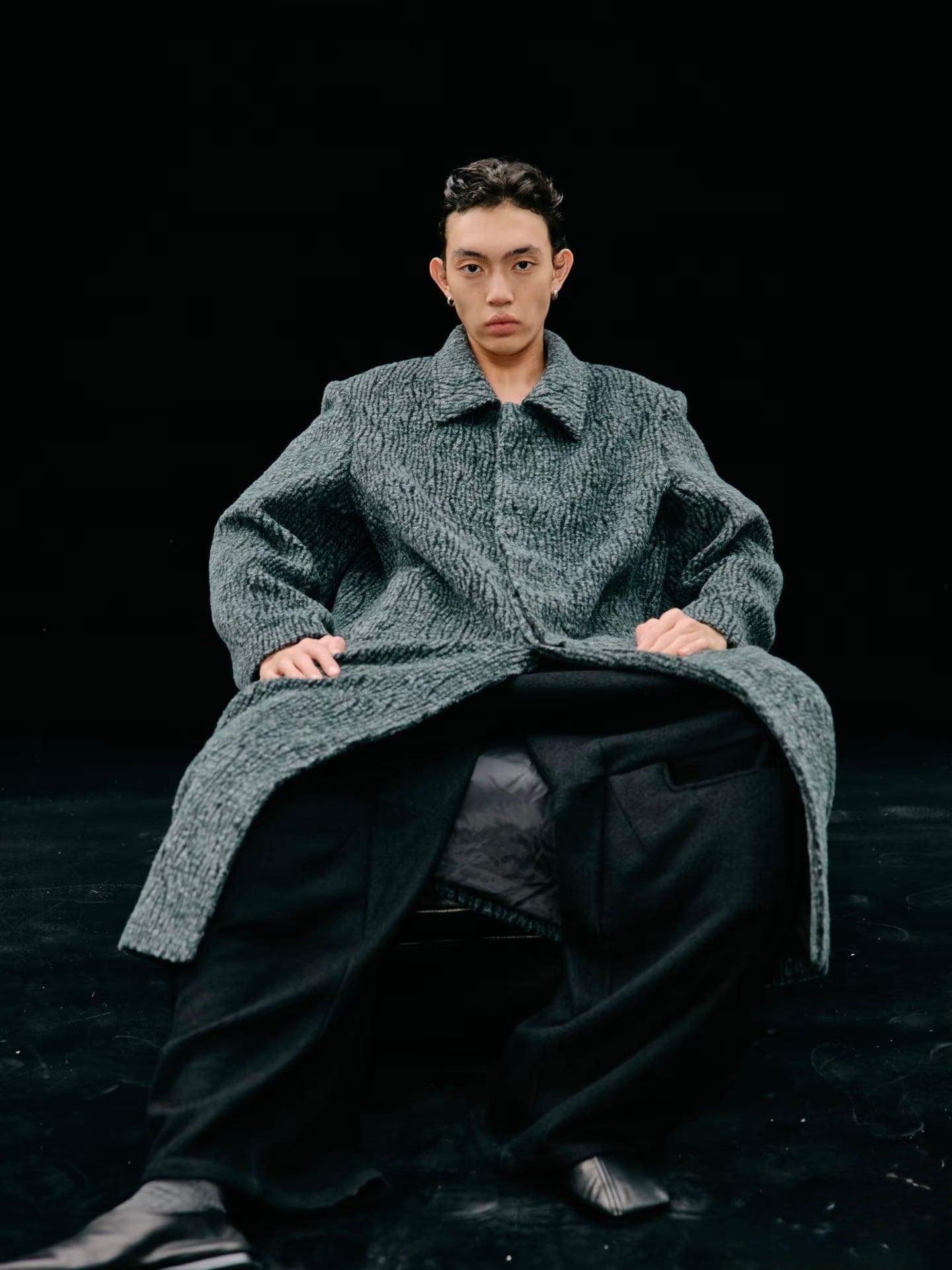 ブラックとグリーンが織り交ぜられた苔のような独特な生地のテクスチャーが、深い奥行きと高級感を演出します。