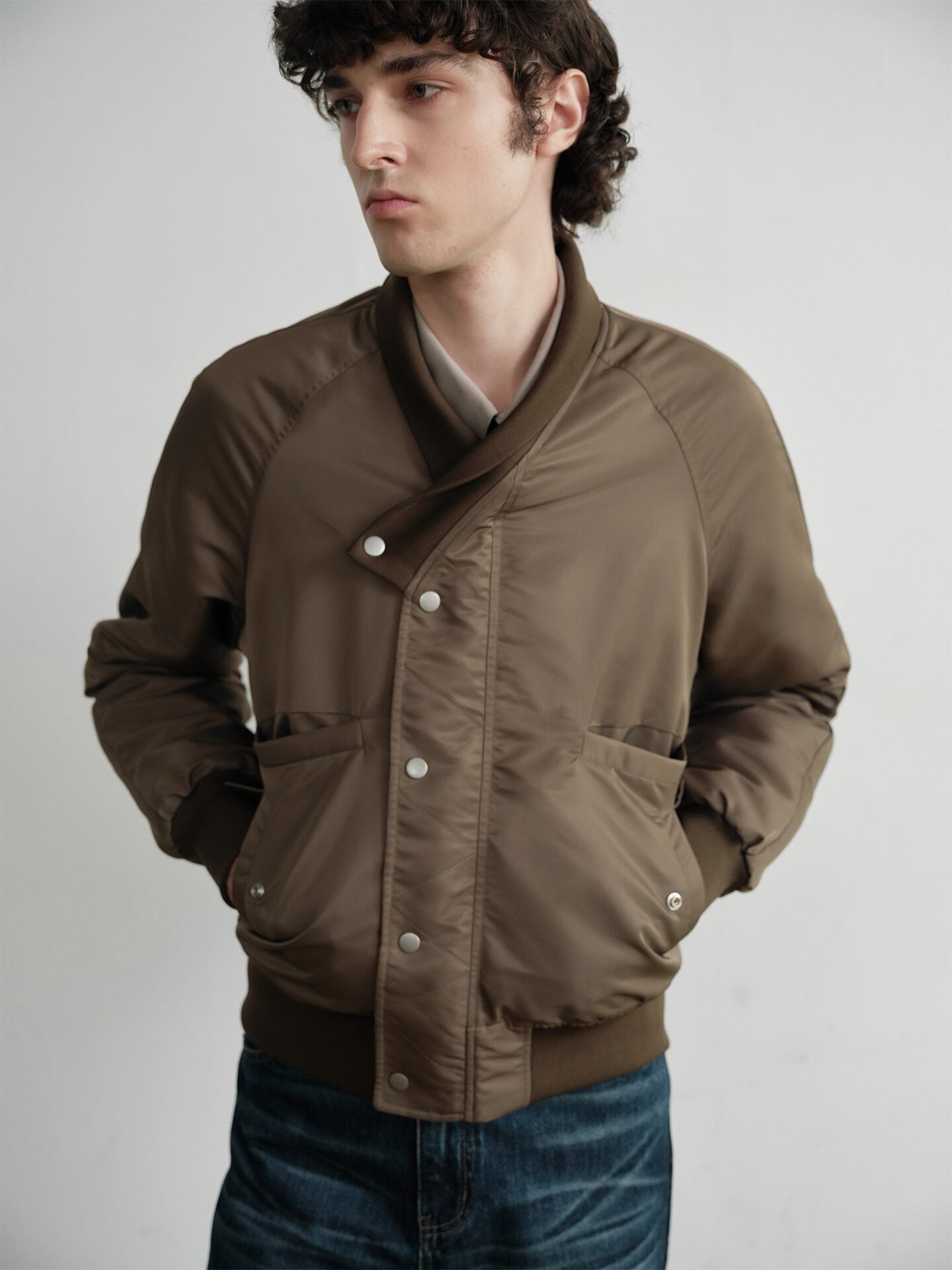 ナイロン100%の生地を使用した、軽くて保温性の高いボンバージャケット。