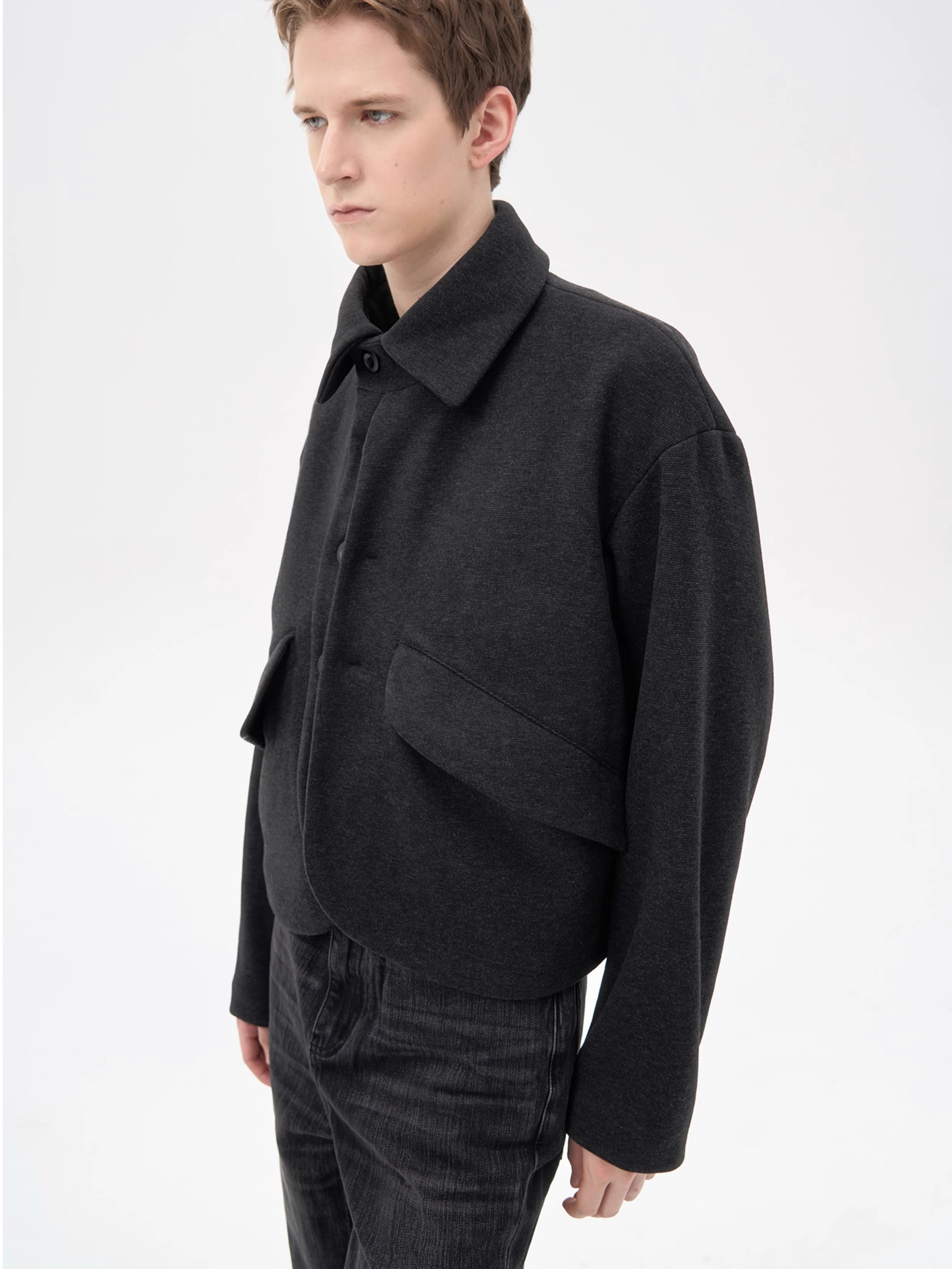 非対称なカッティングとカーブした襟のデザインが、着用時に立体的なシルエットを構築します。袖は動きやすい**カーブスリーブ(彎刀袖)**を採用。