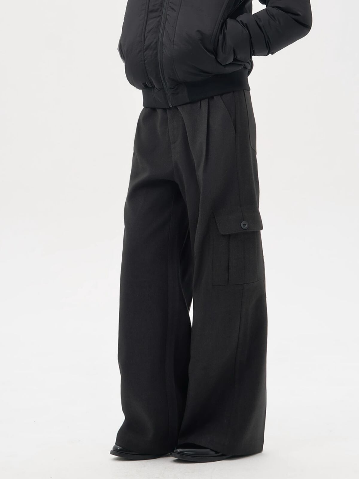 ウール混紡生地を使用し、重厚感のある素材が美しいドレープと立体感を両立したワイドパンツ。裾に向かって大胆に広がるAラインの扇形シルエットが特徴的です。
