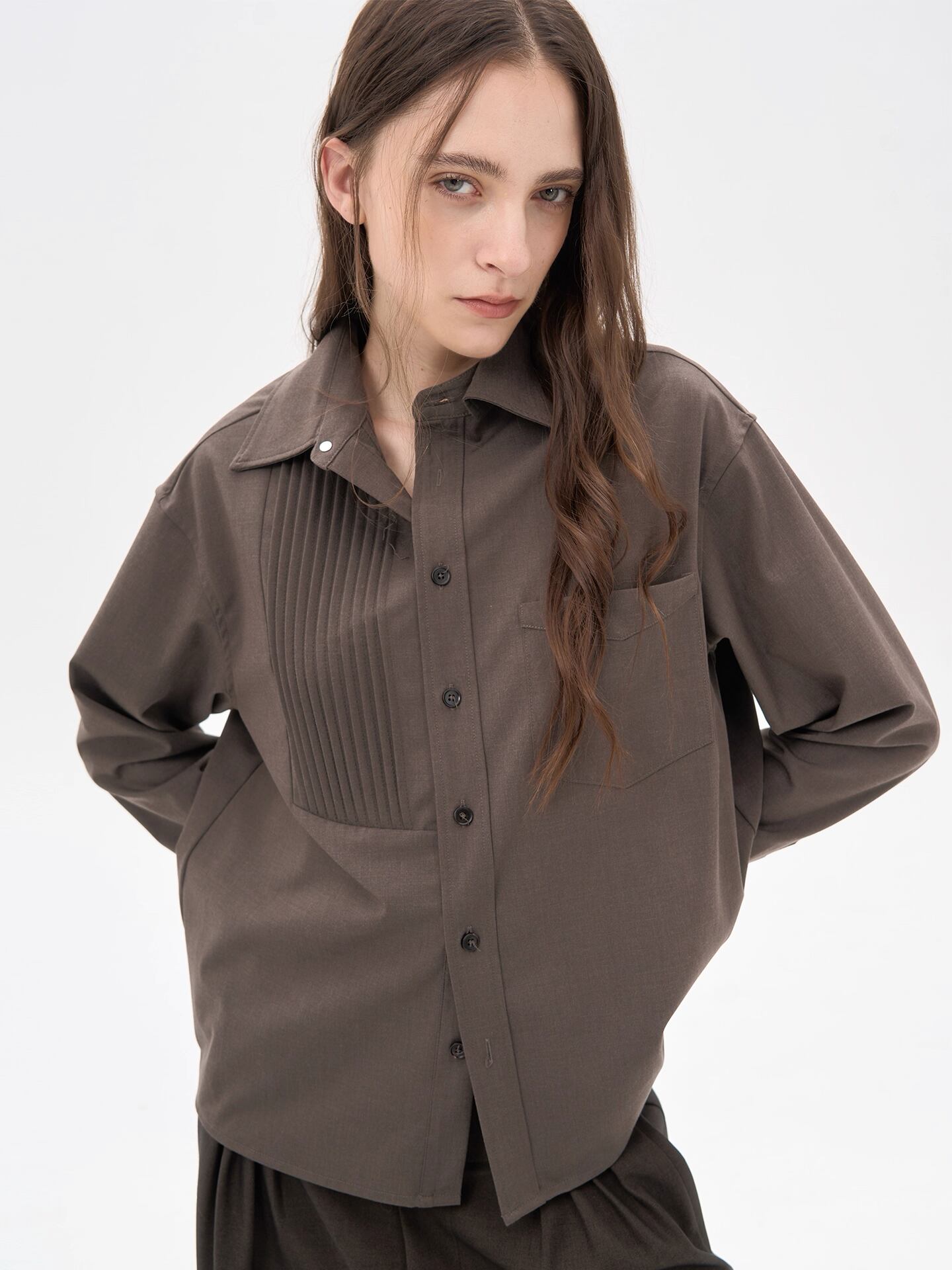 全体にプリーツ加工を施すことで、シワになりにくい構築的なシルエットを保ちます。