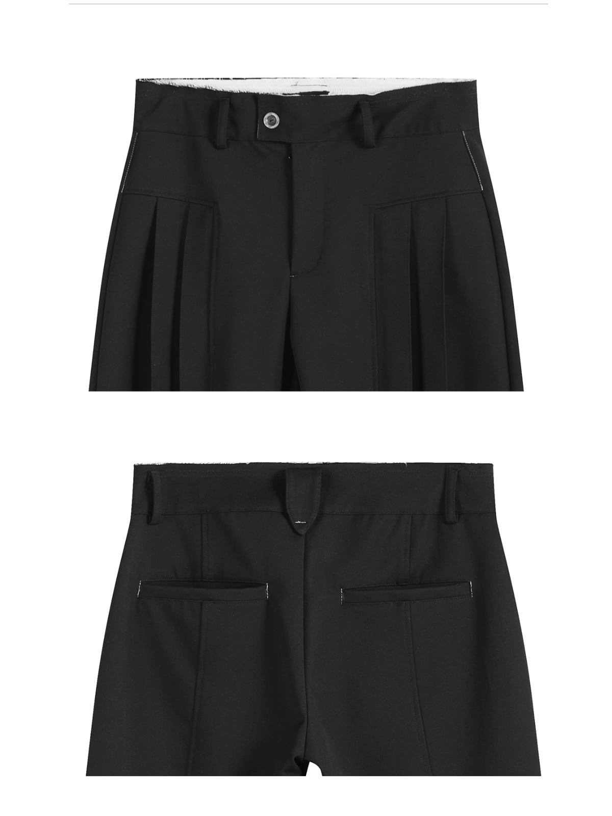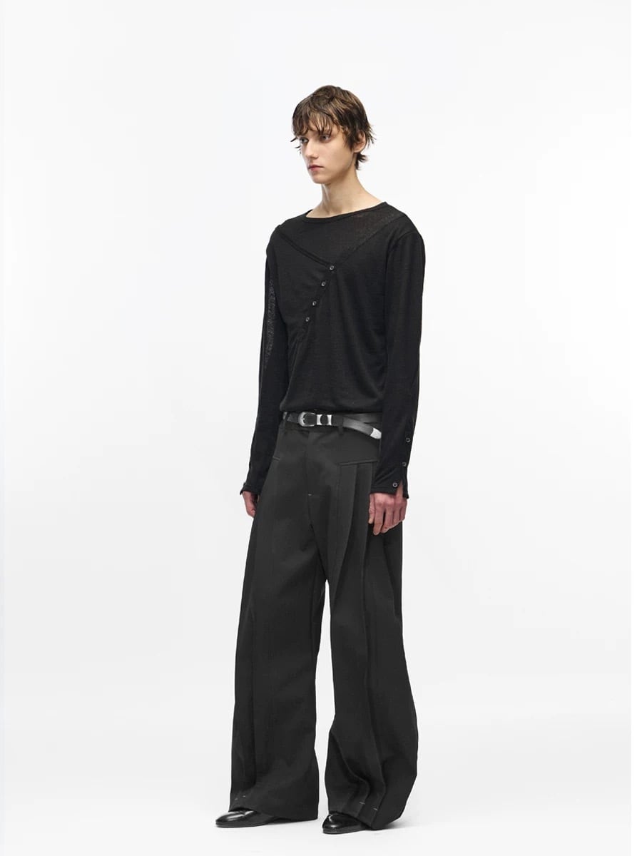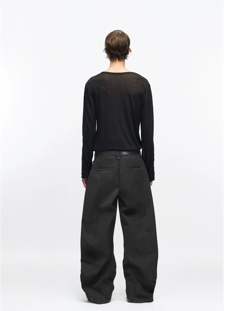 ポリエステルとコットンをブレンドした複合素材を使用し、柔らかな肌触りと微弾力性を兼備。サイドに深く入った**曲線状の切り替え(彎刀)**と、裾に向かって広がる大胆なワイドシルエットが、着用時に立体的なボリュームを構築します。