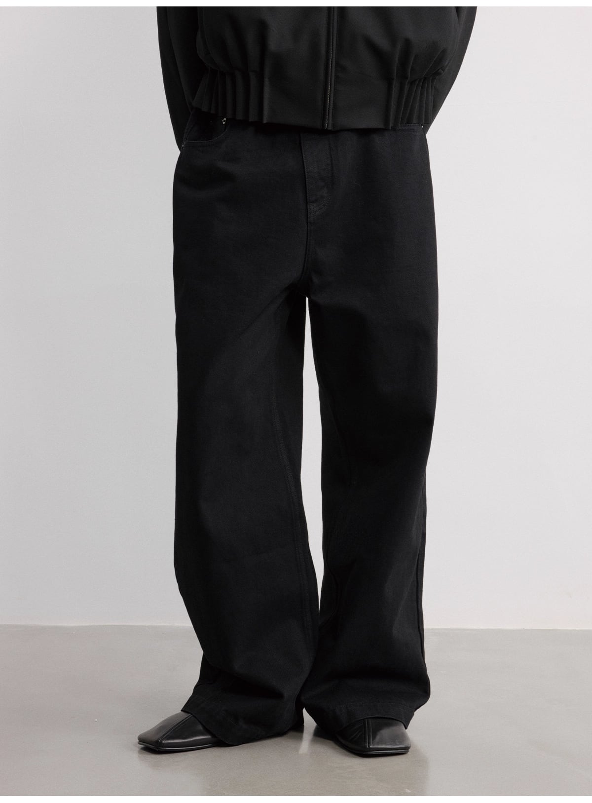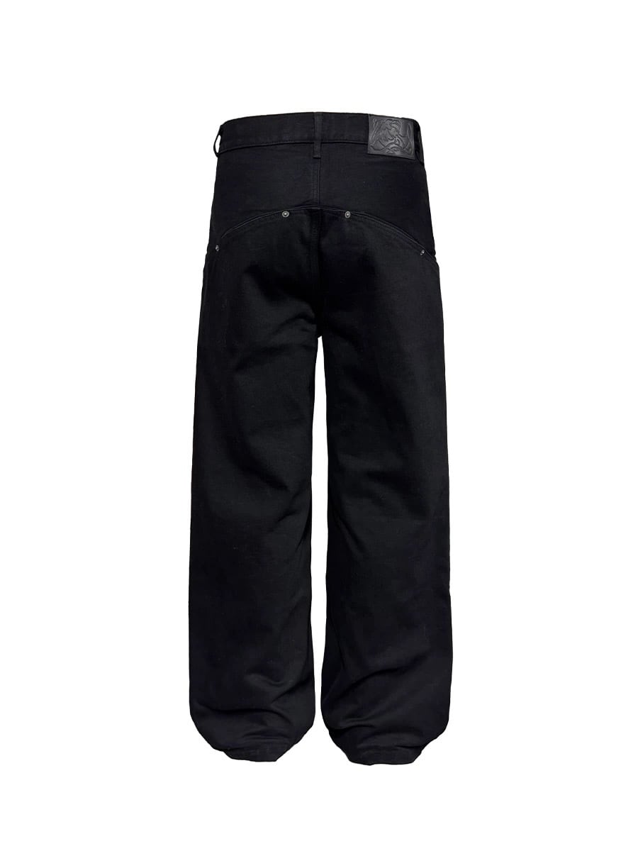 14.5オンスの重厚なブラックデニムは、綿の柔らかな肌触りとポリエステルの強度を融合させたハイブリッドな素材感。