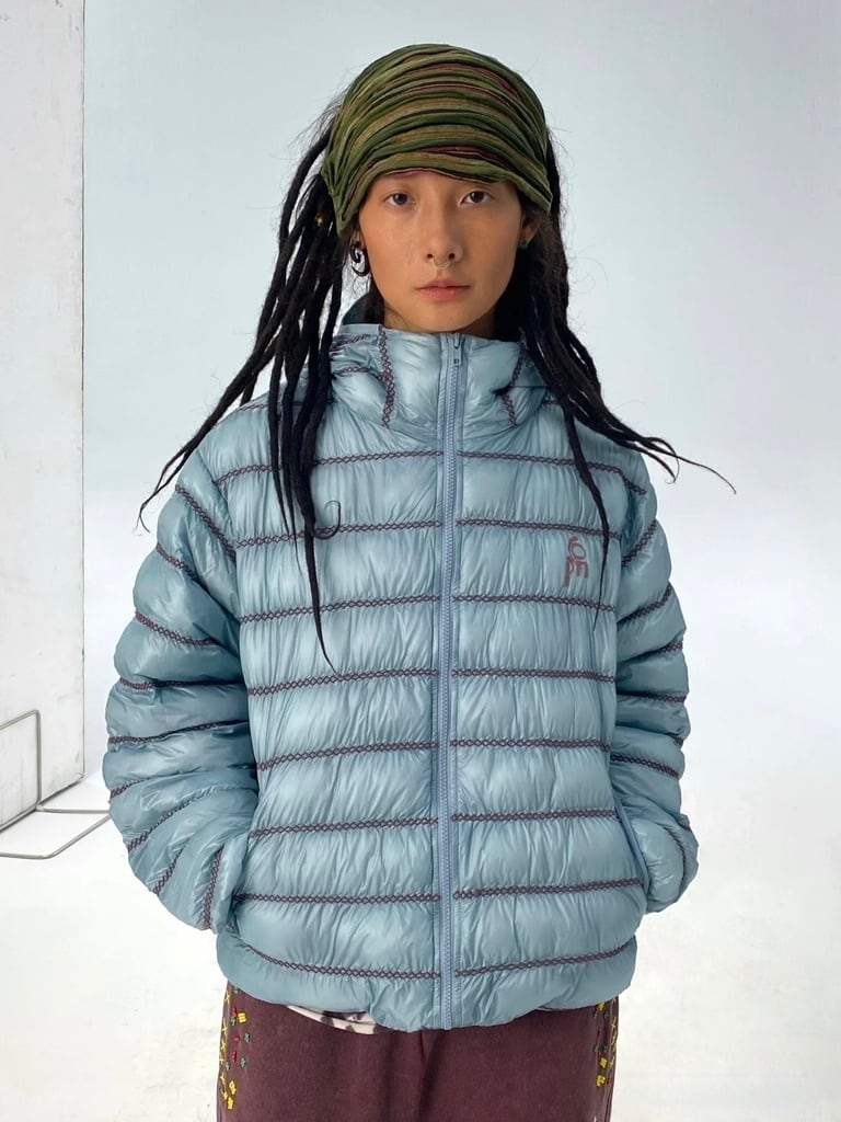 全体に施されたキルティングと、フロントのミニマルなジップデザインが、主張しすぎないクリーンなモード感を醸し出します。