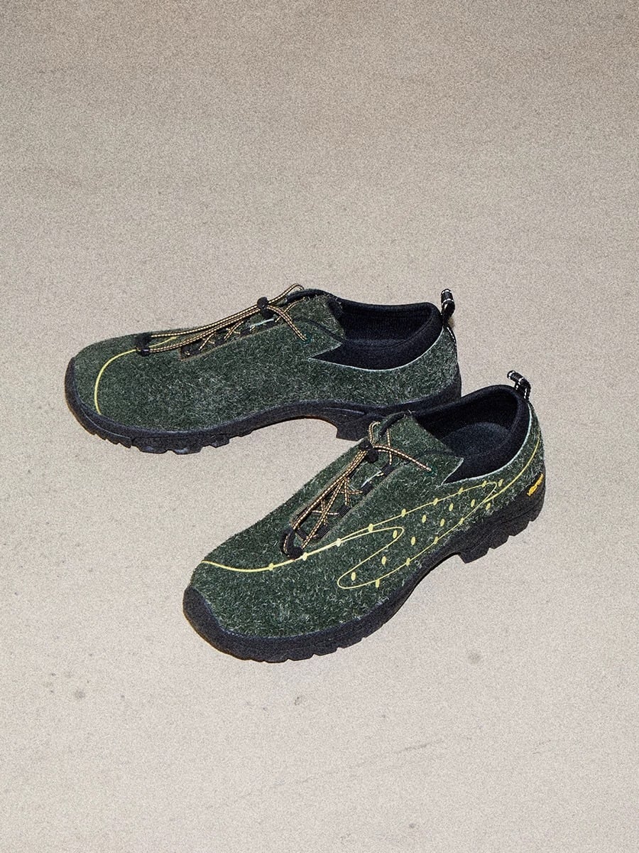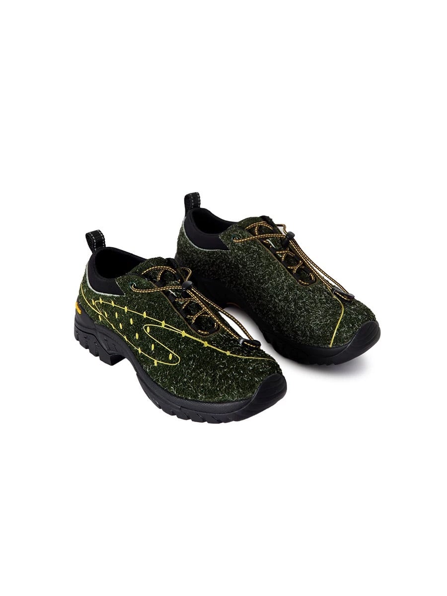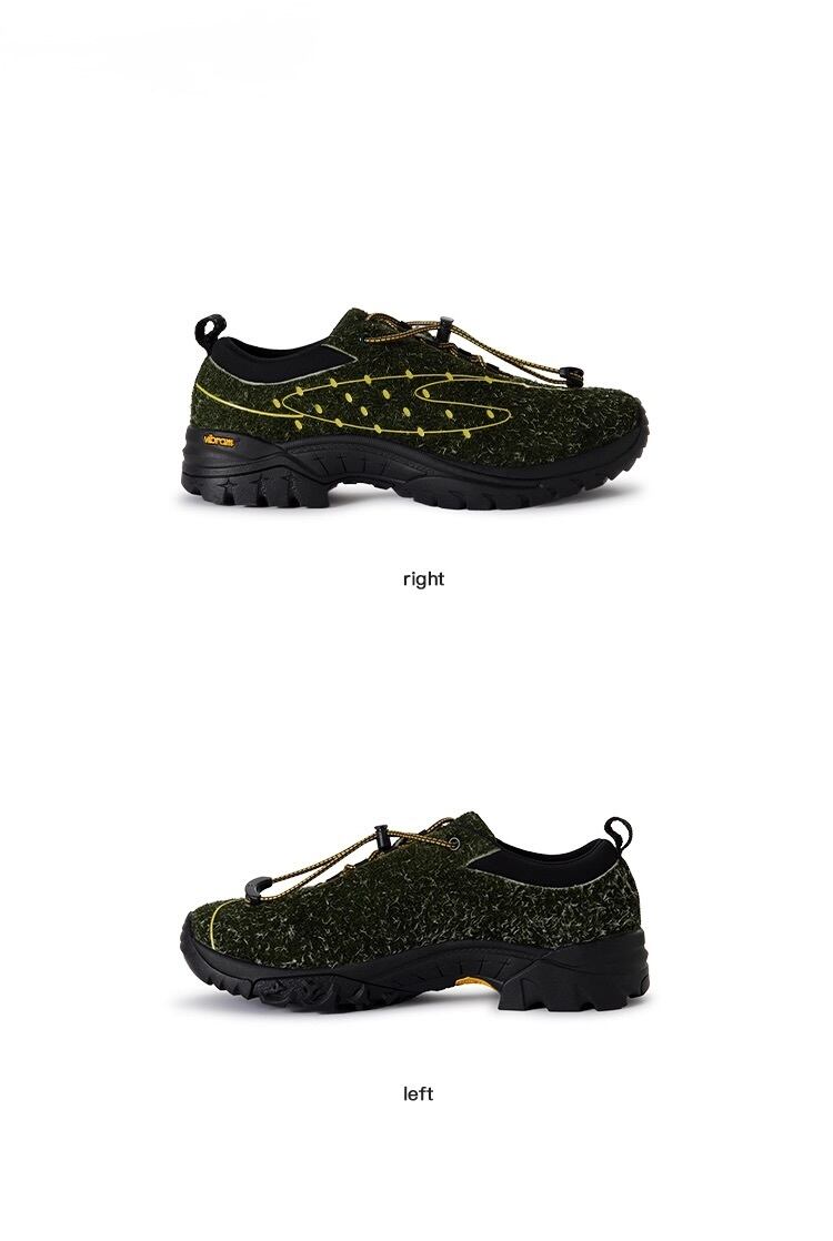 苔(モス)のような深いグリーンが特徴的なこのスニーカーは、トレッキングシューズのタフな機能性を持ちながら、ファッションスニーカーとしての高いデザイン性を融合させています。