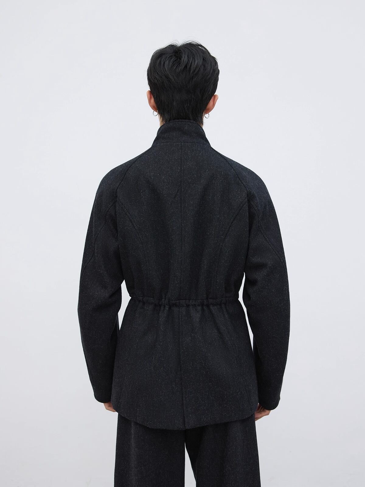 Vネックの襟元と複数のポケットデザインが、洗練されたカジュアルスタイルを構築します。背中にはセンターベントが設けられ、動きやすさも確保。