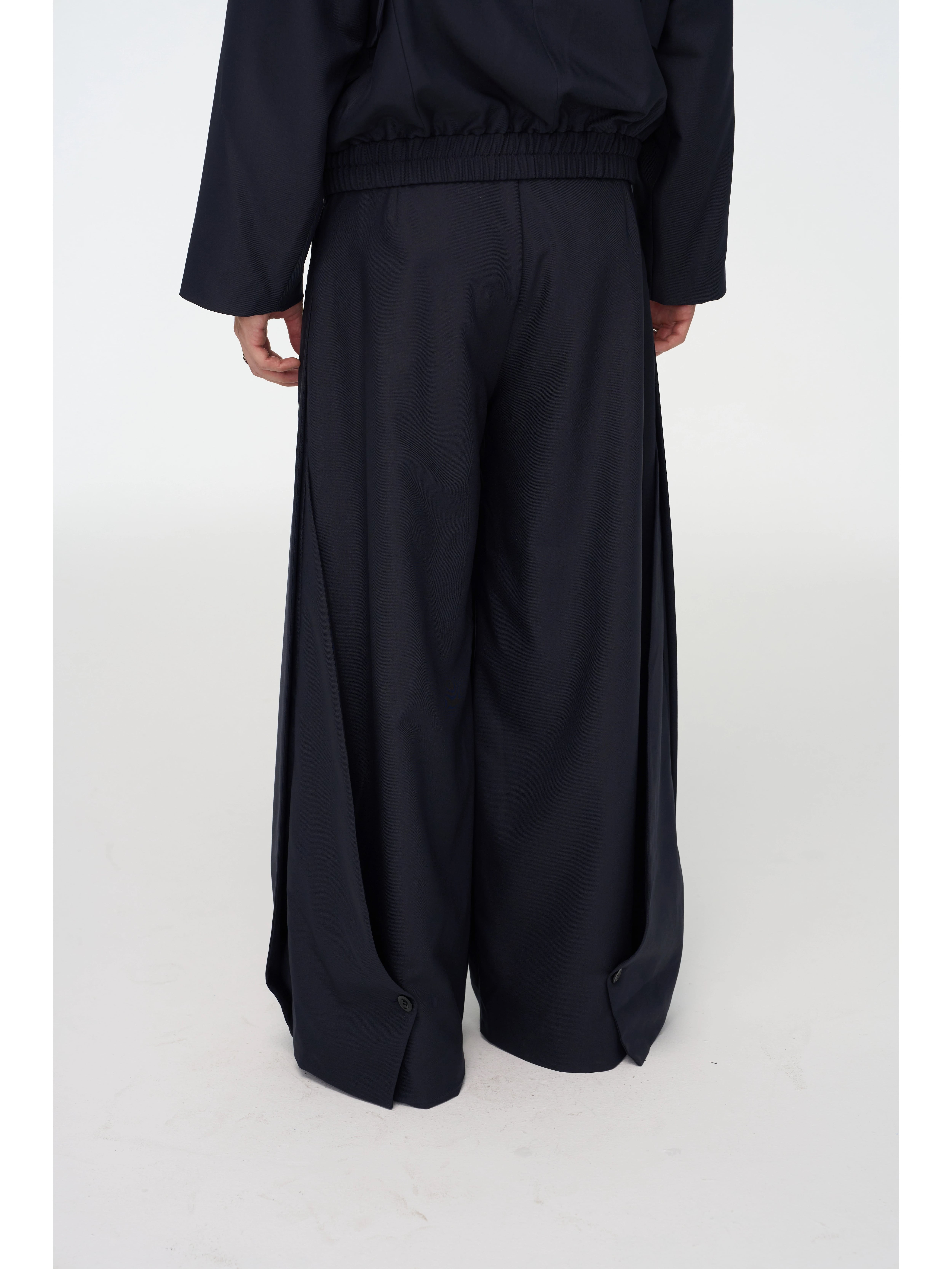 ポリエステル80%、レーヨン17%、スパンデックス3%からなる新型のポリエステル繊維生地を採用したワイドパンツです。