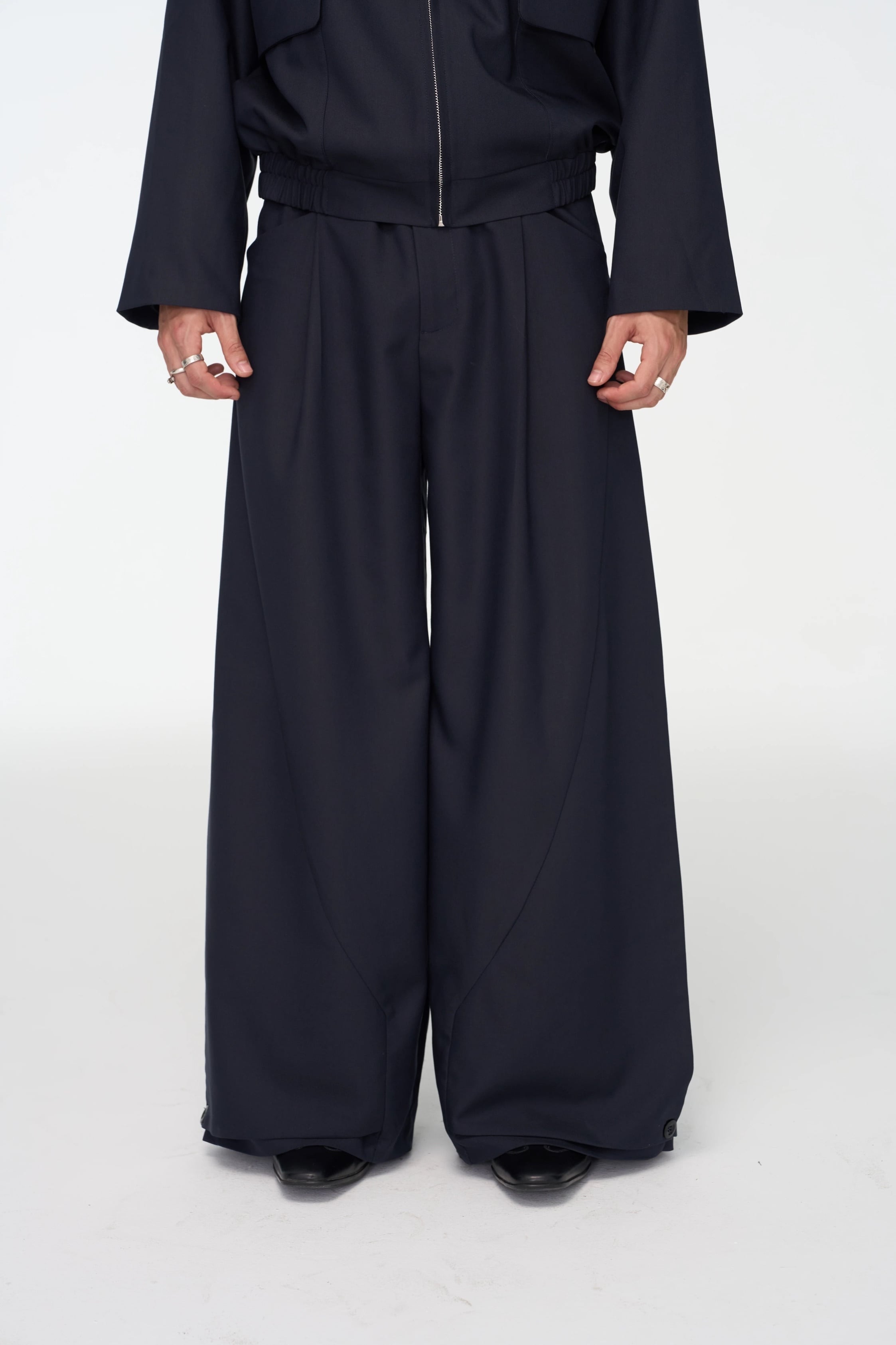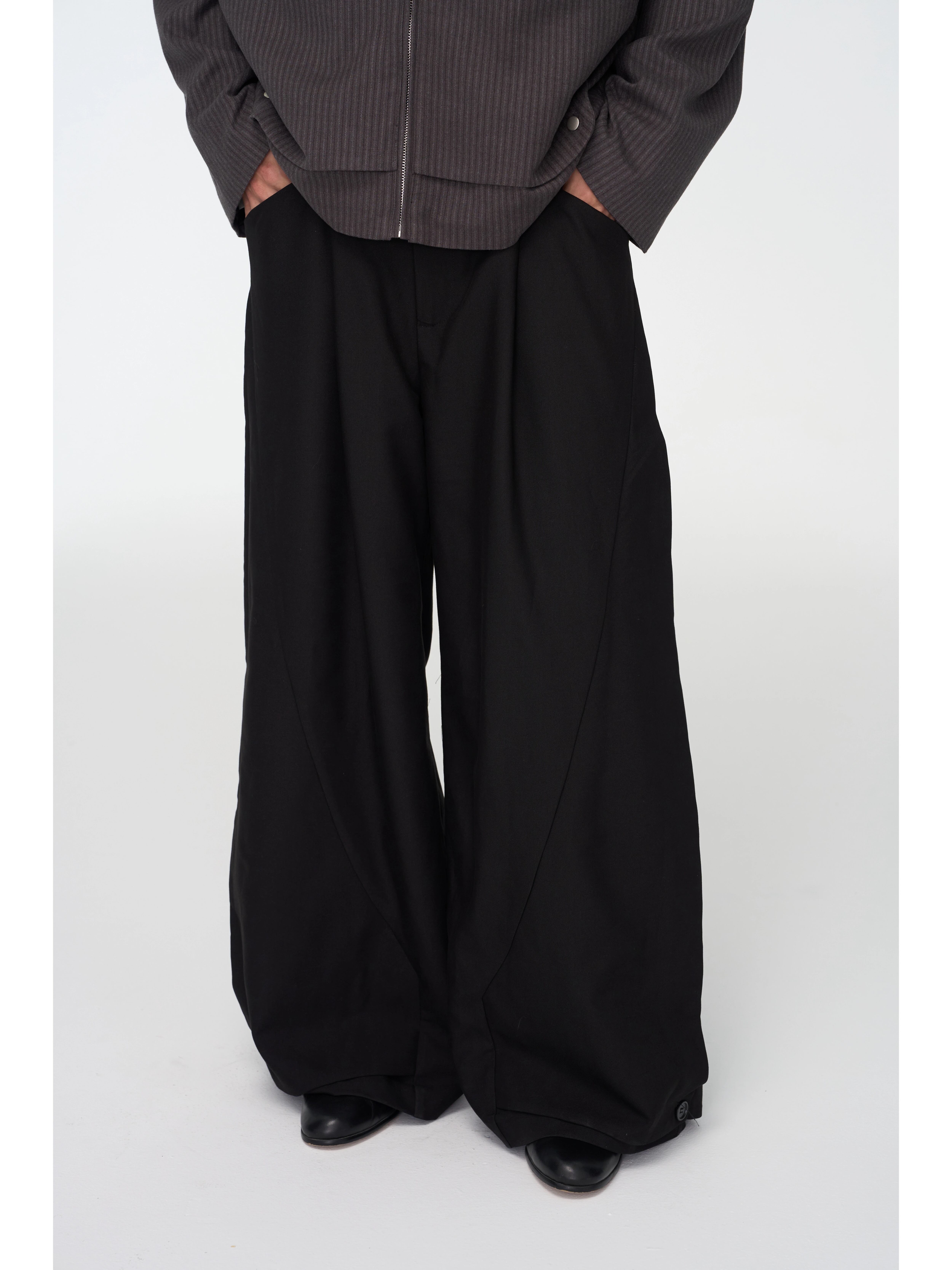サイドパネルの切り替え(パッチワーク)デザインが、着用時に立体的な構築美を生み出し、普通のワイドパンツにはないモードな存在感を放ちます。