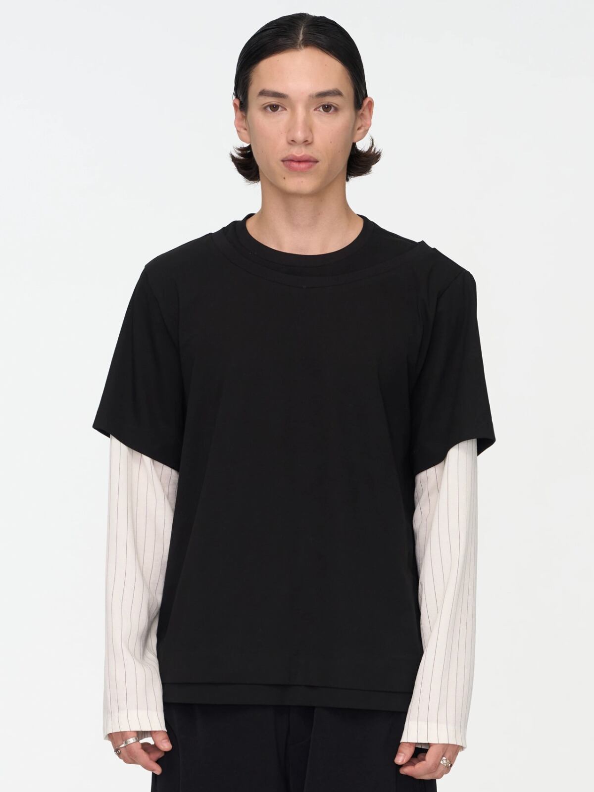 アウターのTシャツは無地、内側のロングスリーブはストライプ柄になっており、異なる素材と柄の組み合わせが、都会的で中性的なムードを強調します。