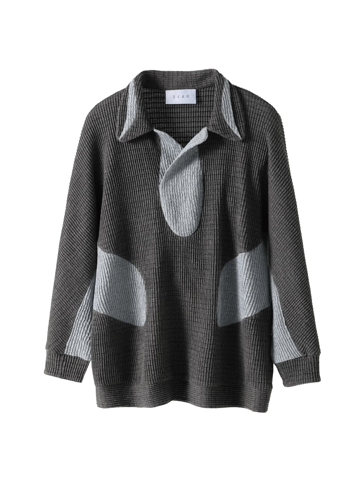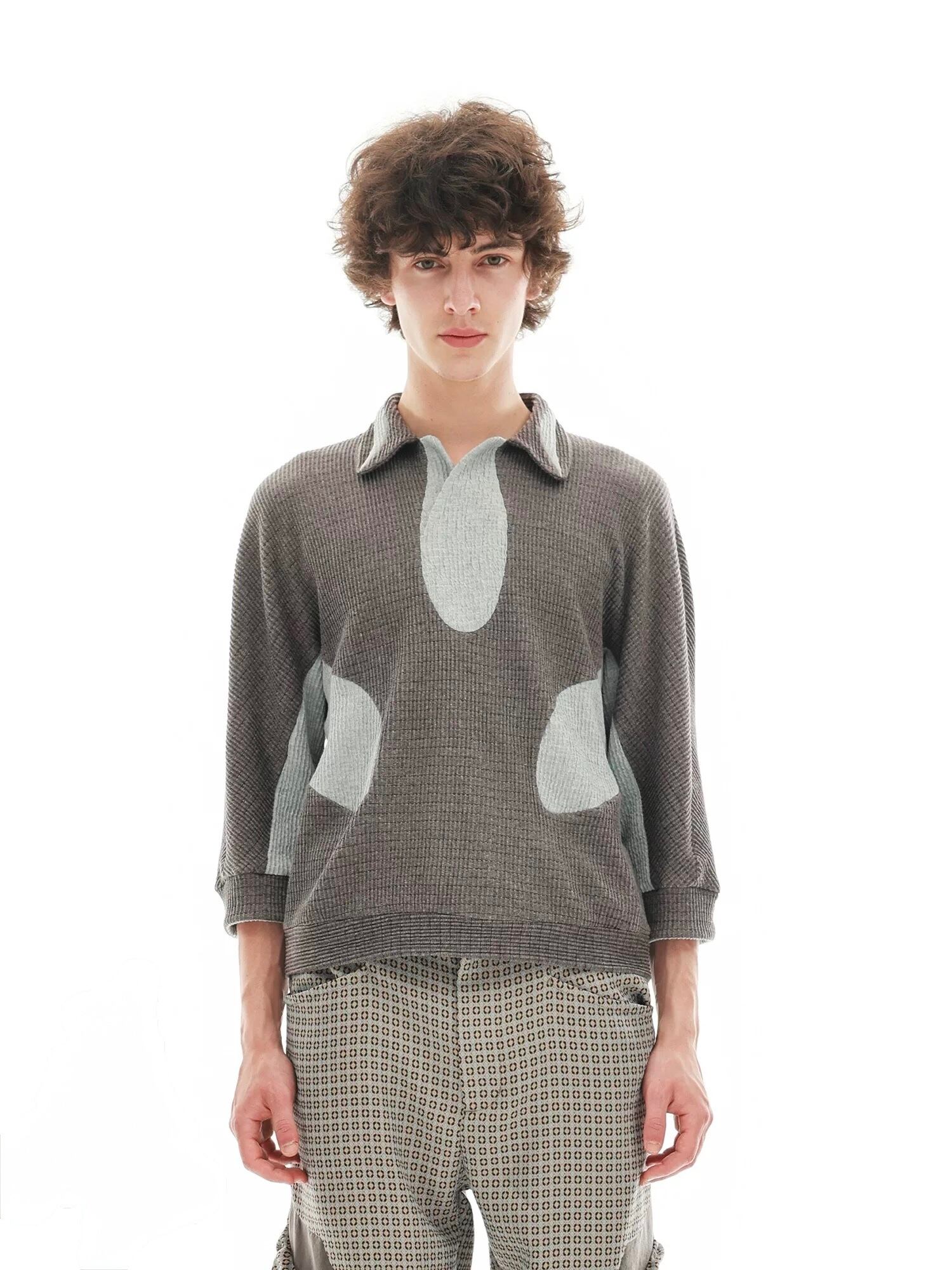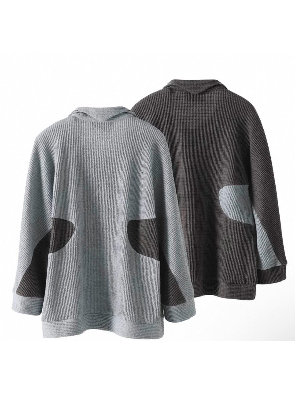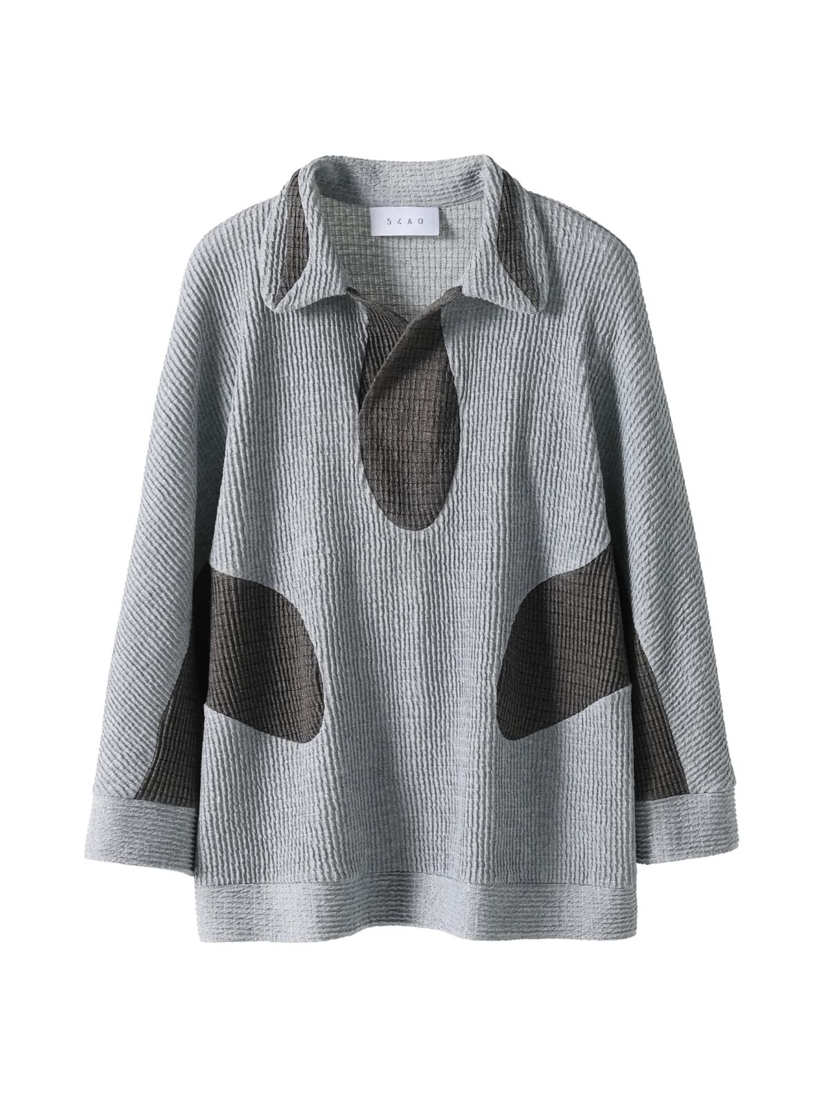 襟元は、壺のような形状でリラックス感とドレープを持たせたデザインで、モードなムードと快適性を両立させています。
