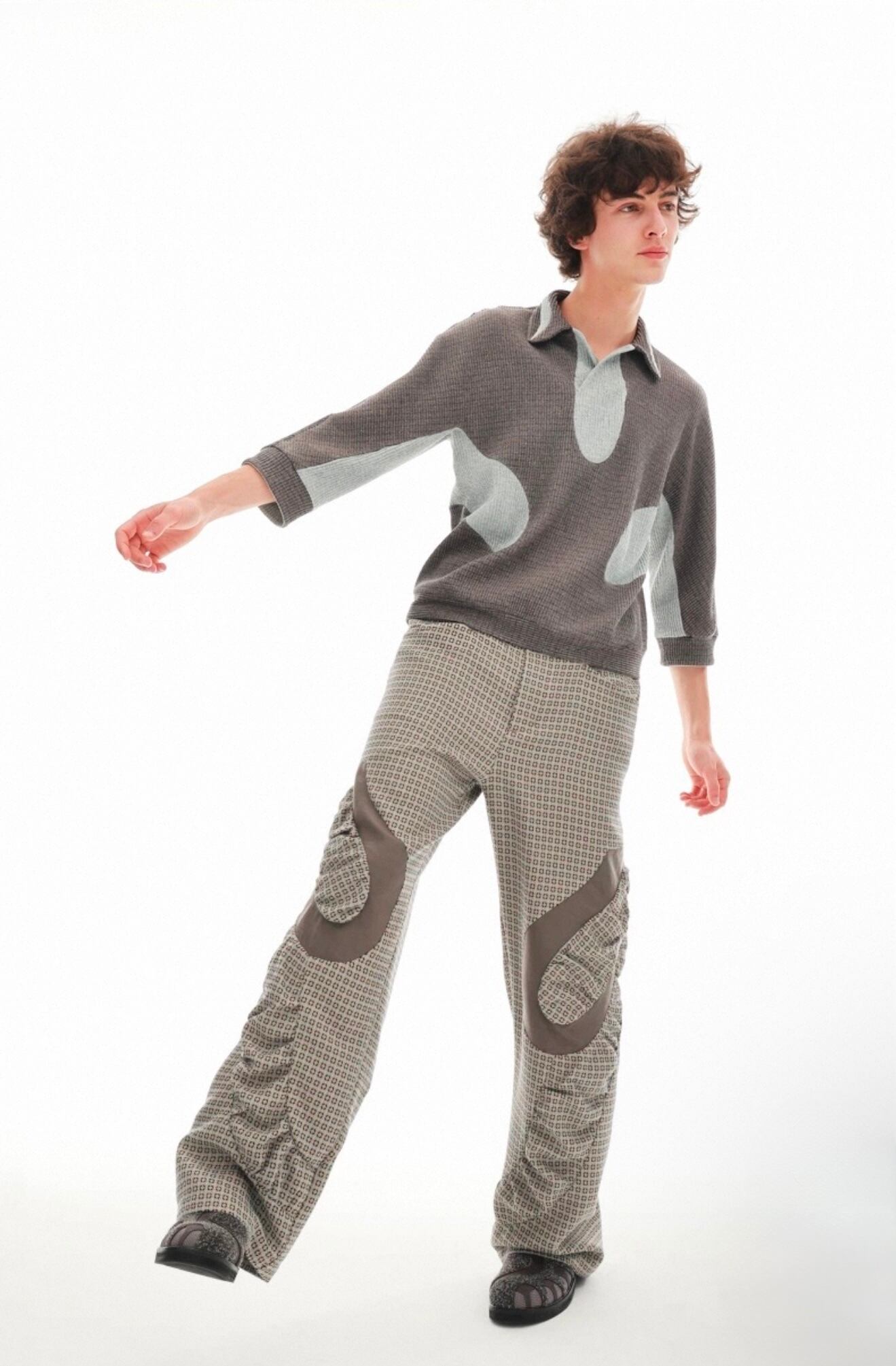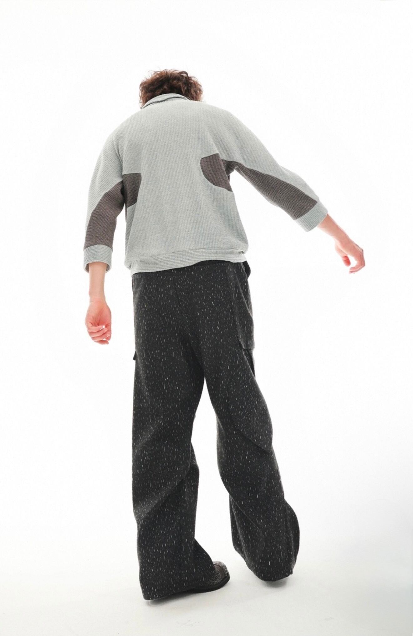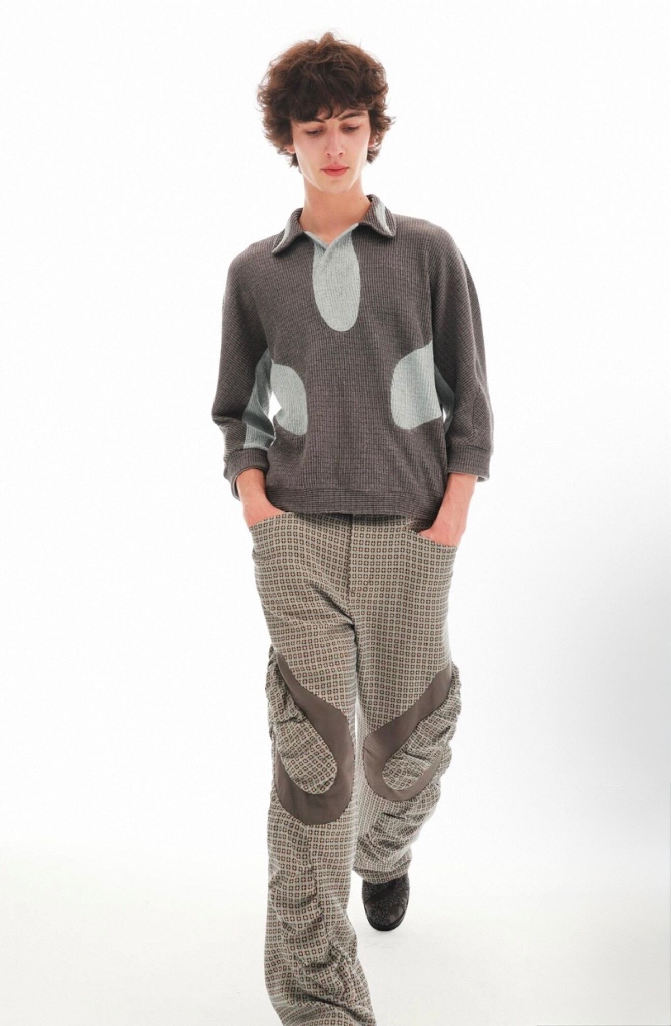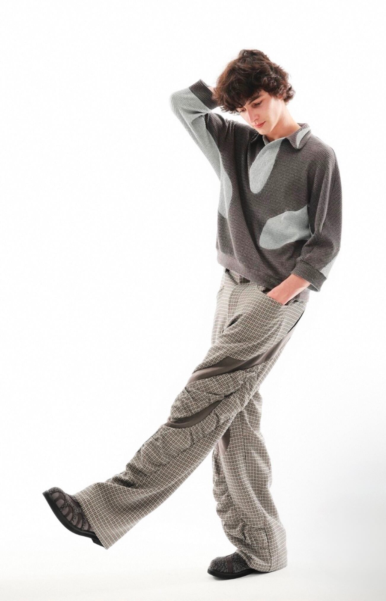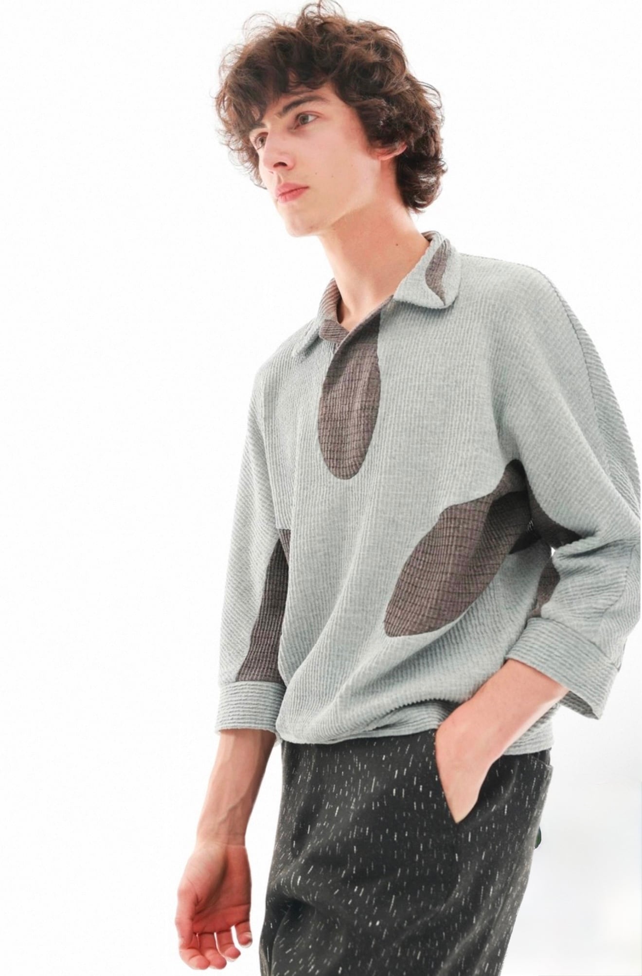 襟元は、壺のような形状でリラックス感とドレープを持たせたデザインで、モードなムードと快適性を両立させています。