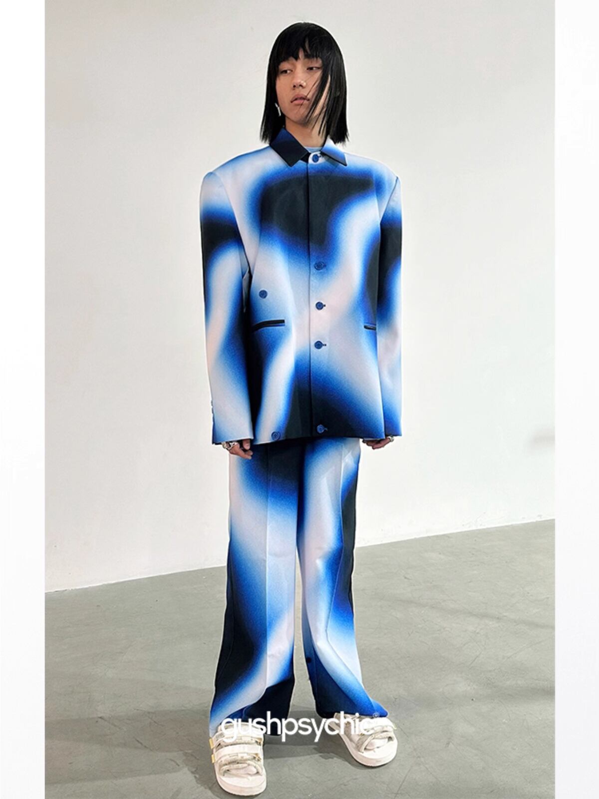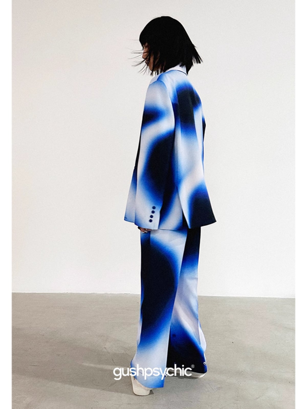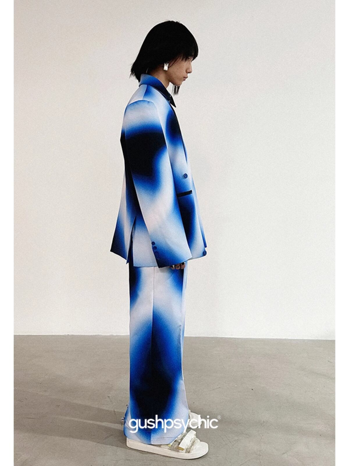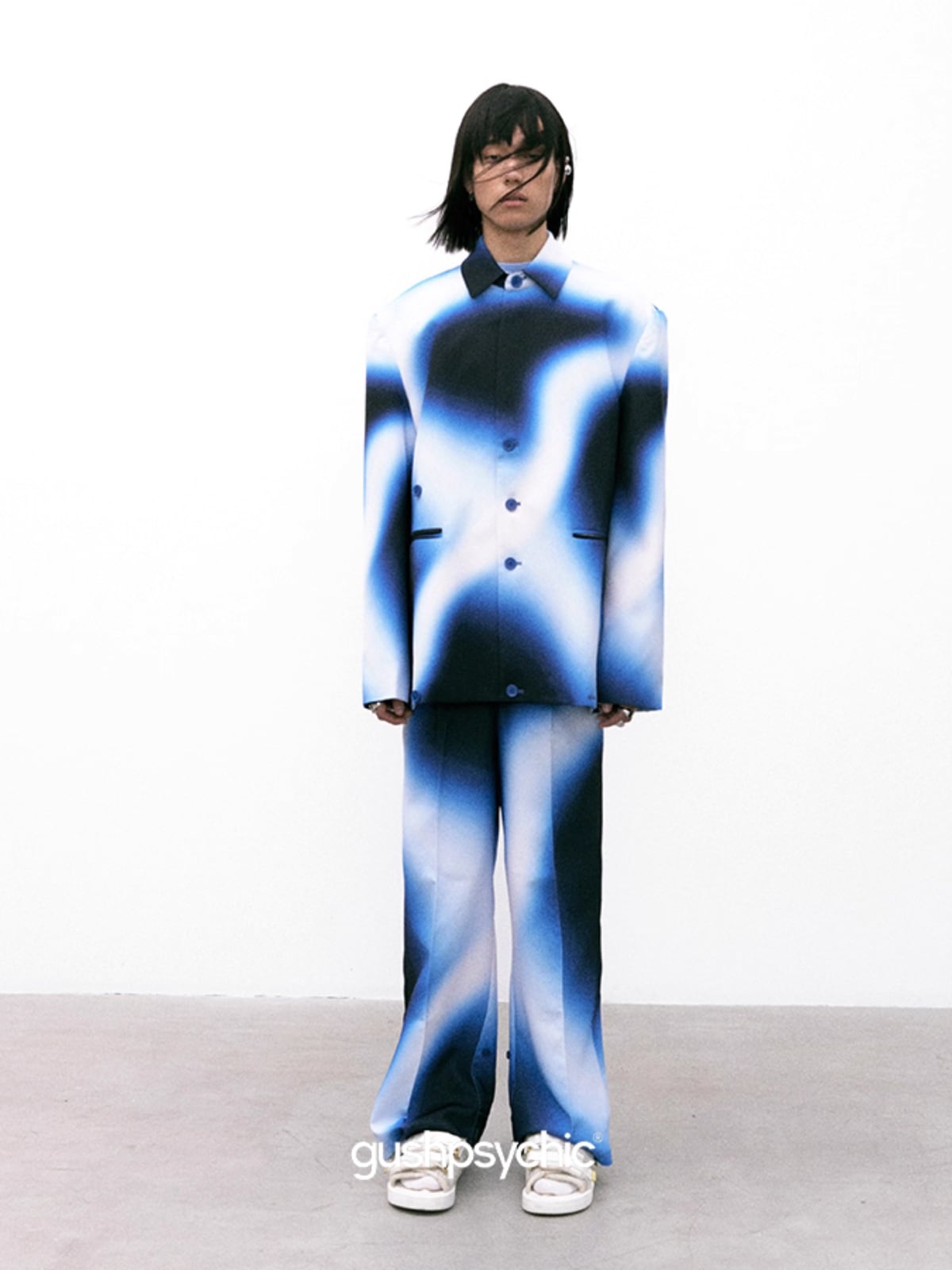 着用者を一瞬でモードなアートピースへと昇華させる、ブルーとホワイトの幻想的なグラデーションプリントが主役の3ピースセットアップです。