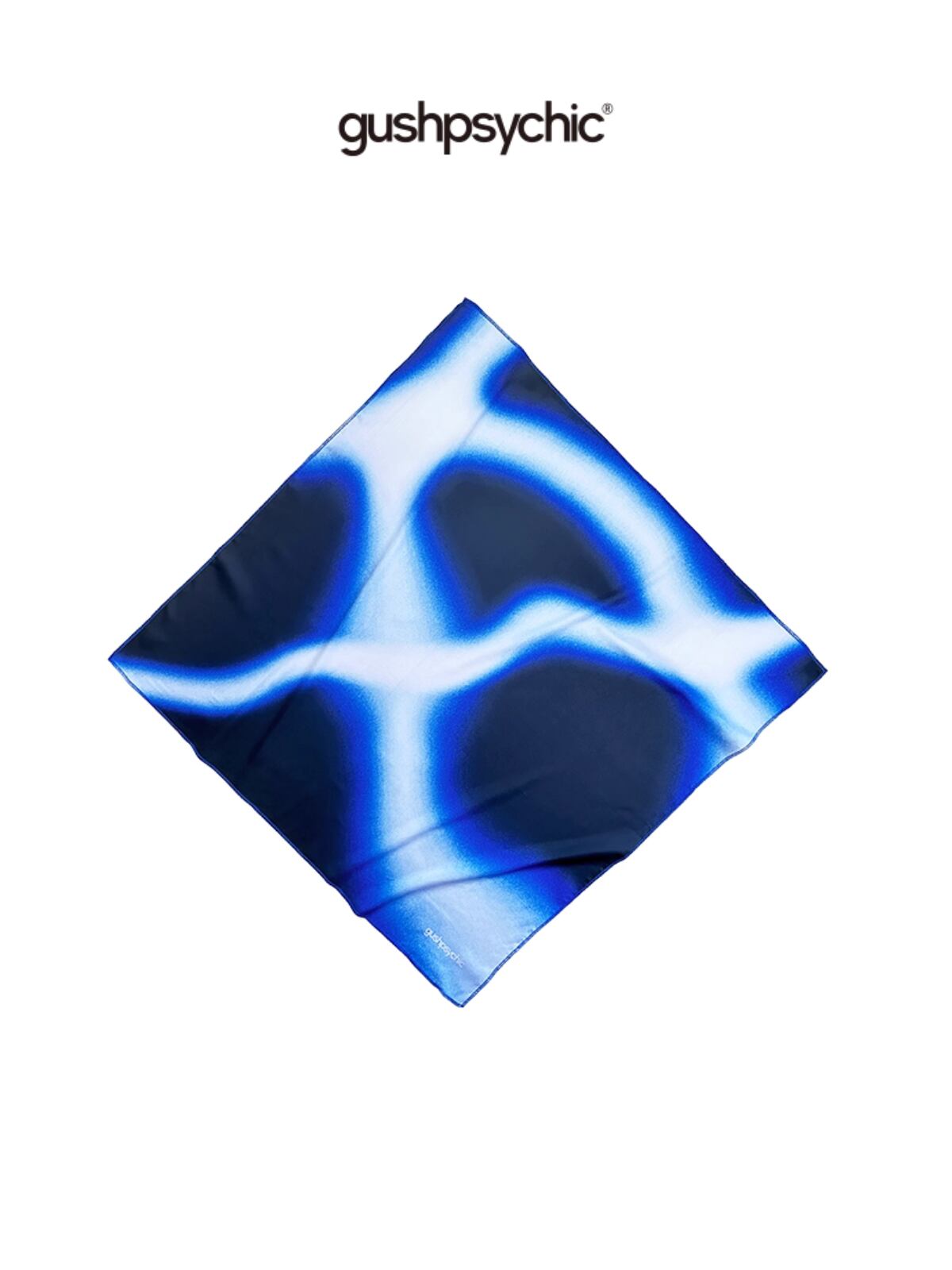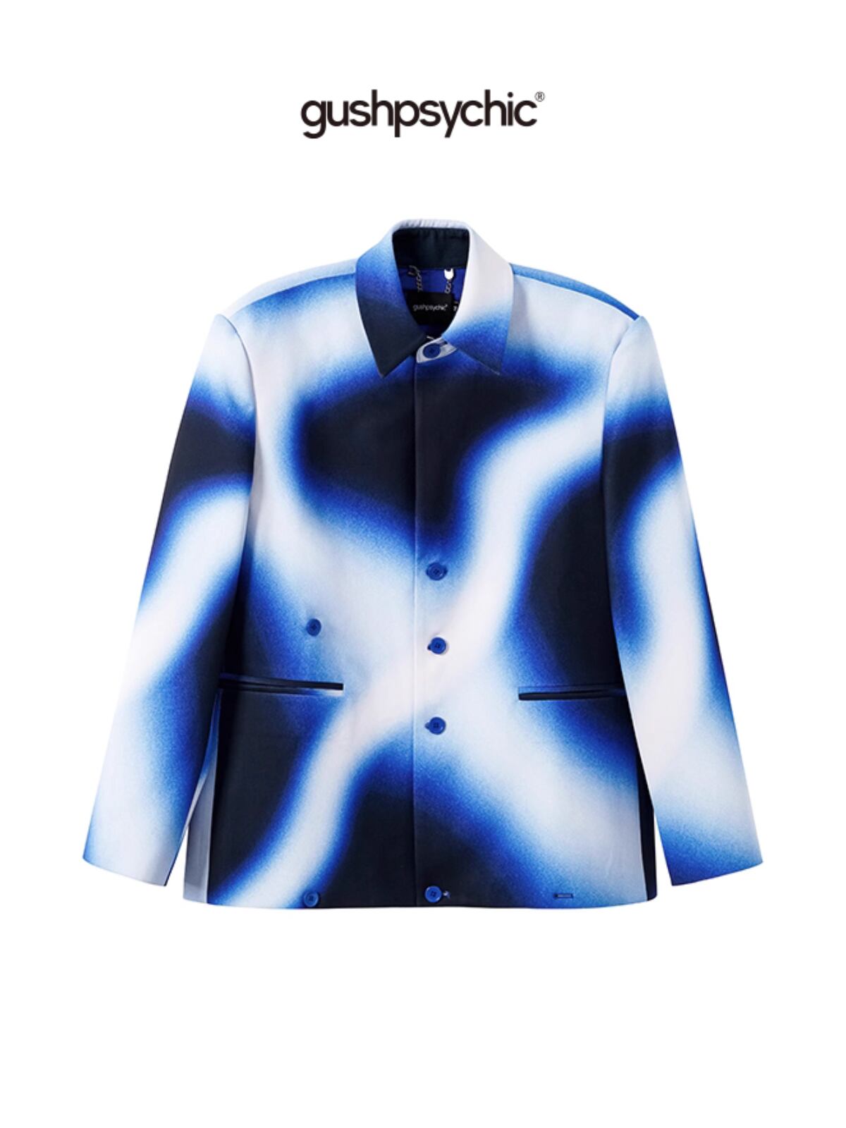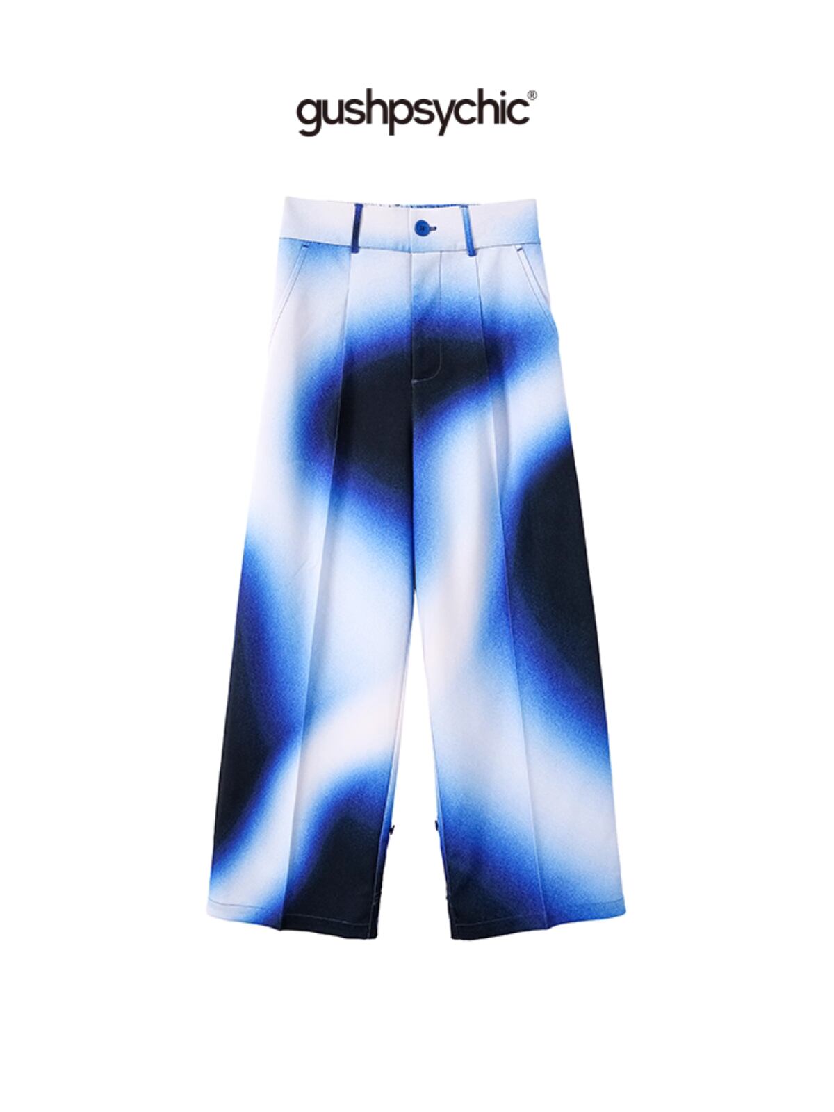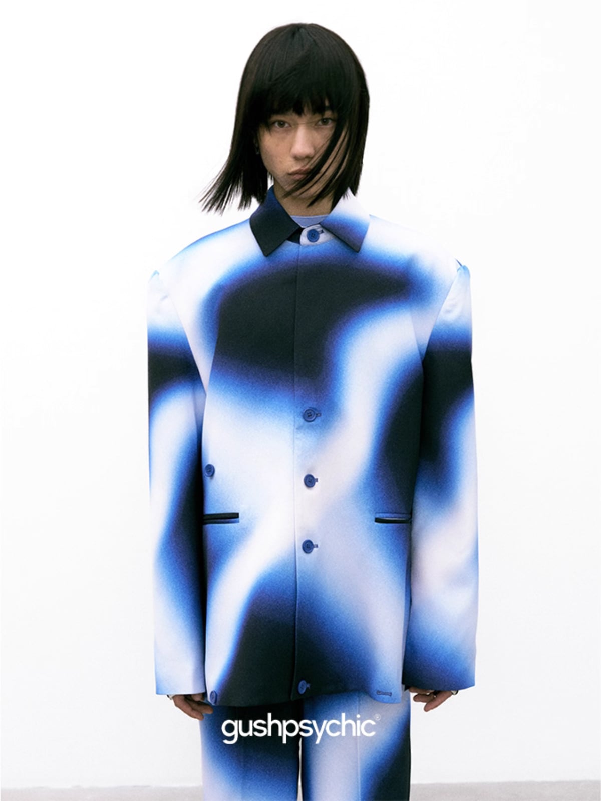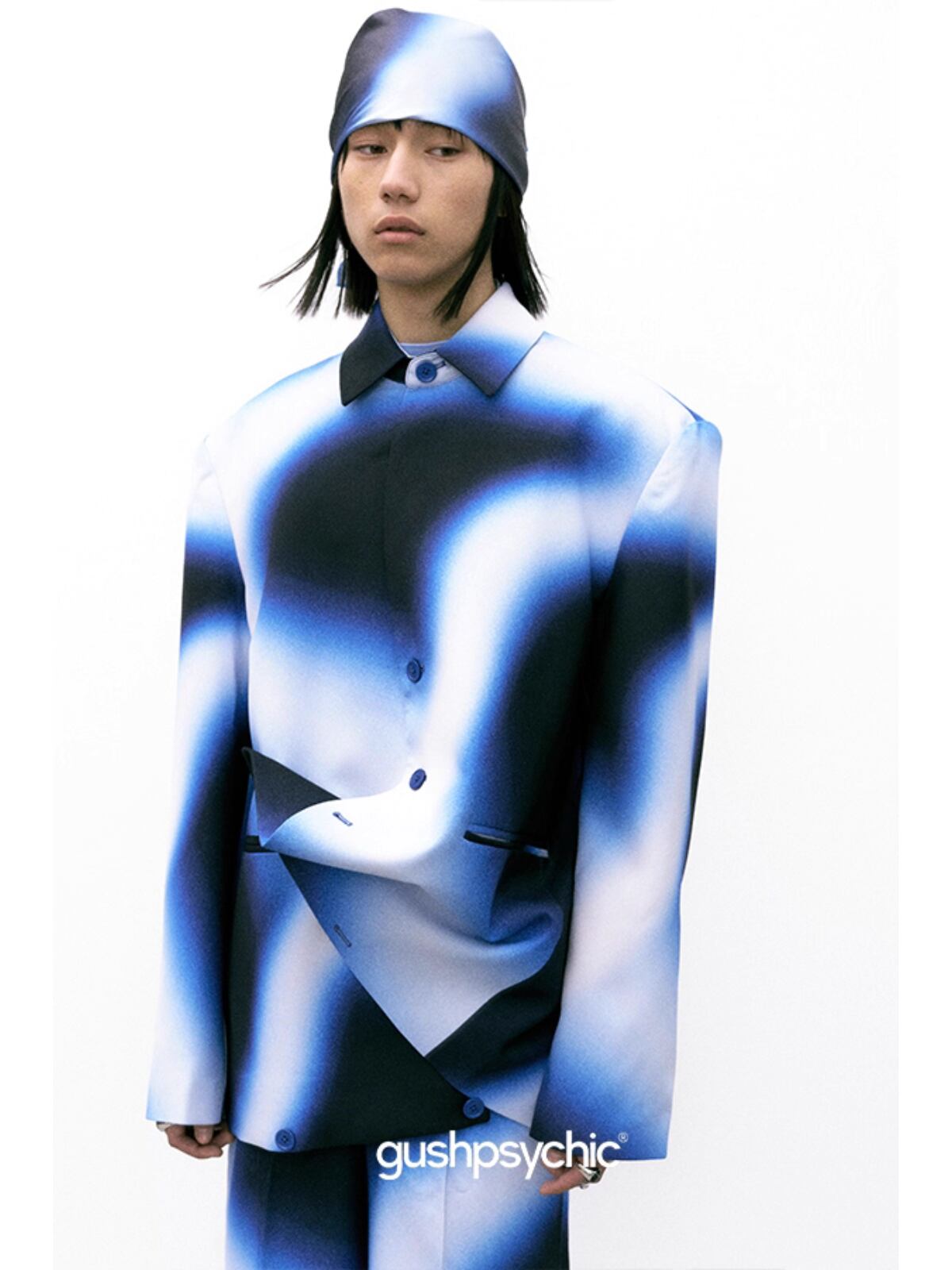 着用者を一瞬でモードなアートピースへと昇華させる、ブルーとホワイトの幻想的なグラデーションプリントが主役の3ピースセットアップです。