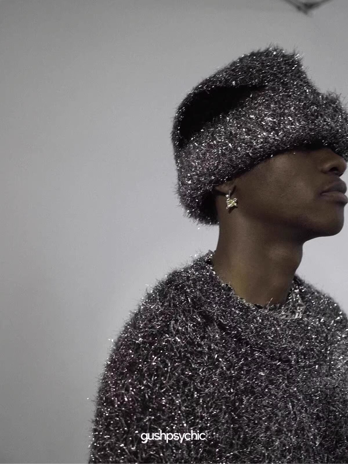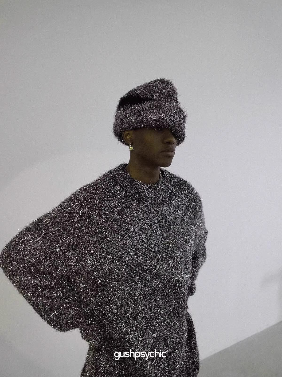 圧倒的な存在感を放つ毛足の長いシャギーニットを使用した、多機能バラクラバ付きニット帽です。