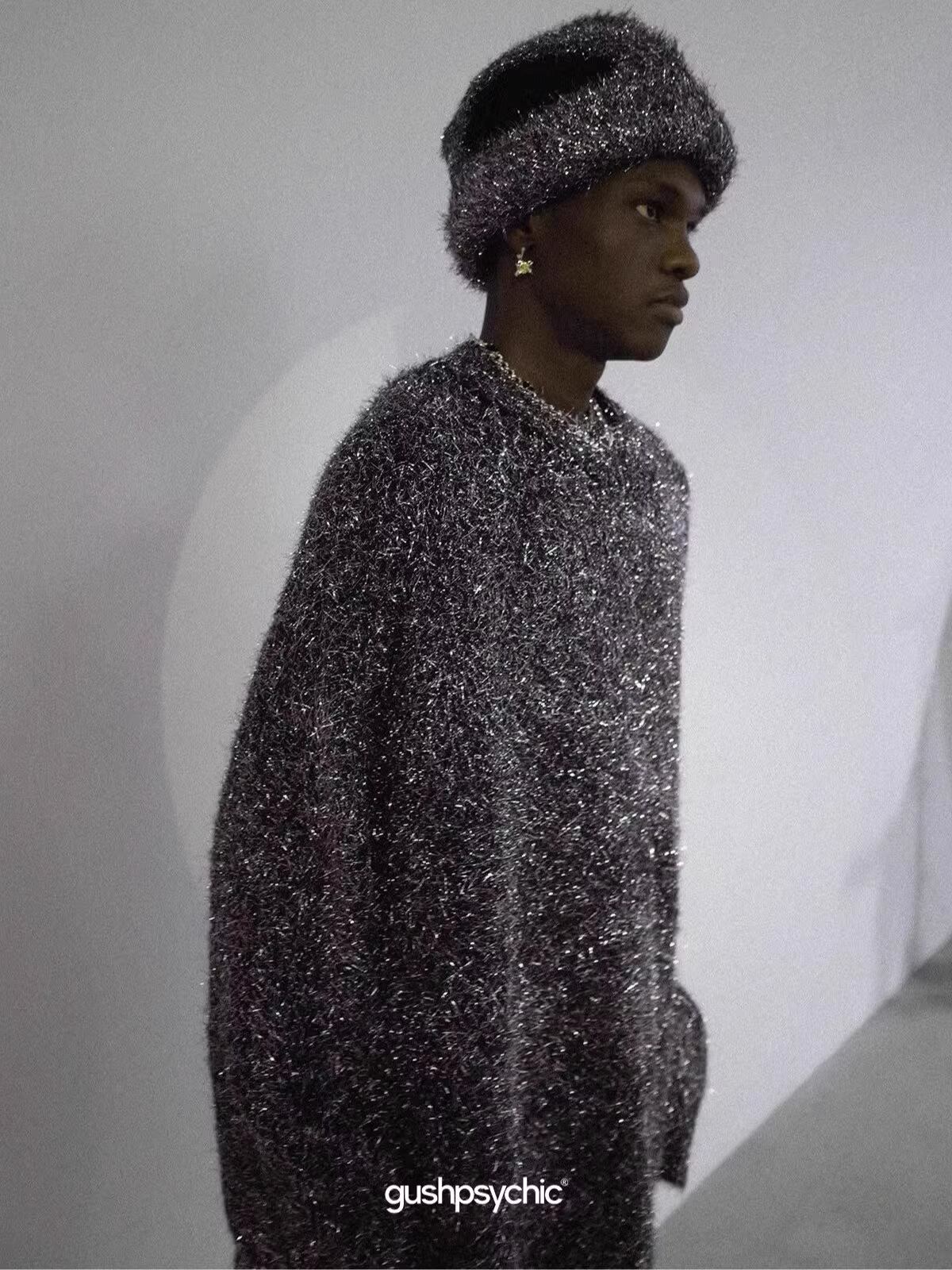 素材にキラキラと輝くシャイニーな糸を編み込んでおり、照明や日光の下で表情を変えるドラマチックな光沢感を演出。