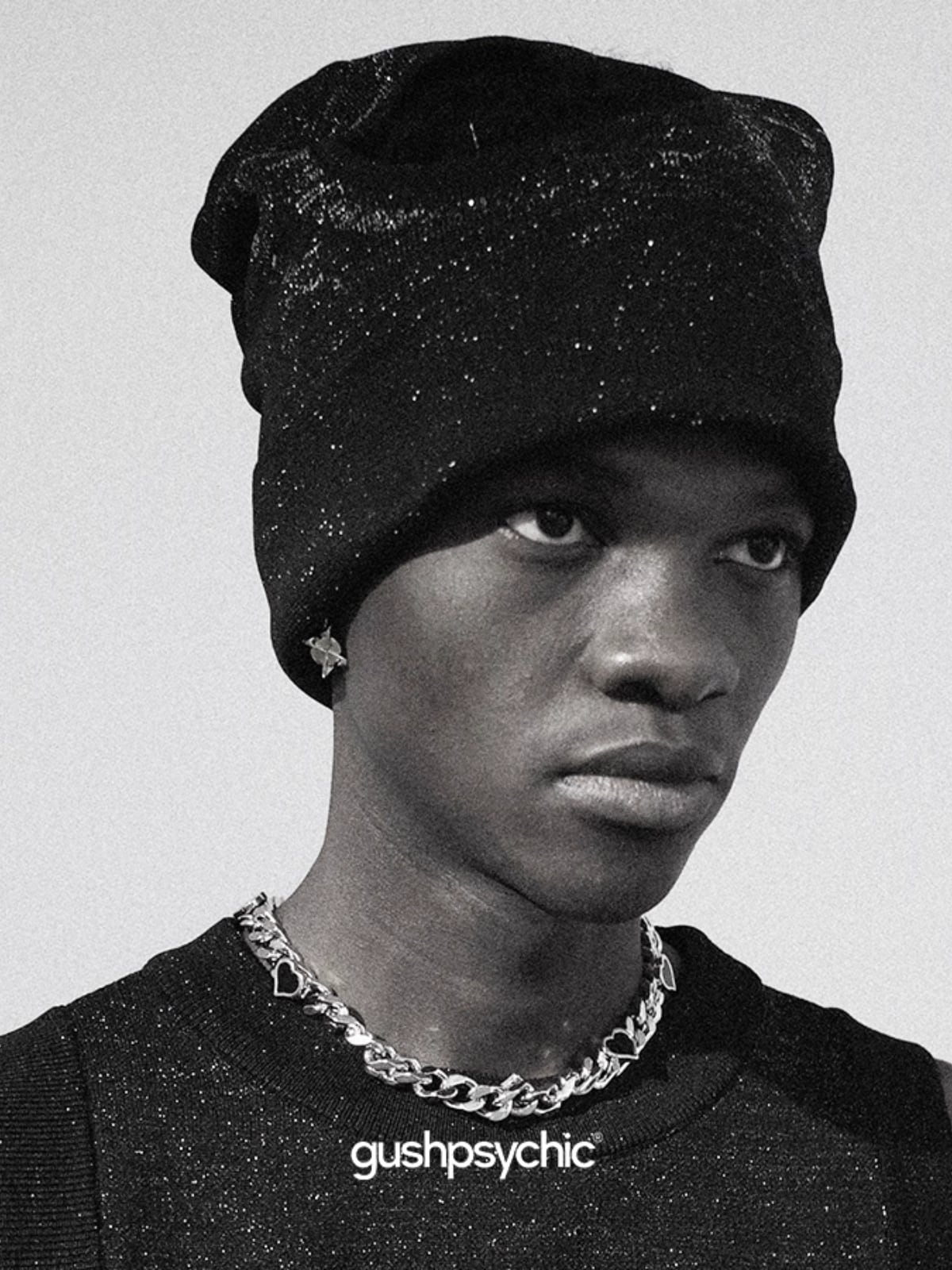 光沢のある糸と毛糸を編み合わせたニット素材が、動くたびにほのかにきらめき、暗闇の中でも存在感を放ちます。