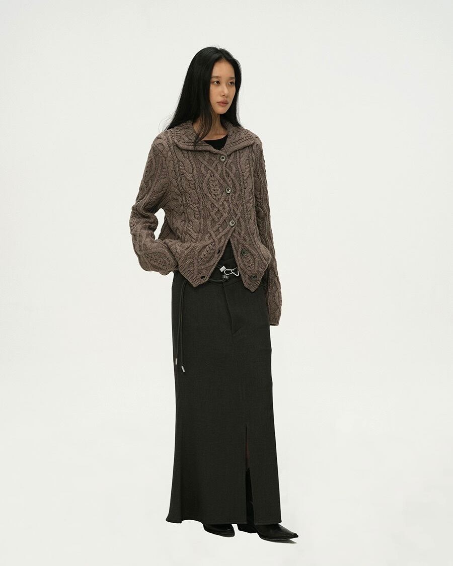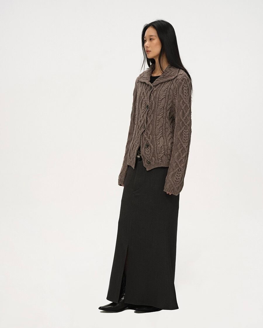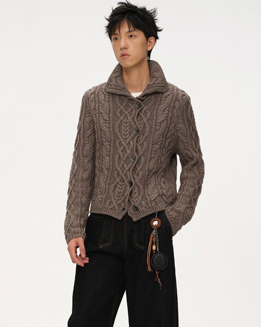 馬術ウェアの優雅さから着想を得た、重厚なケーブル編みとポロシャツ風の襟が特徴のカーディガン。