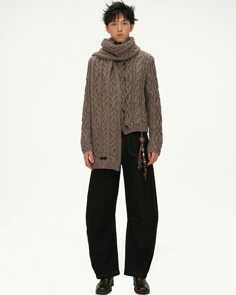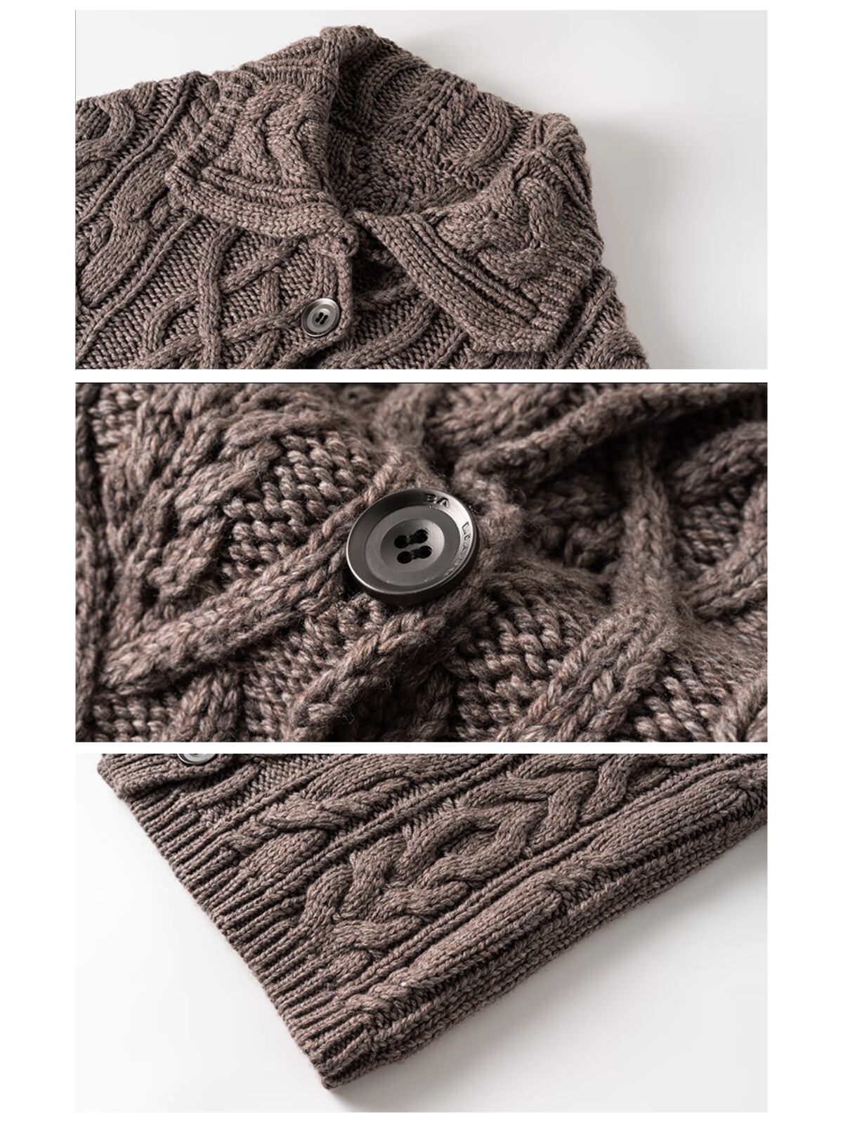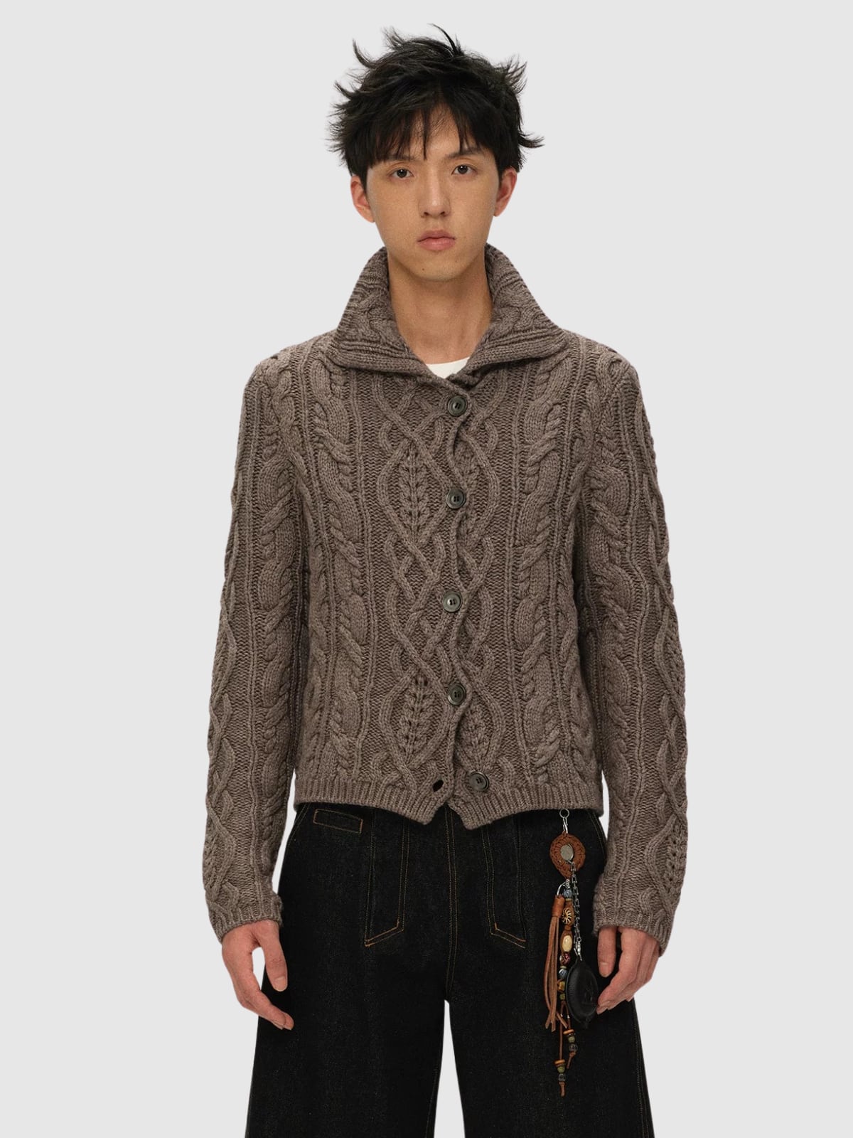 馬術ウェアの優雅さから着想を得た、重厚なケーブル編みとポロシャツ風の襟が特徴のカーディガン。