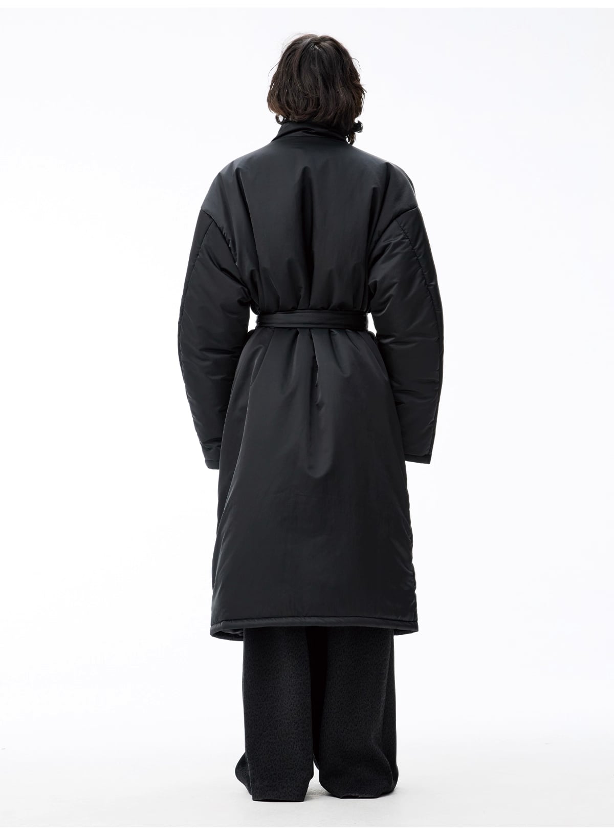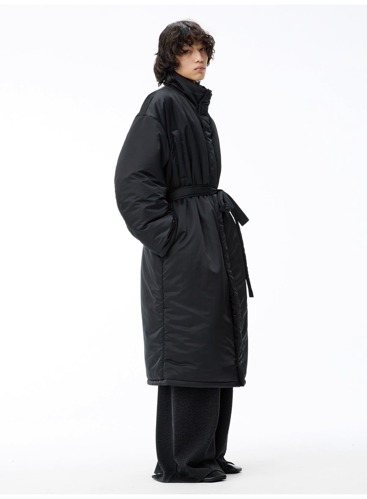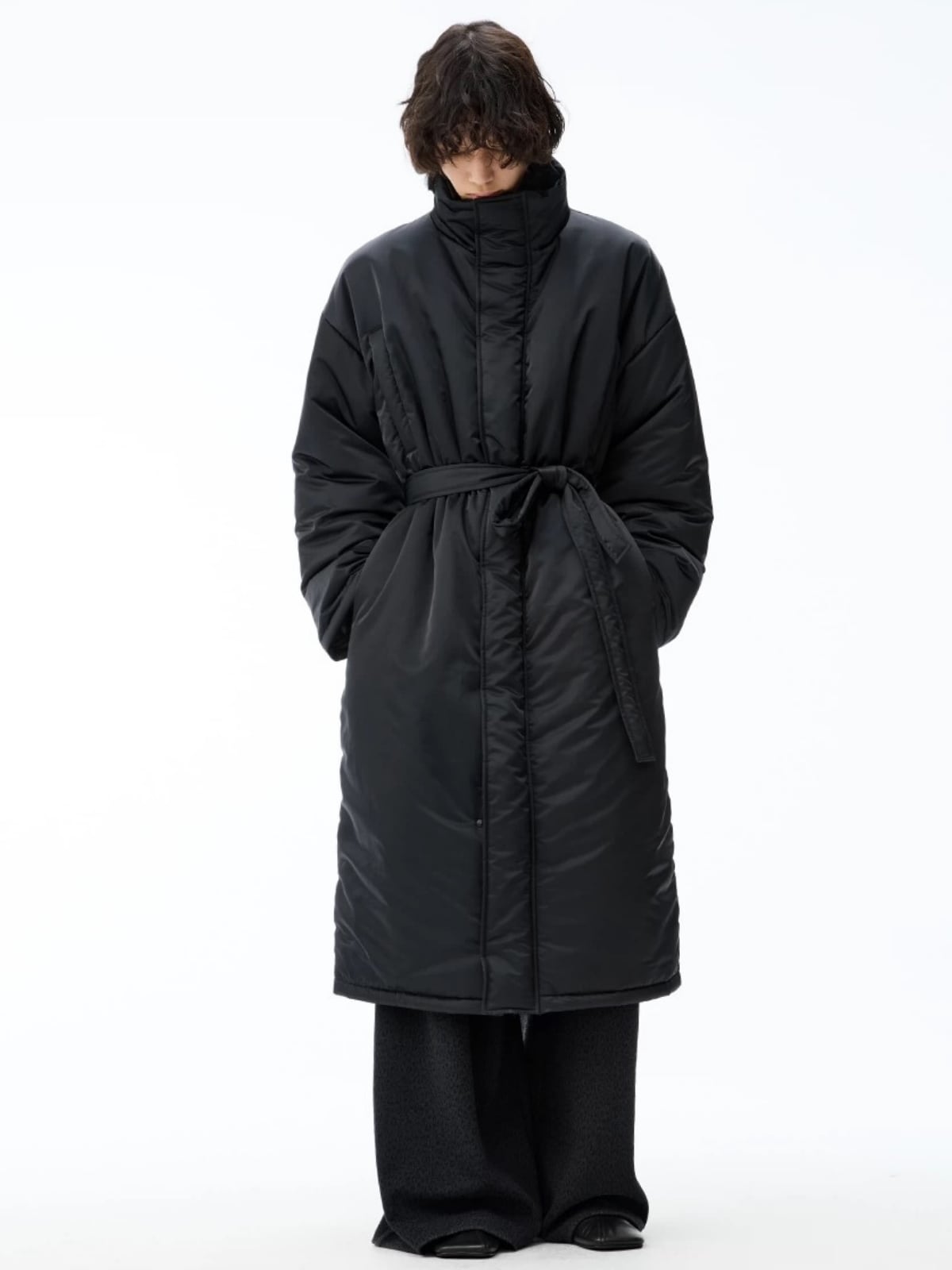 マットな質感のナイロンと、ゆったりとしたルーズフィットのコクーンシルエットが、モードで洗練された佇まいを演出。