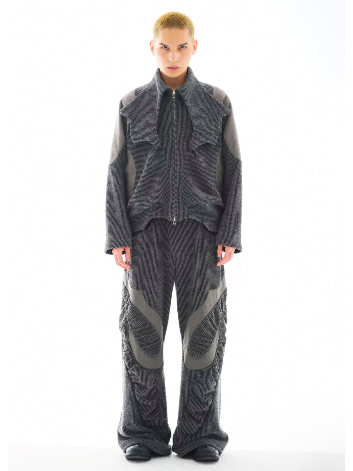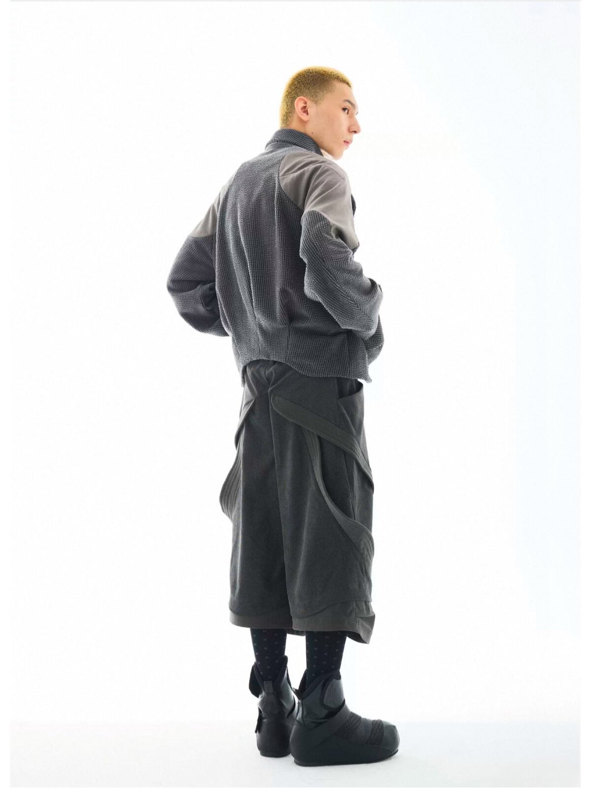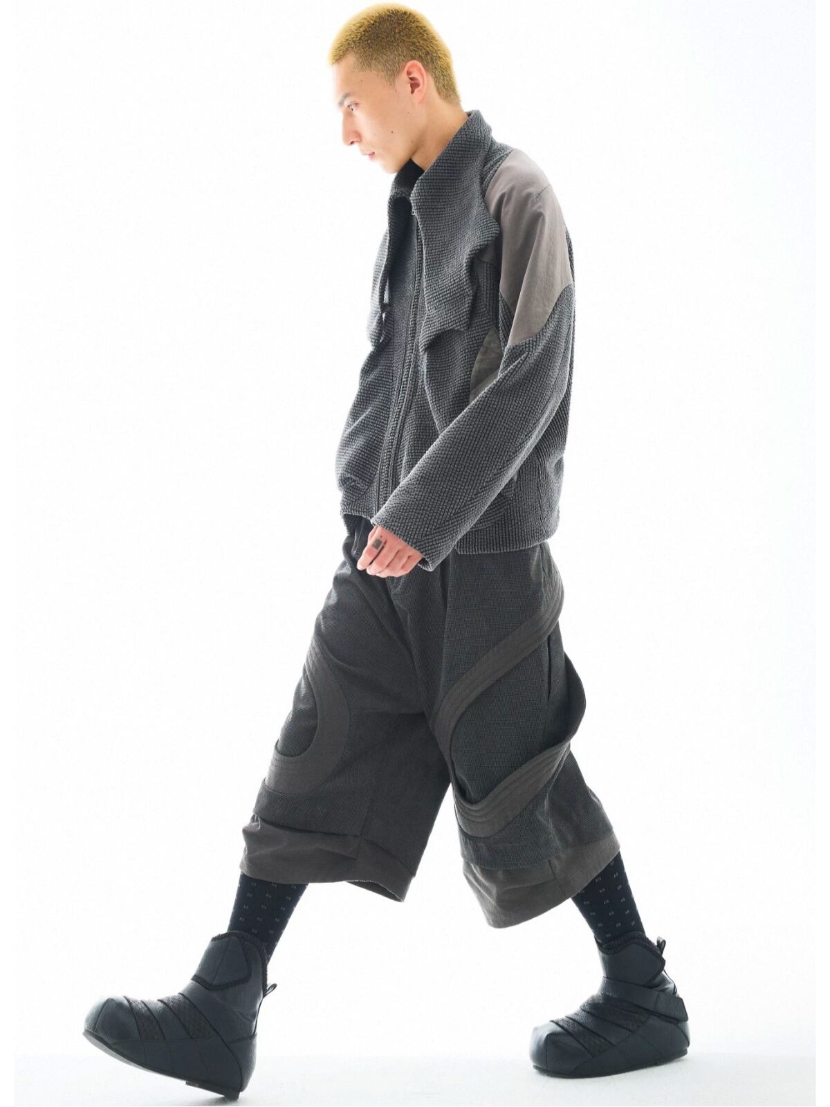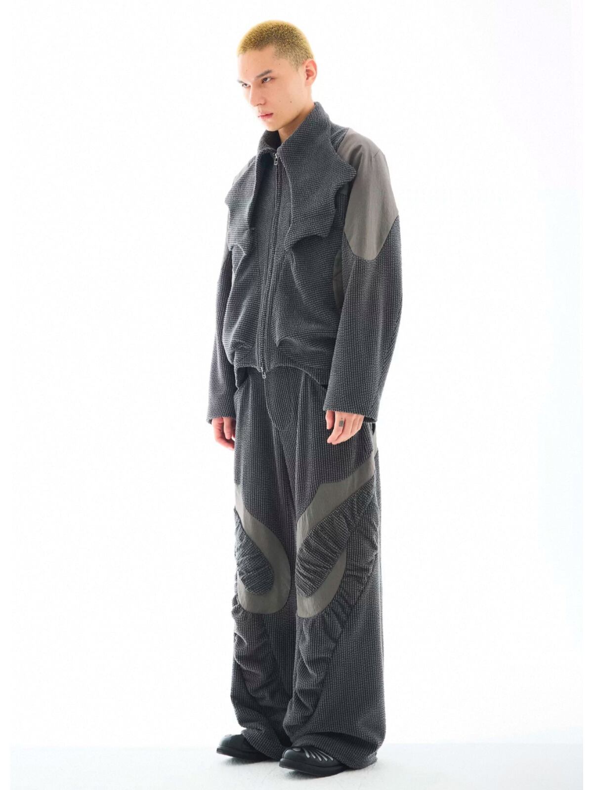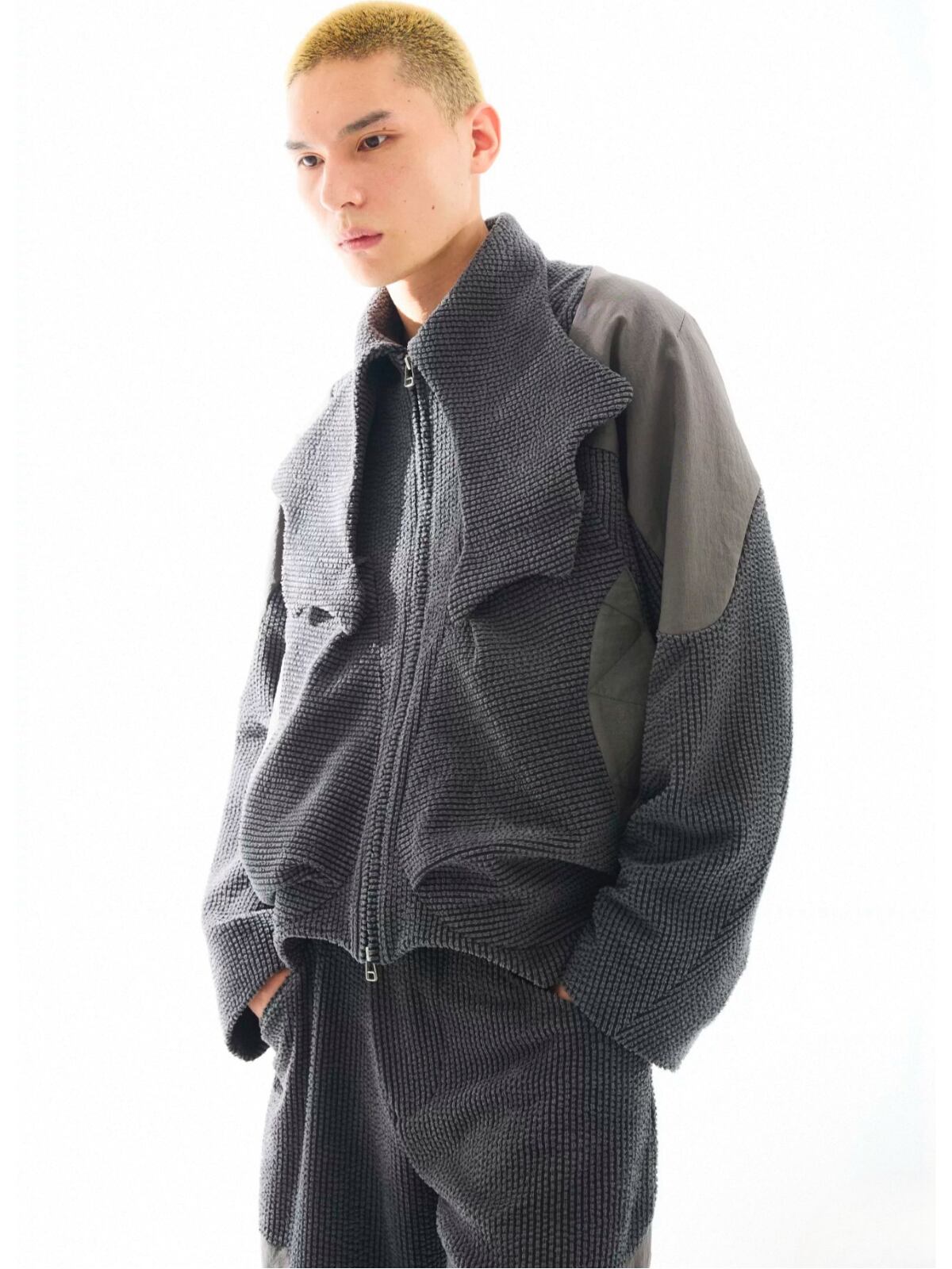 多素材パッチワークとアシンメトリーな構造が、解体的な美しさを放つハイネックショートジャケット。