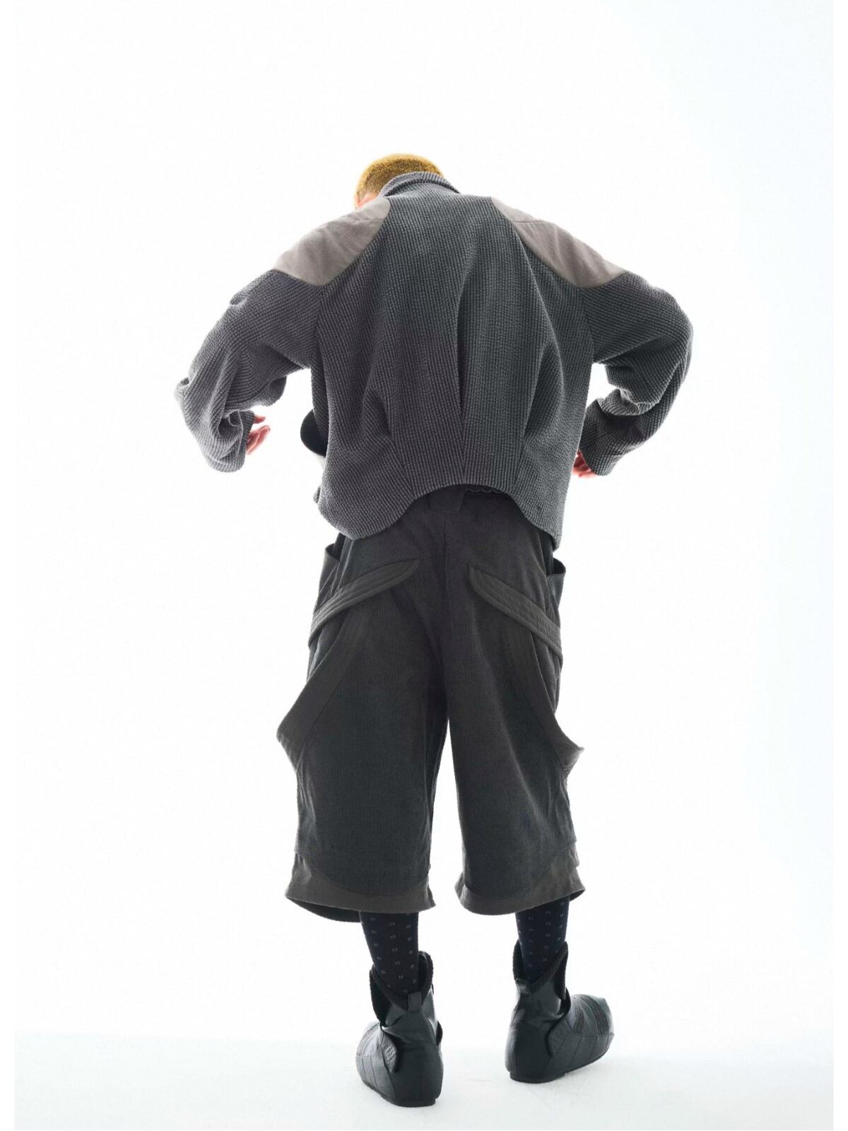 ゆったりとしたルーズフィットの短丈シルエットに、ドロップショルダーと腕に沿って湾曲したカッターナイフ型スリーブを組み合わせ、動きやすさとモダンなフォルムを両立。