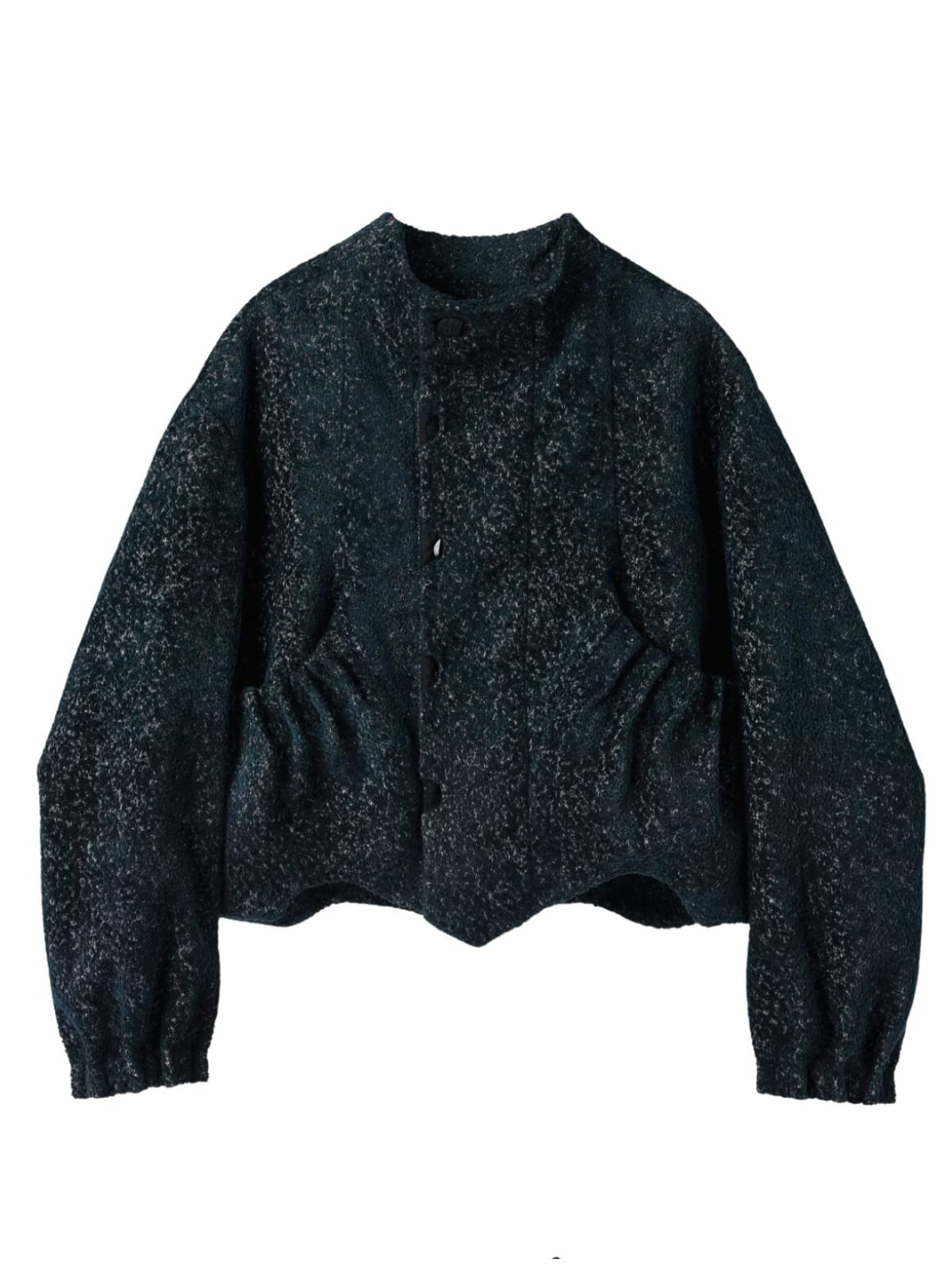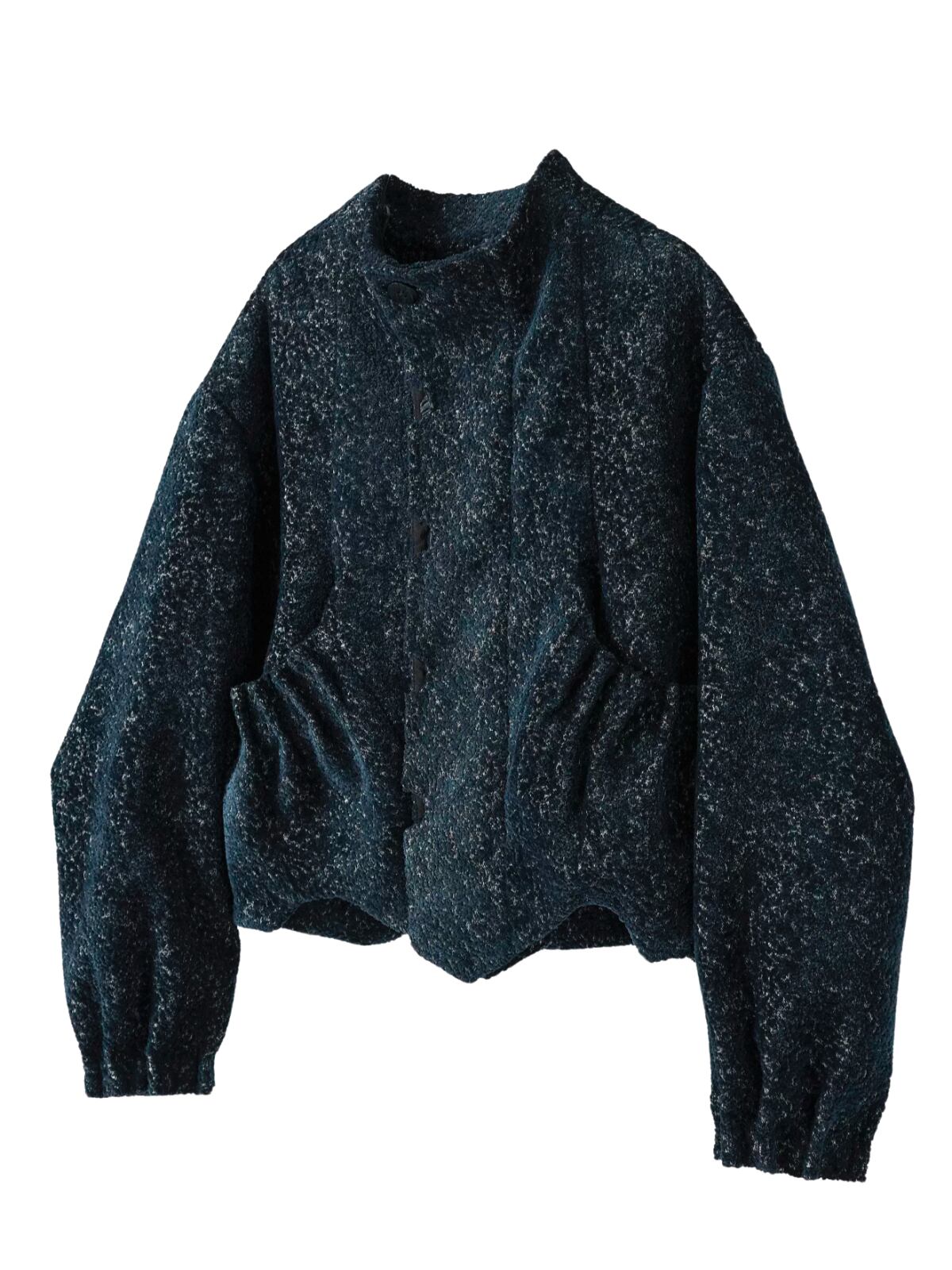 シェニール60%を含む厚手素材に、立体的なベルベット調のジャカード織りを施した、豊かで柔らかな質感が魅力のショートジャケット。