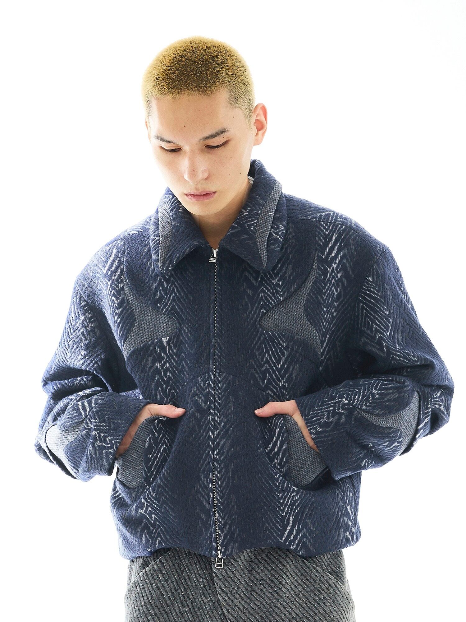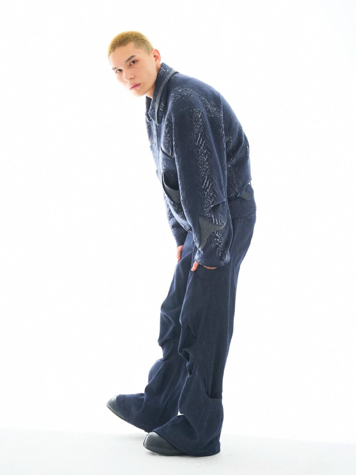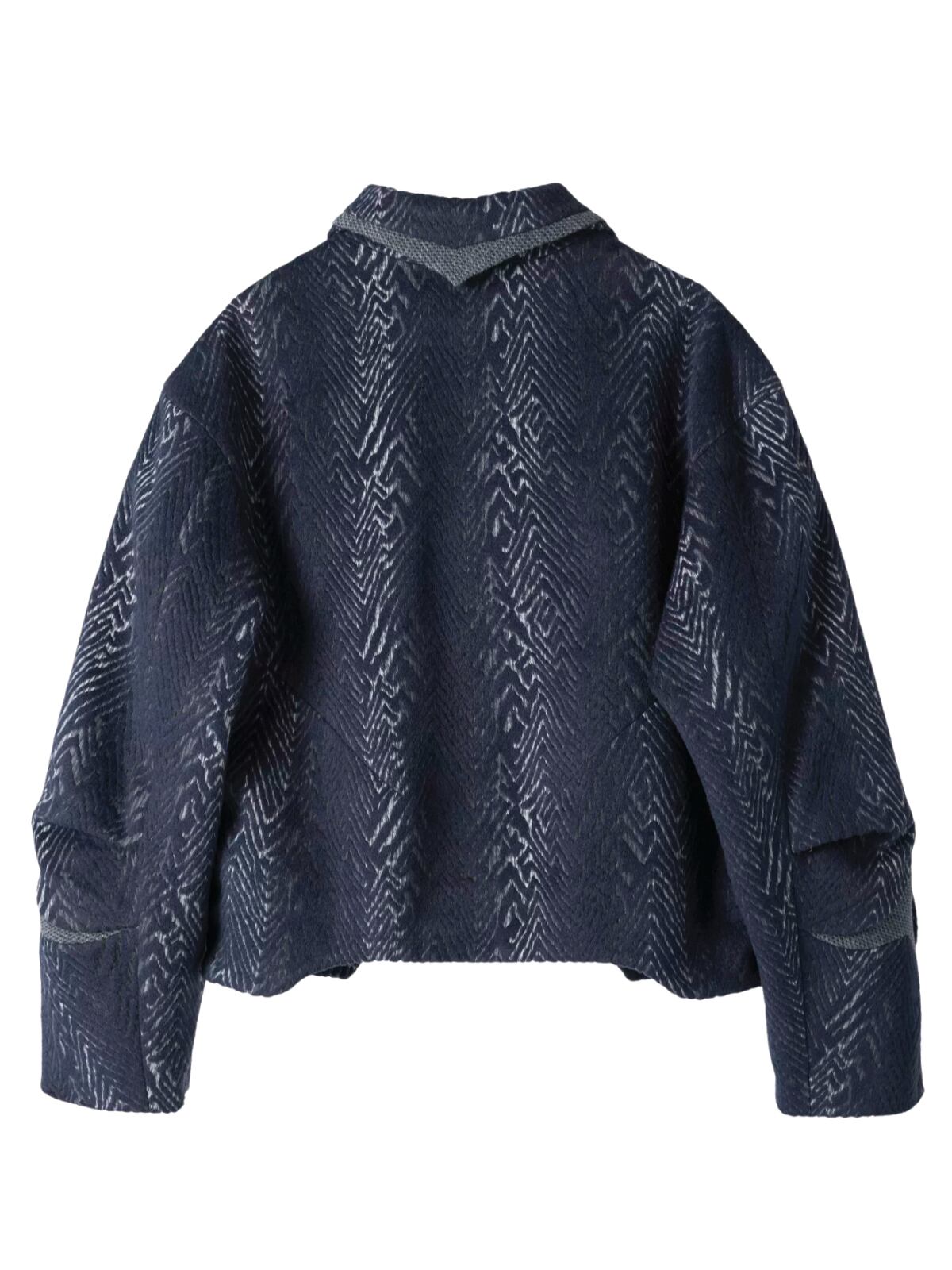 幾何学的なカッティングで「三日月」を再構築し、身頃に縫い合わせた、解体的なデザインが魅力のショートジャケット。