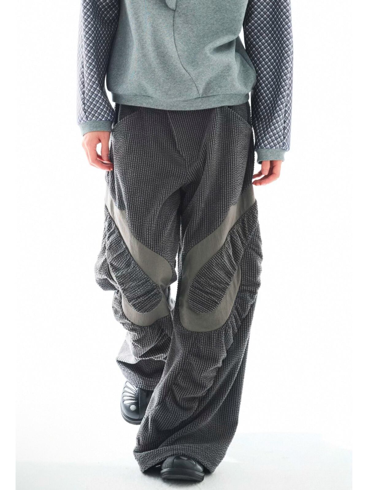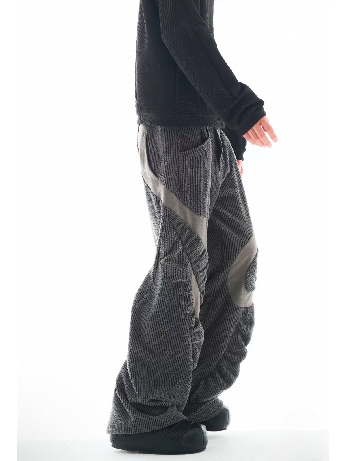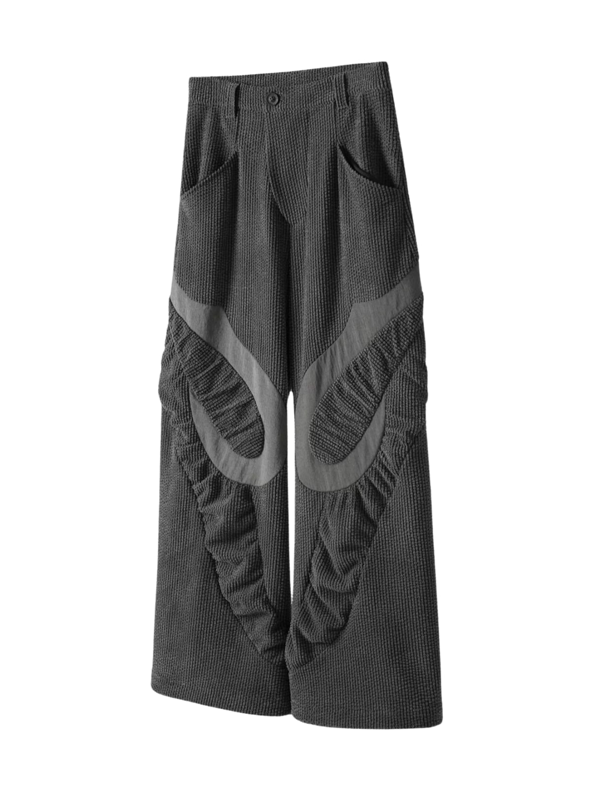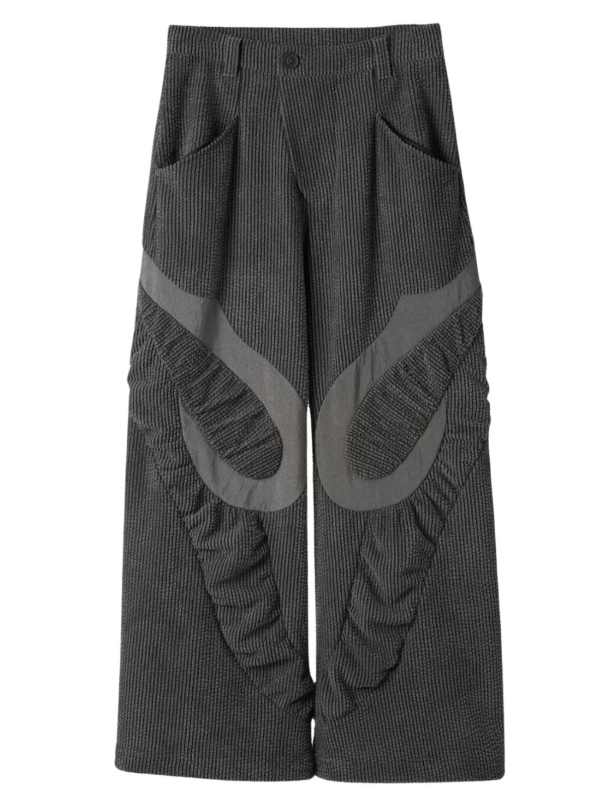 「魚の尾」をモチーフにしたユニークなパッチワークと、幾何学的なカッティングが融合した、モードなワイドパンツ。