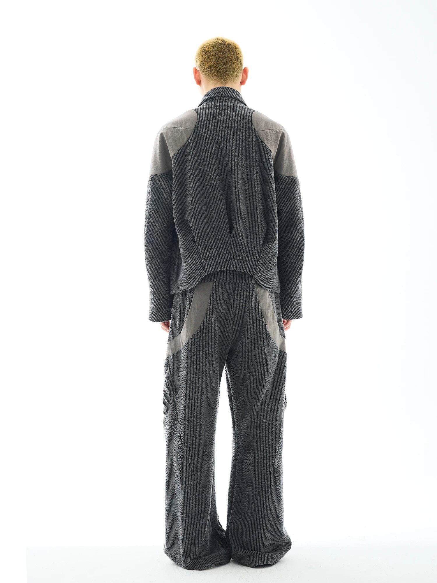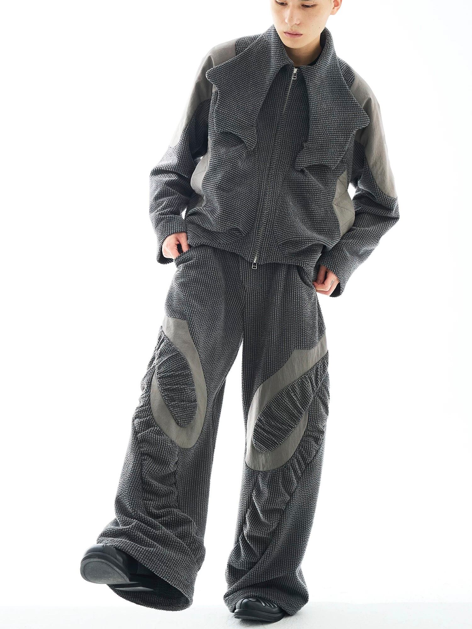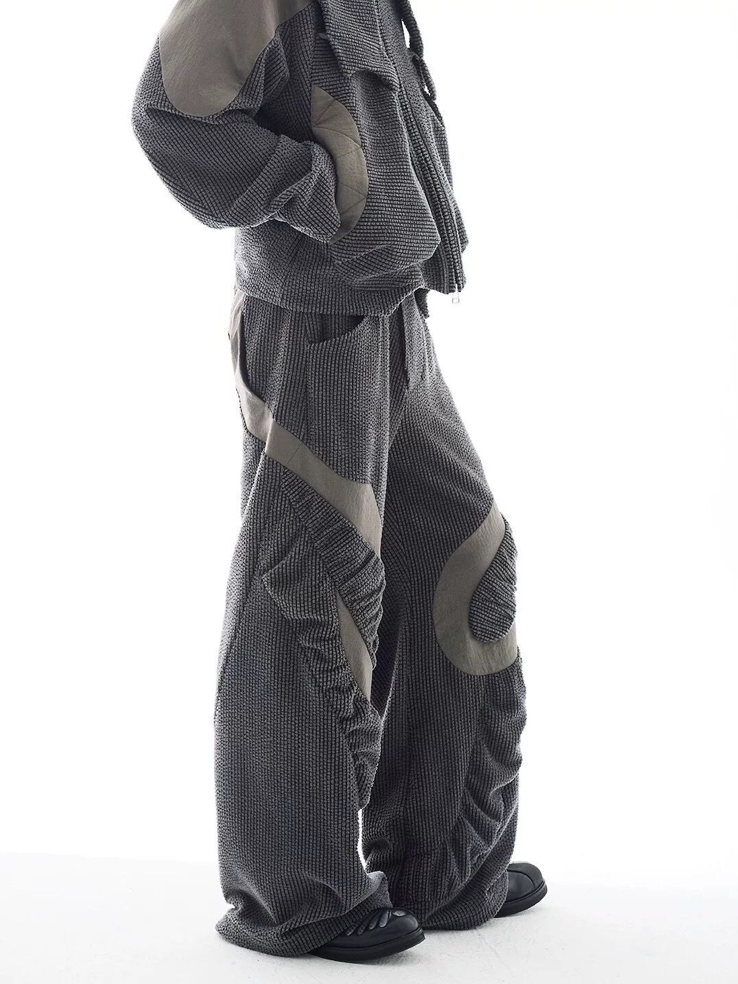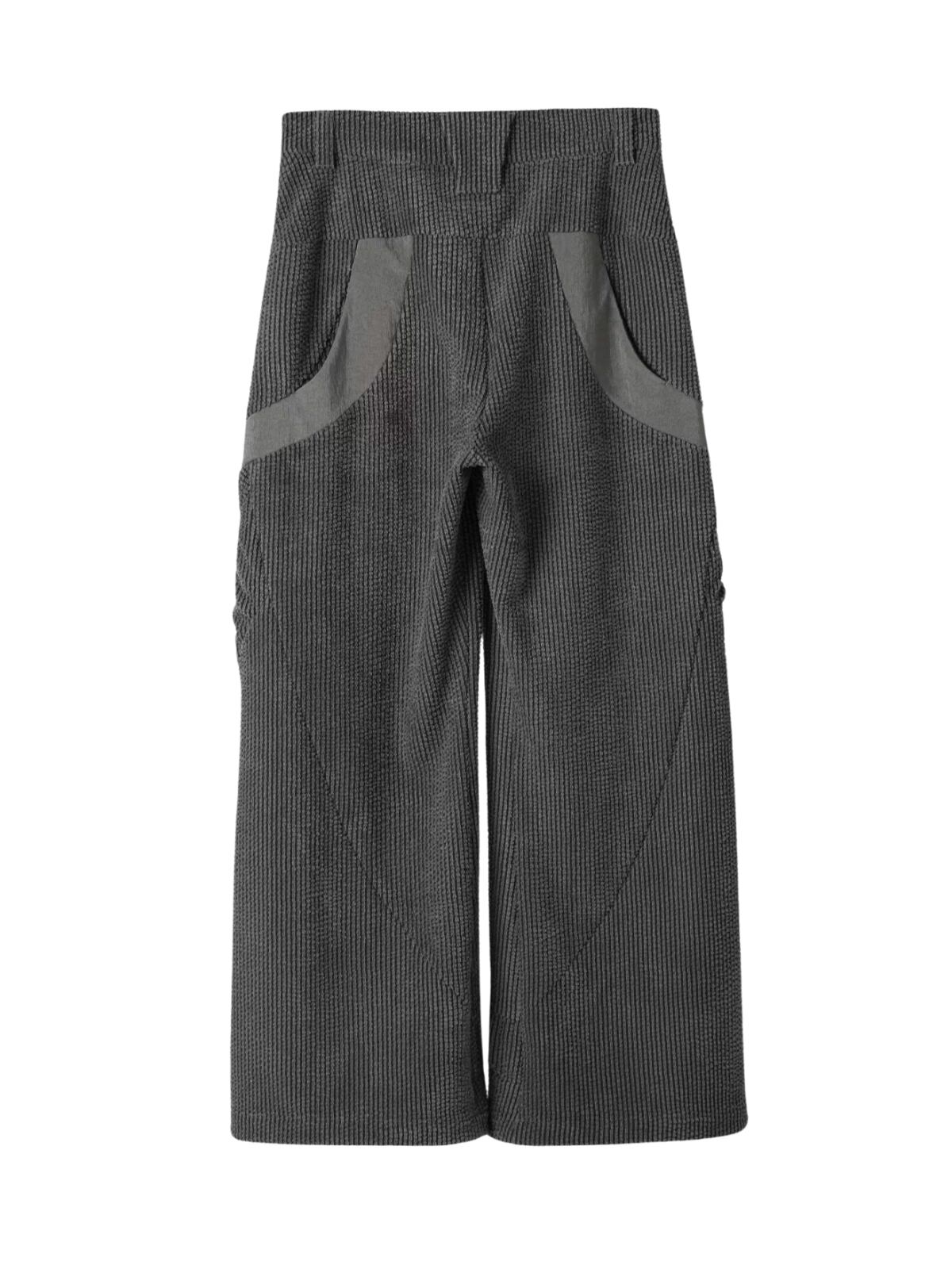 「魚の尾」をモチーフにしたユニークなパッチワークと、幾何学的なカッティングが融合した、モードなワイドパンツ。