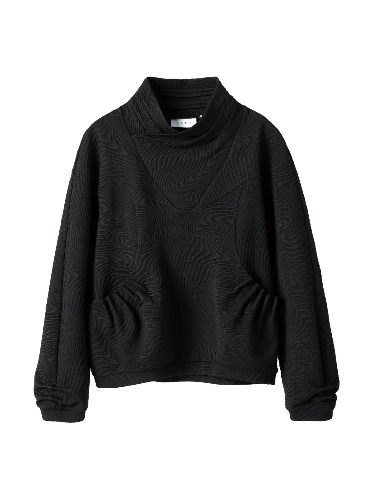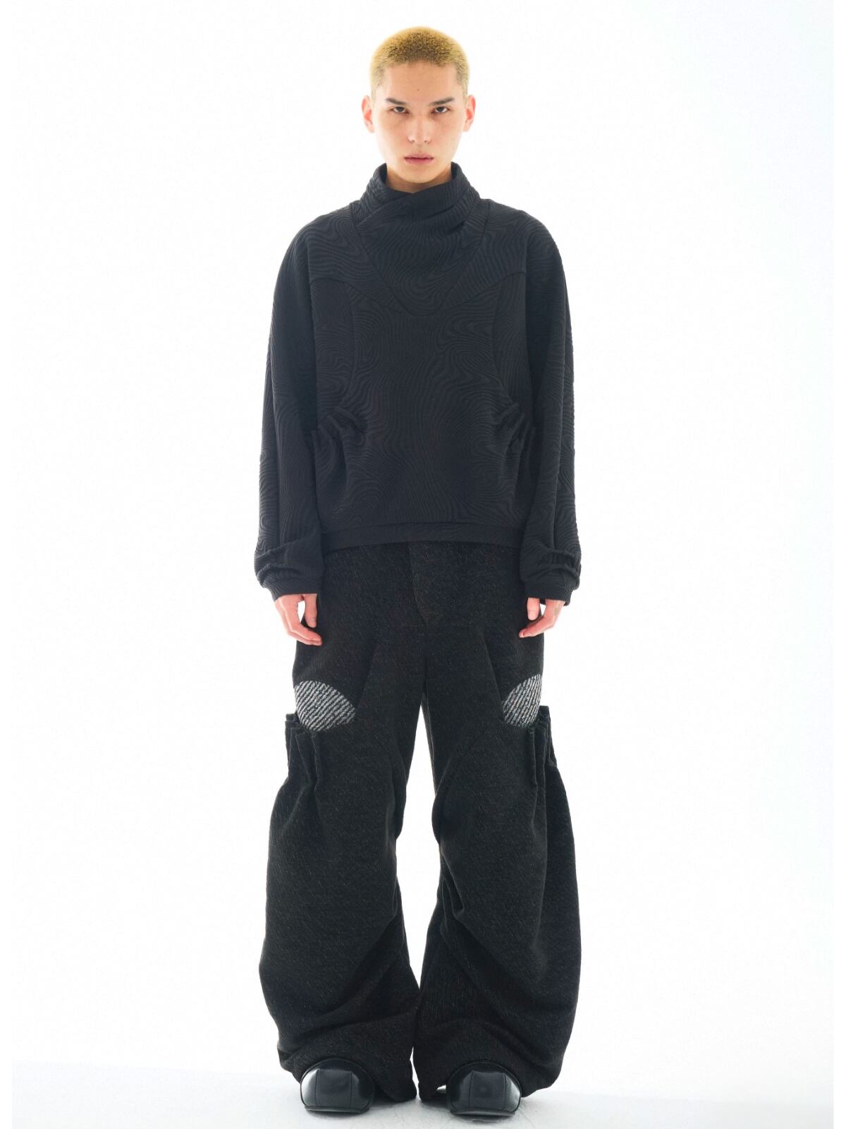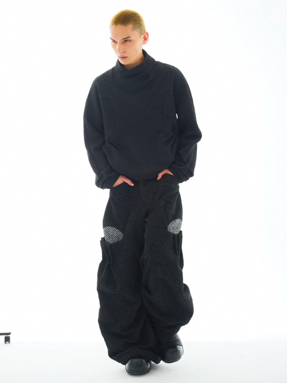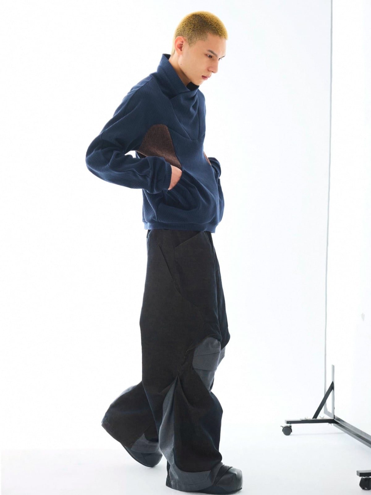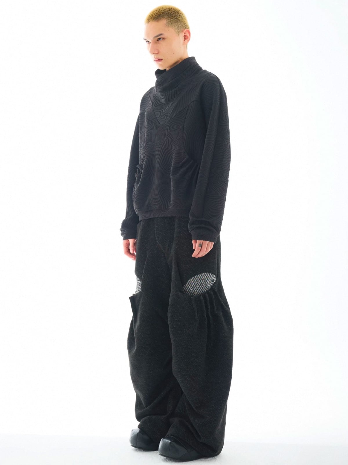 ドロップショルダーのルーズフィットが相まって、快適ながらもユニークな存在感を放ちます。