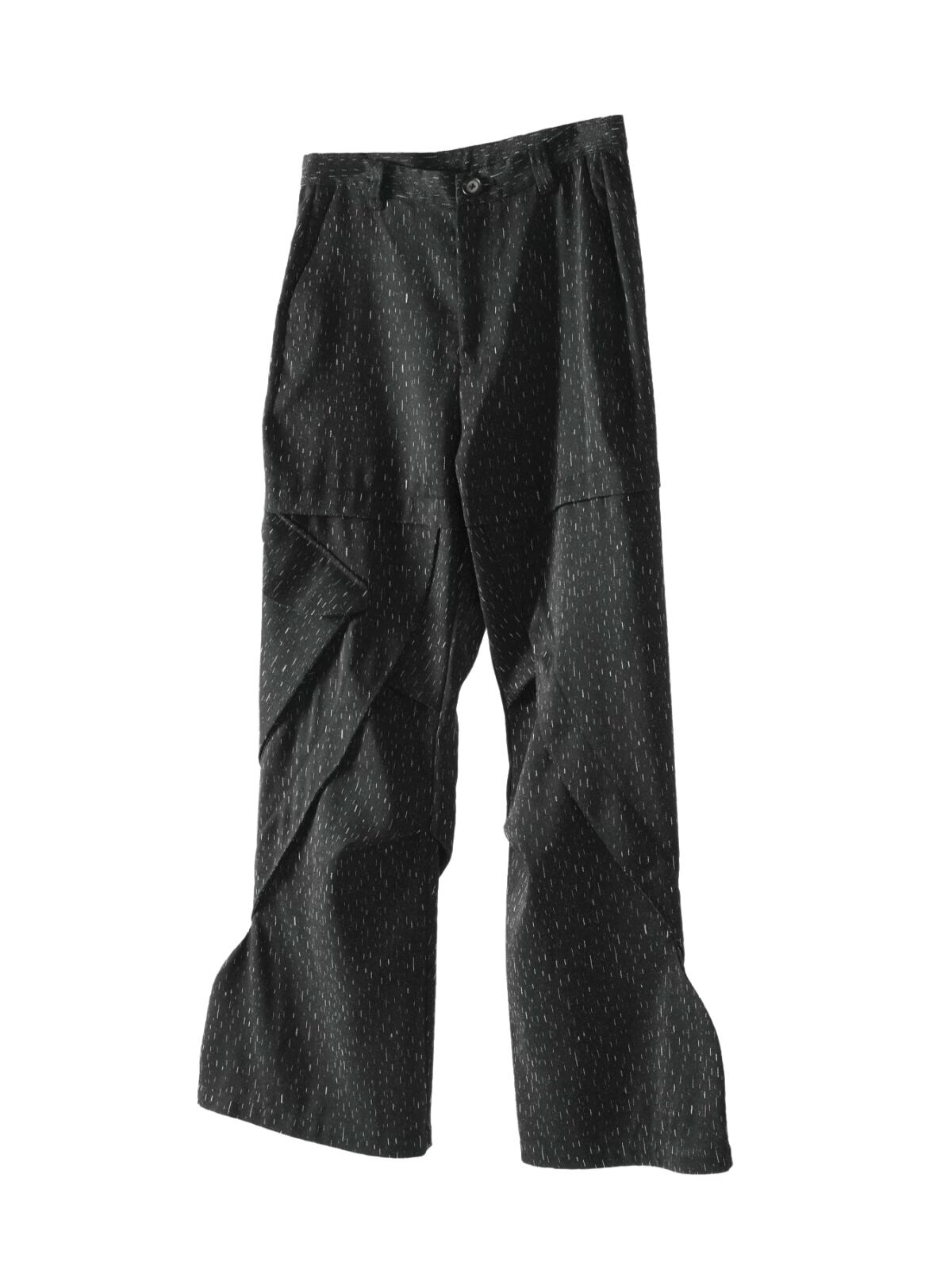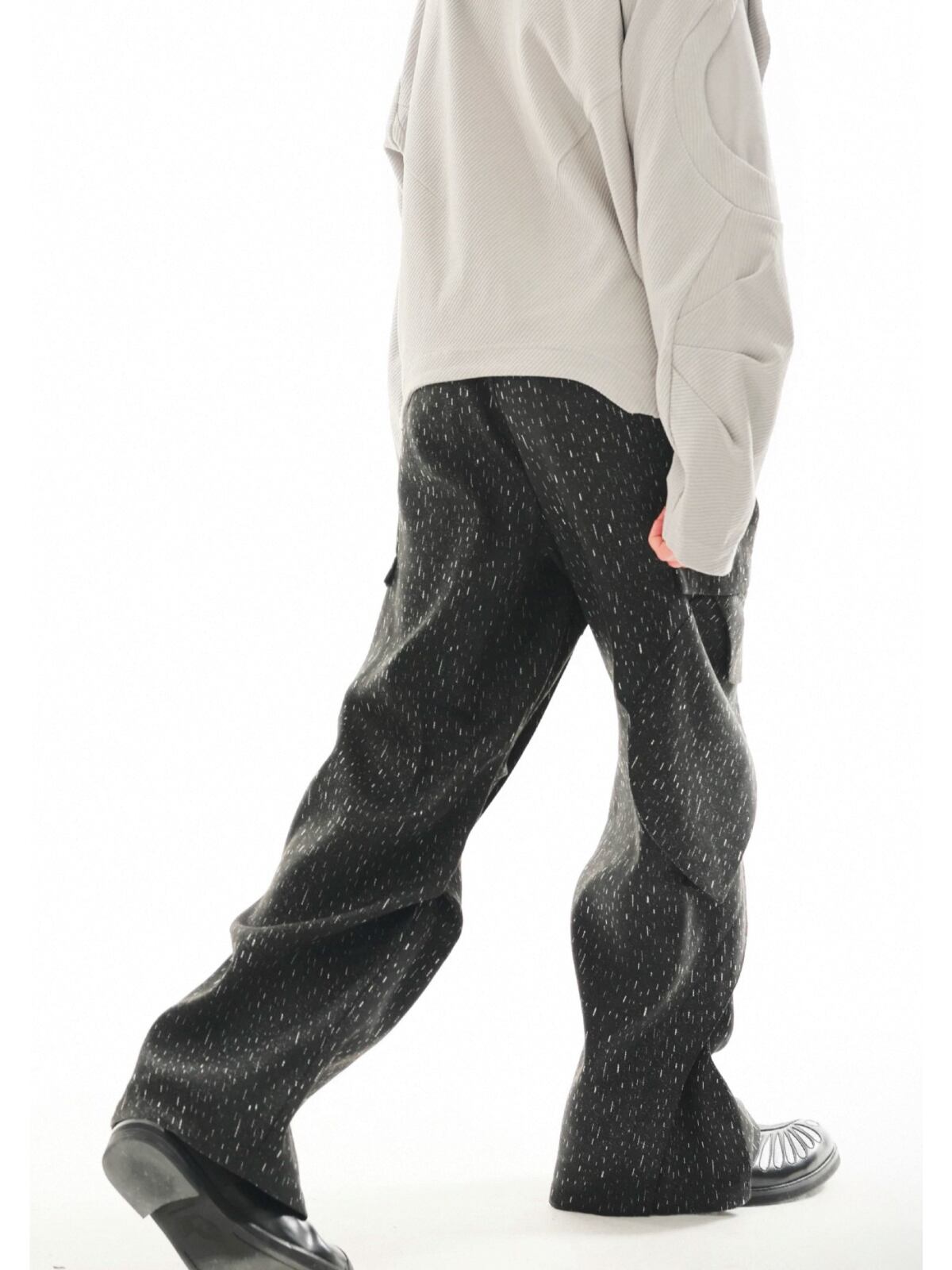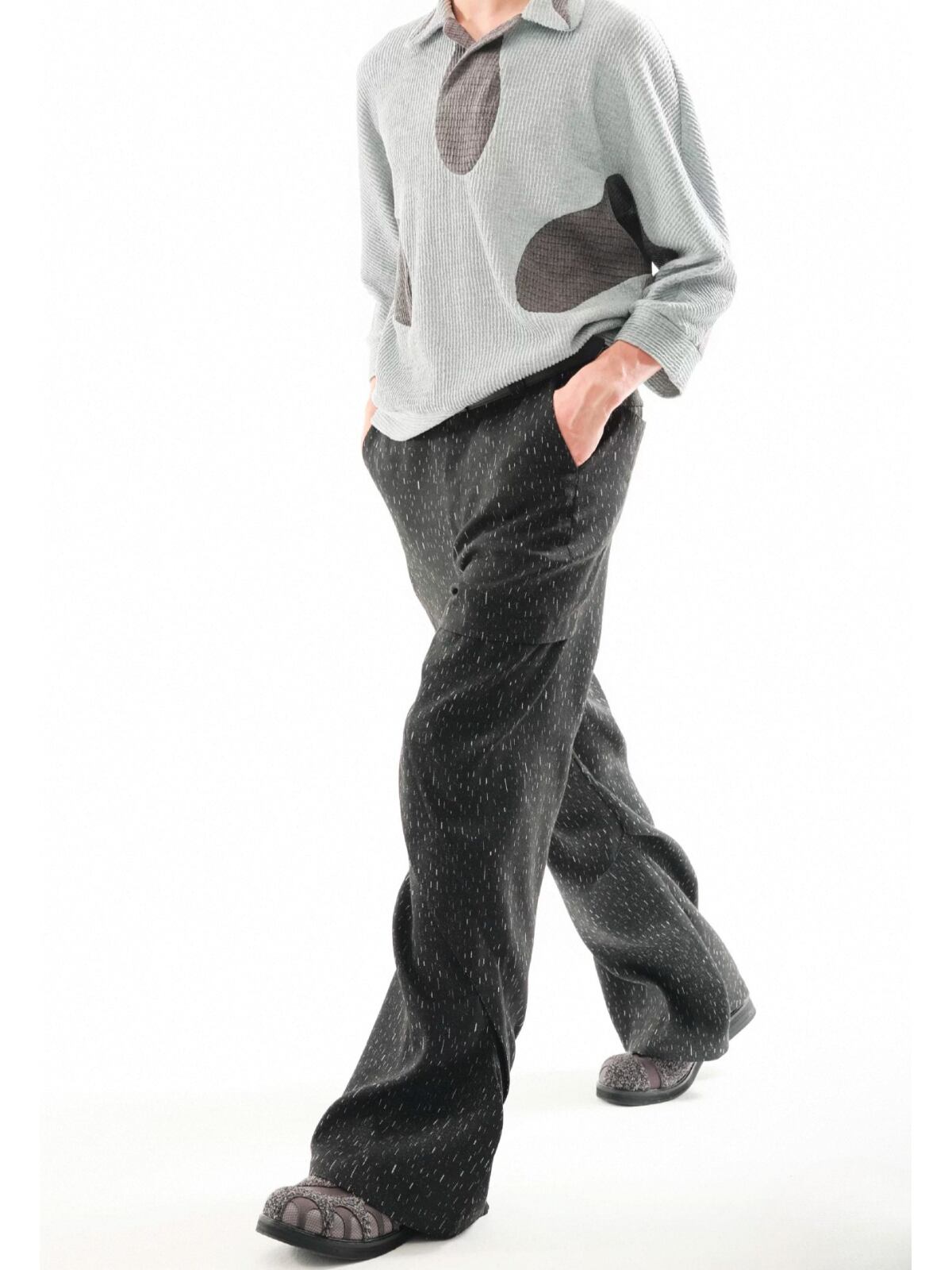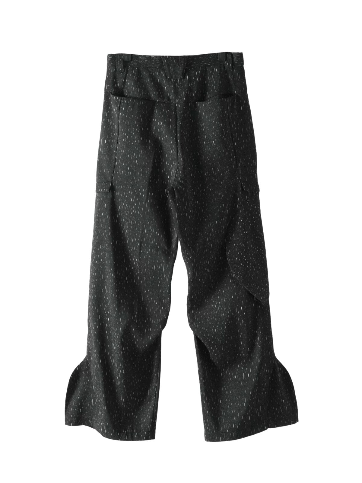 「粒子」を模したジャカード織りが、視覚的な奥行きと流動的な美学を表現するワイドパンツ。遠目にはダークトーン、近寄ると浮かび上がる立体的な模様が、上質なムードを醸し出します。