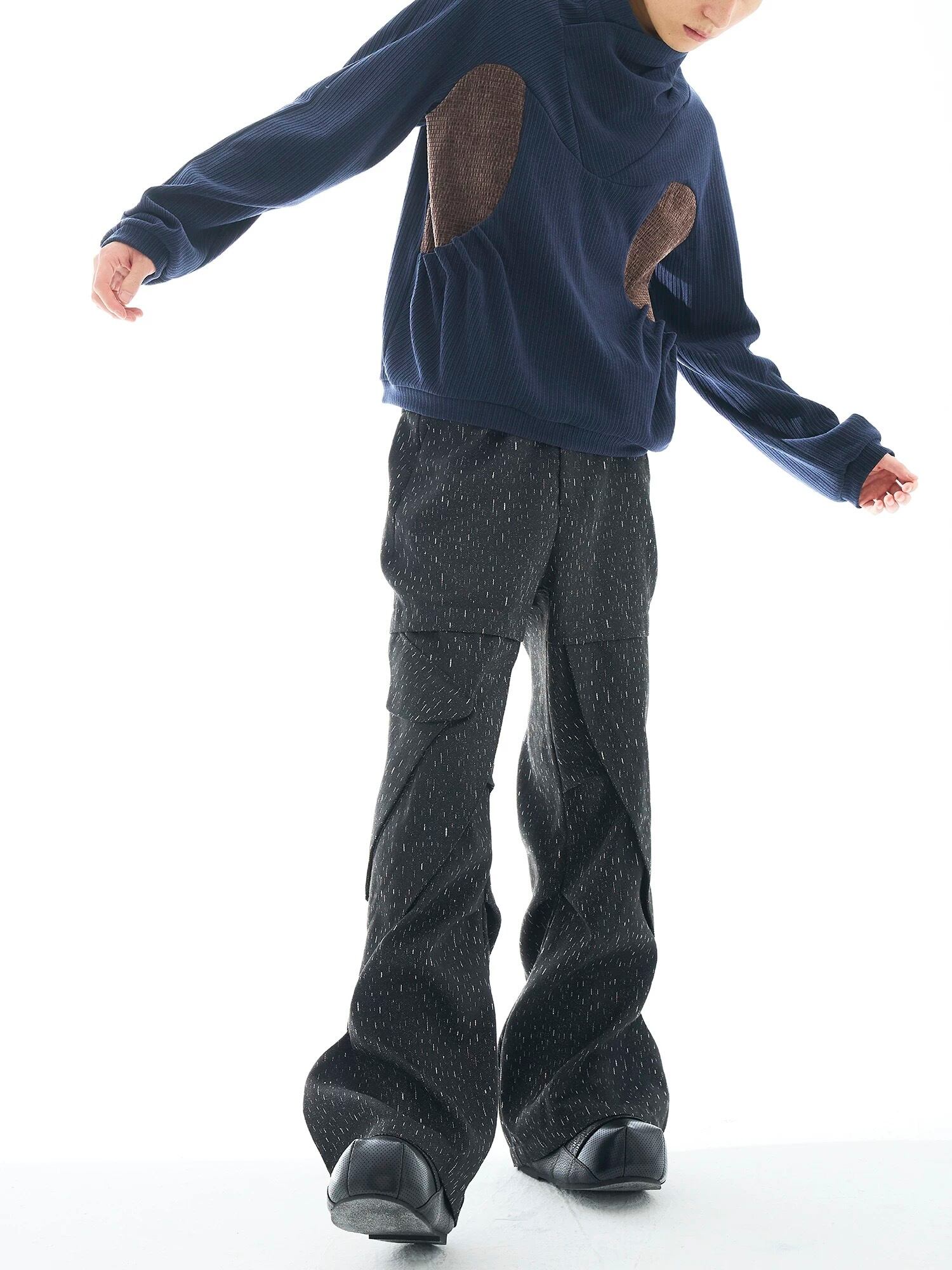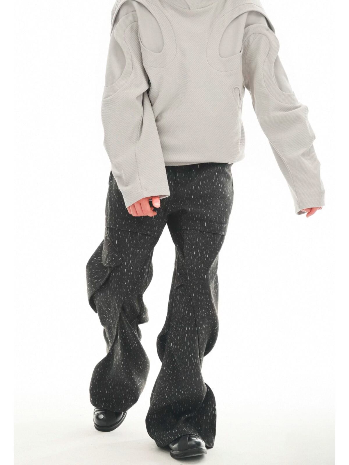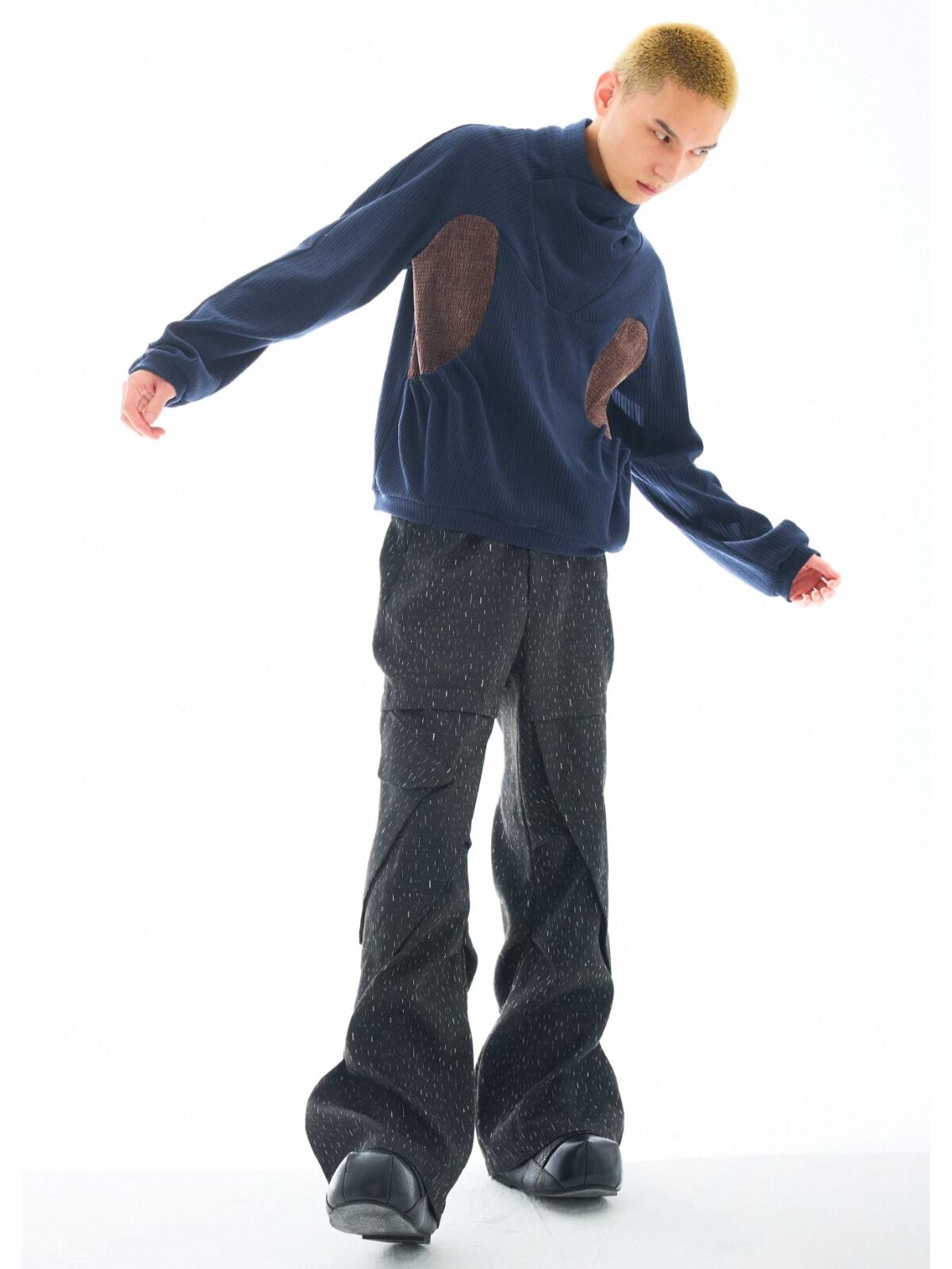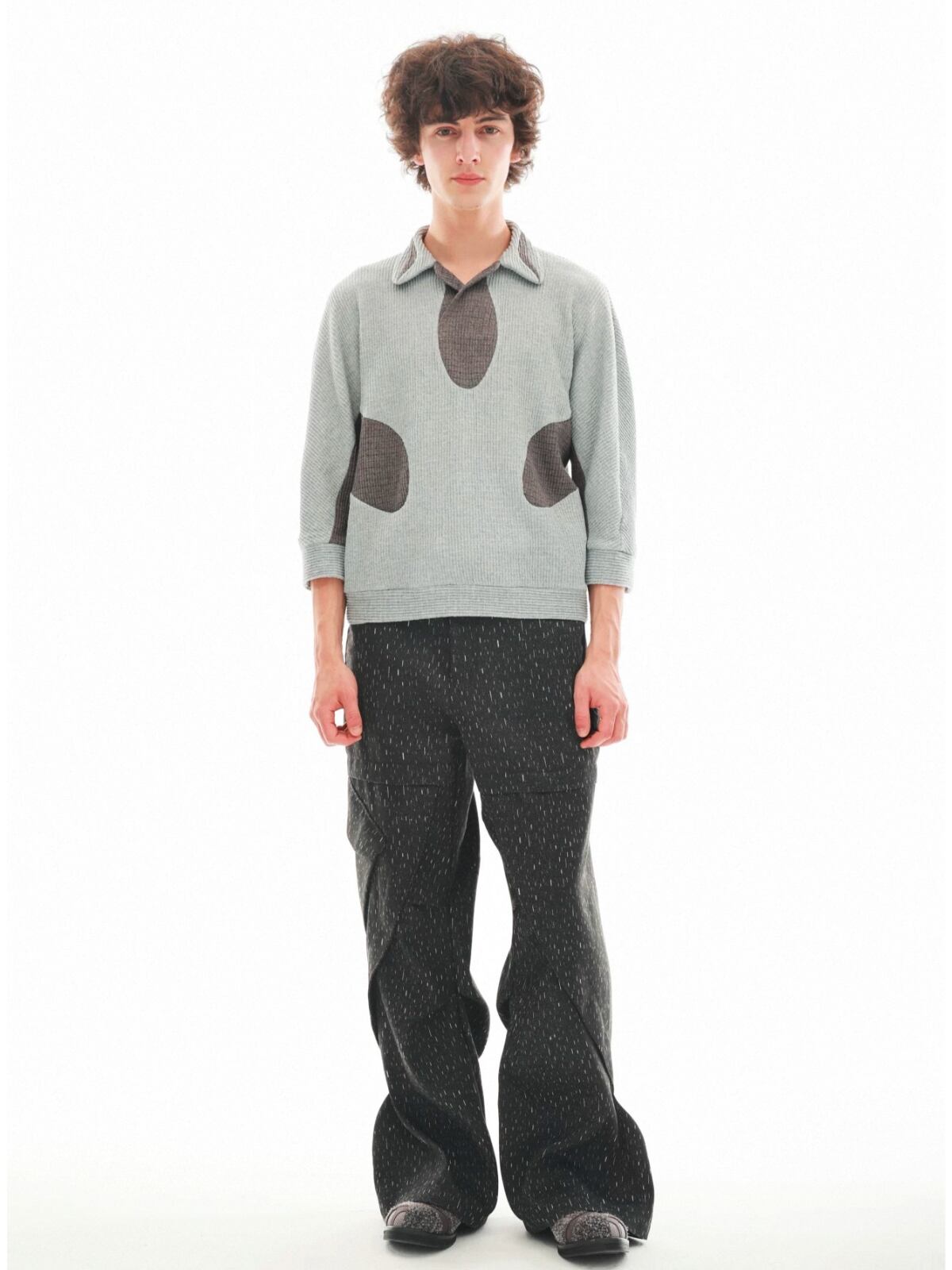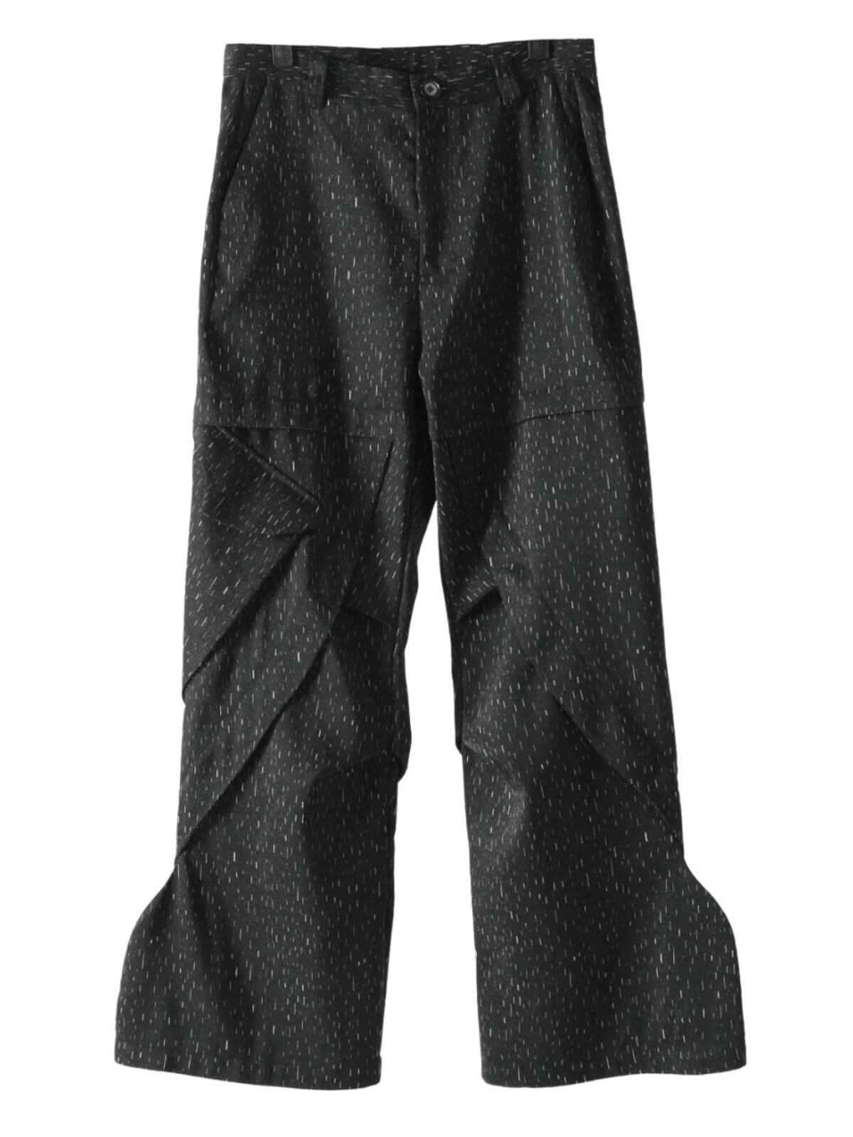 「粒子」を模したジャカード織りが、視覚的な奥行きと流動的な美学を表現するワイドパンツ。遠目にはダークトーン、近寄ると浮かび上がる立体的な模様が、上質なムードを醸し出します。