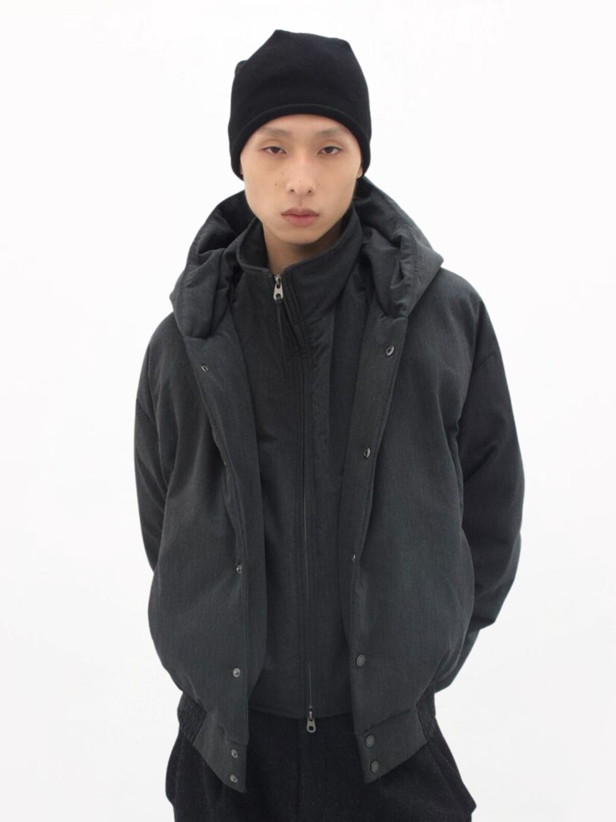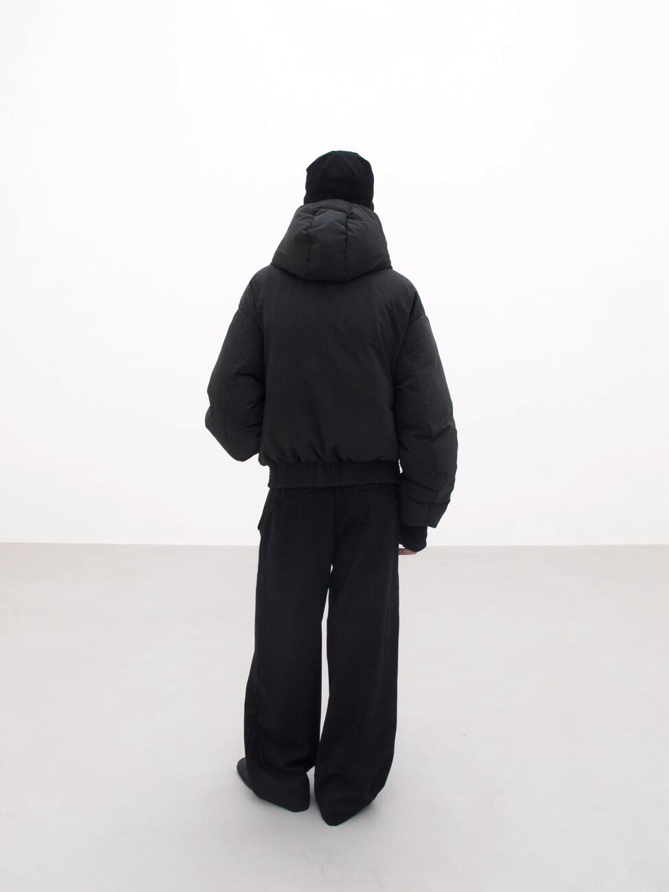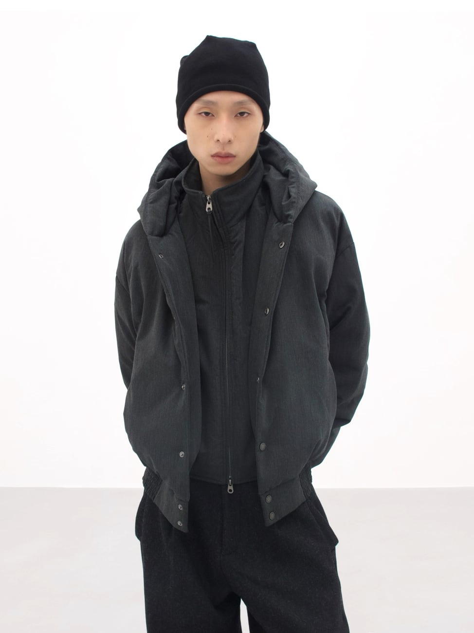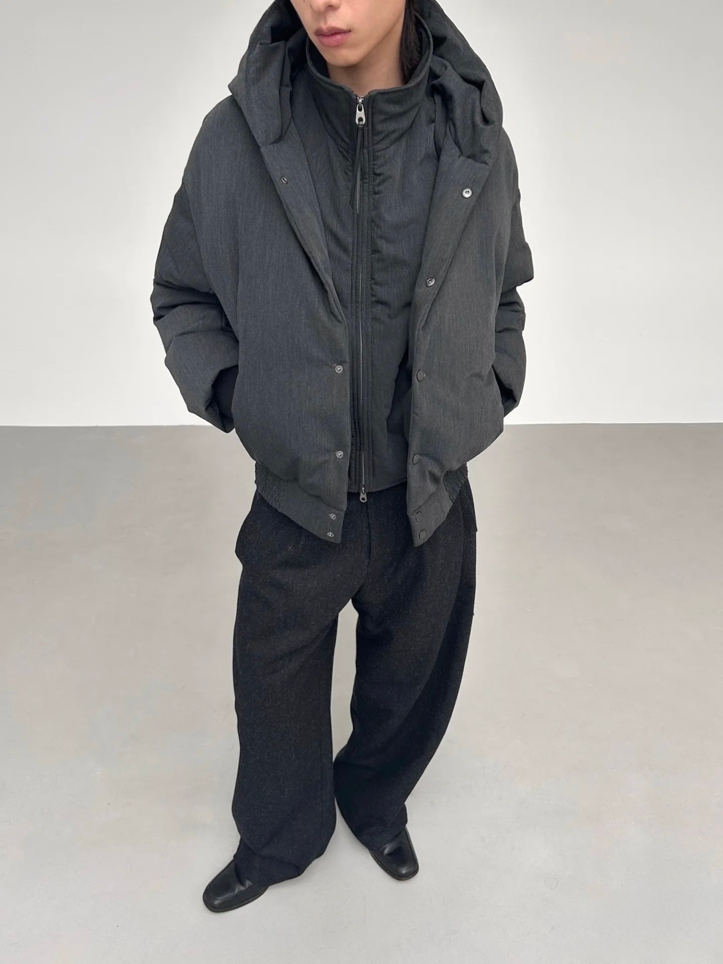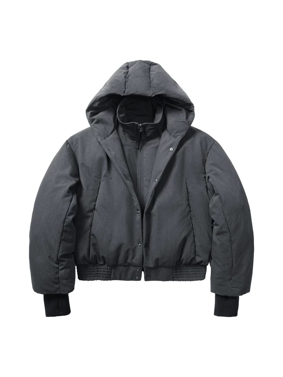 2層構造の立体裁断と中綿構造により、ボリューミーでありながら着膨れしない、美しいフォルムを実現したショート丈ジャケット。