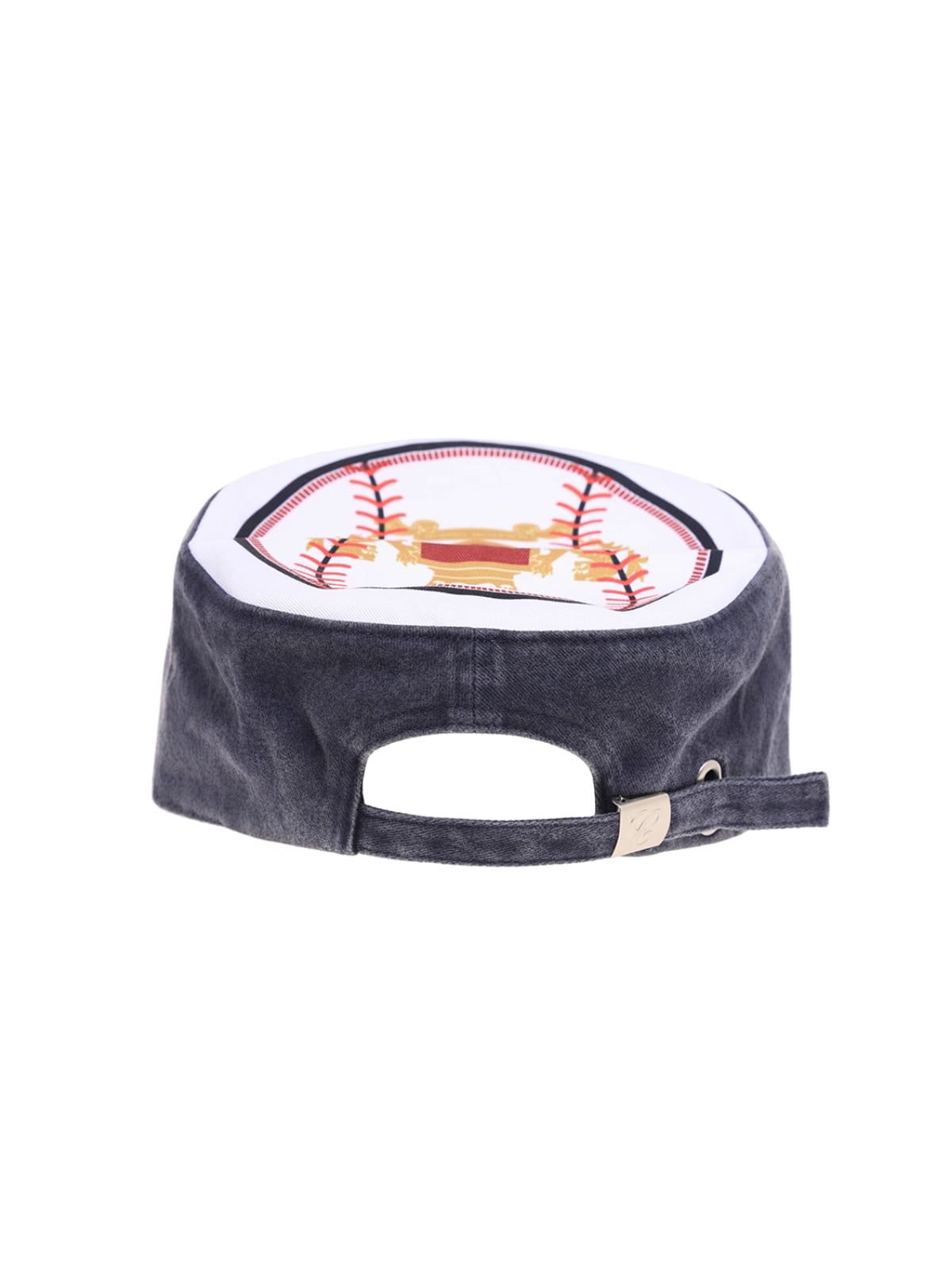ネイビー: コットン100%のデニム調素材に水洗加工を施し、カジュアルなユーズド感と、刺繍のコントラストが際立ちます。