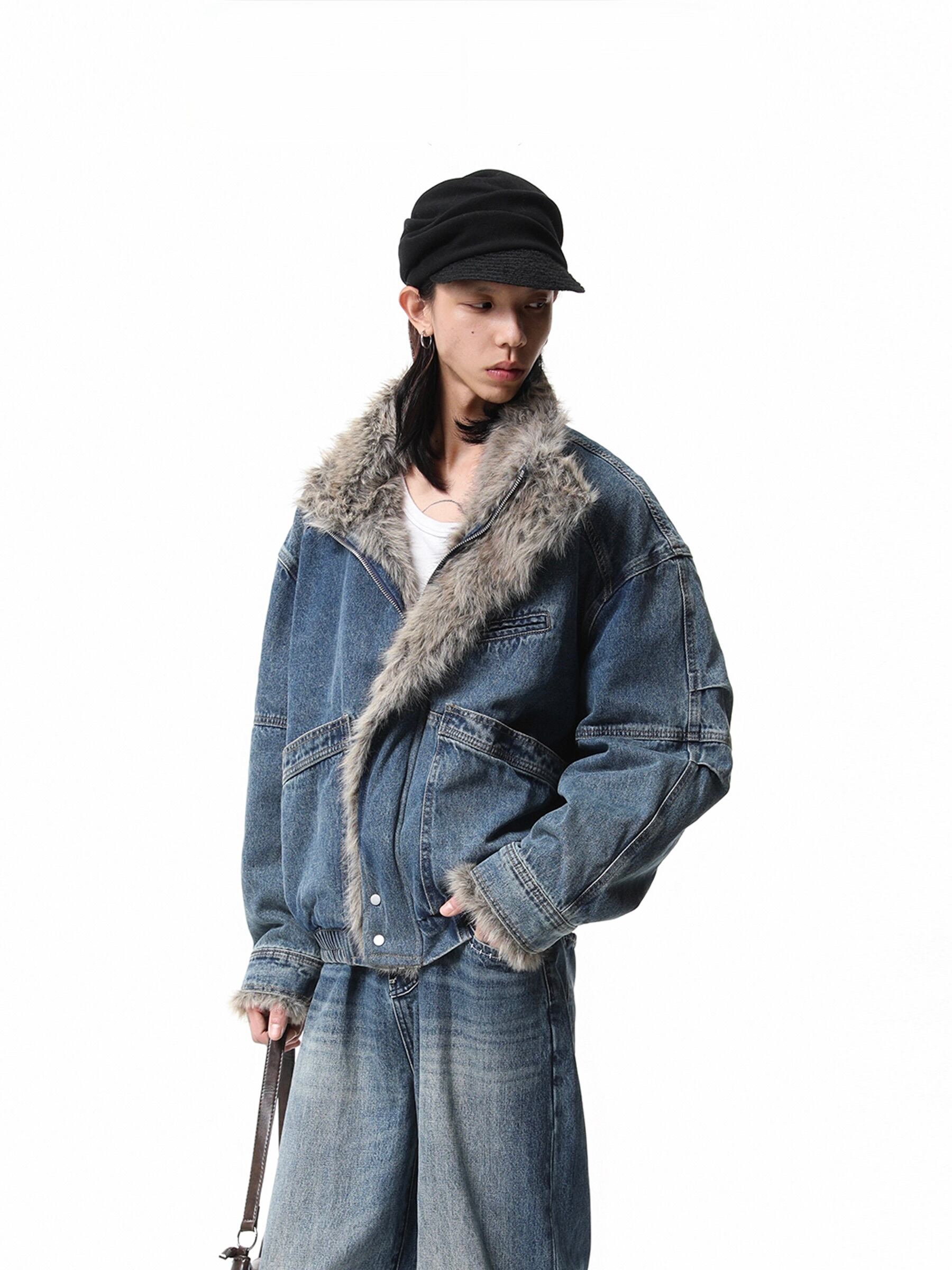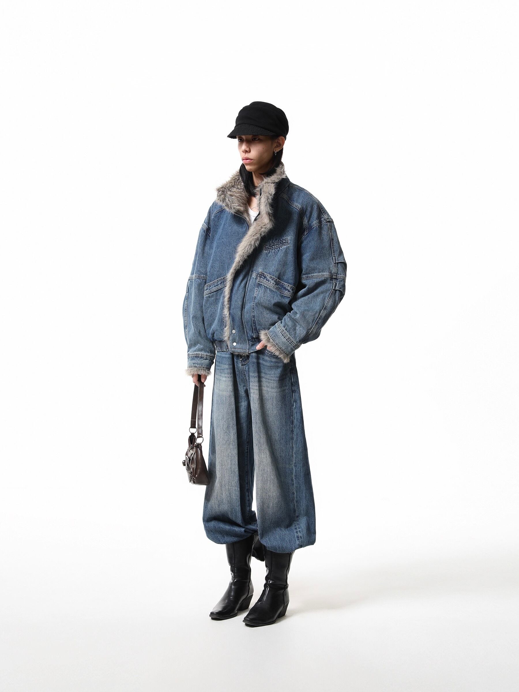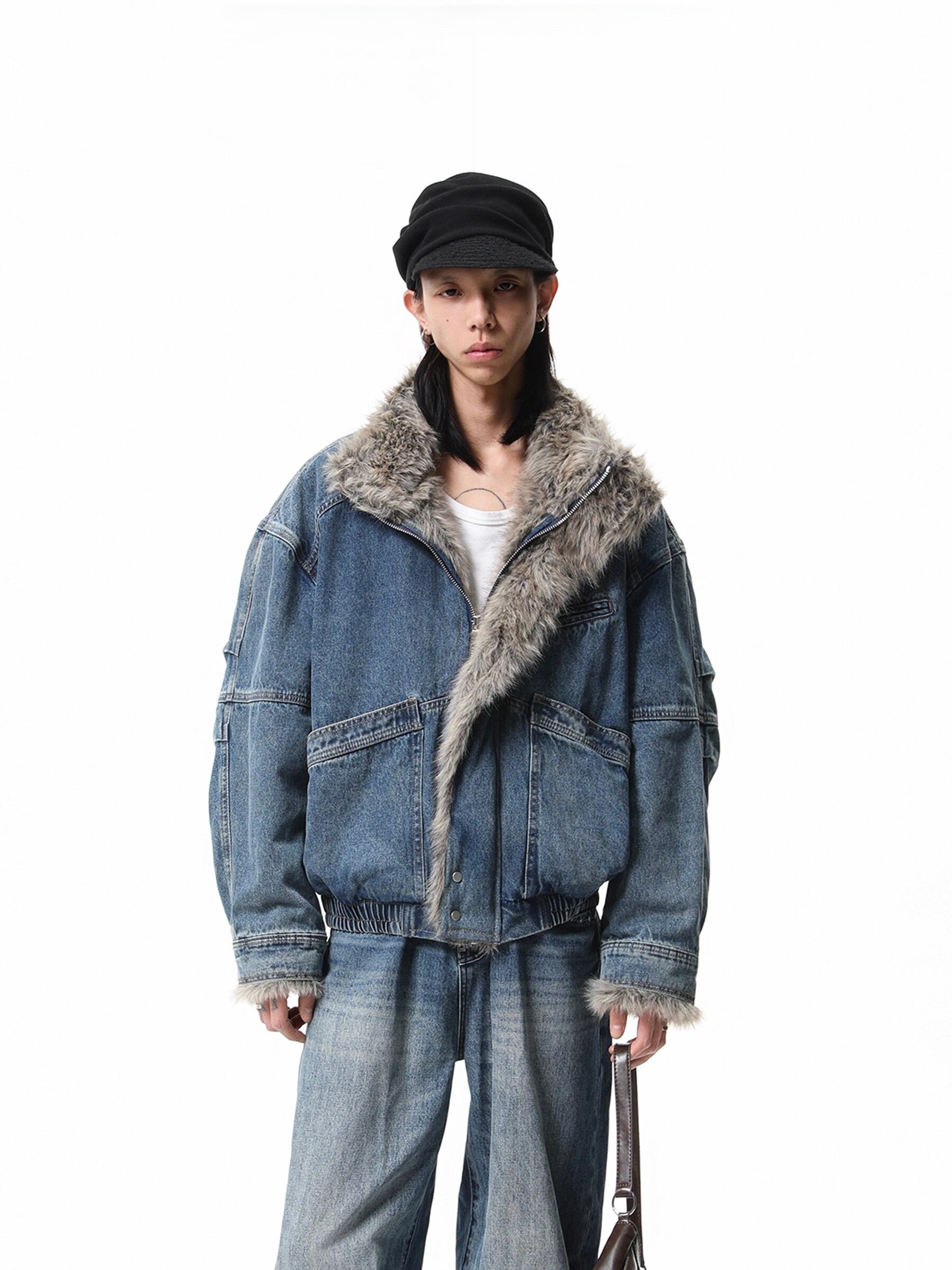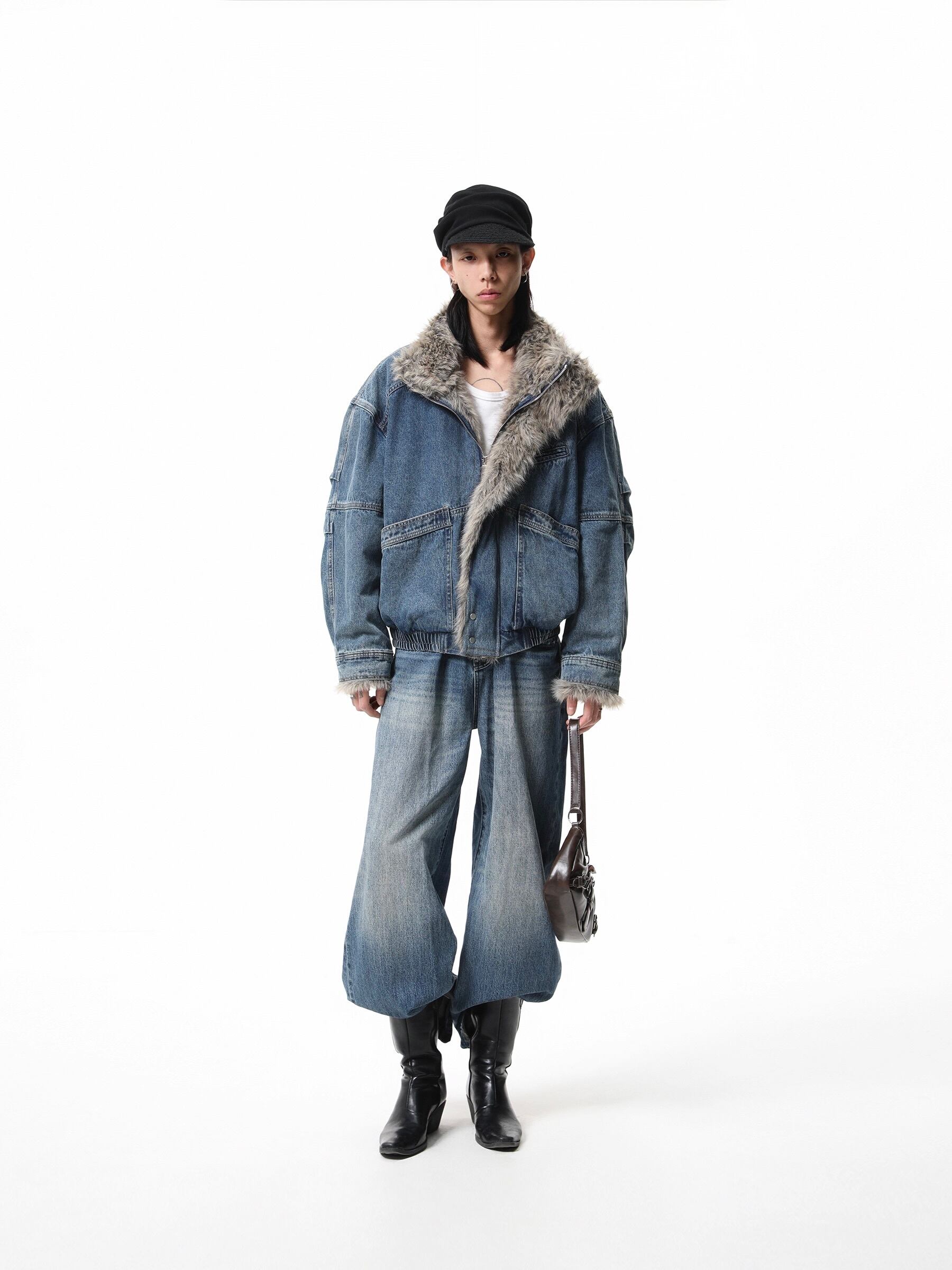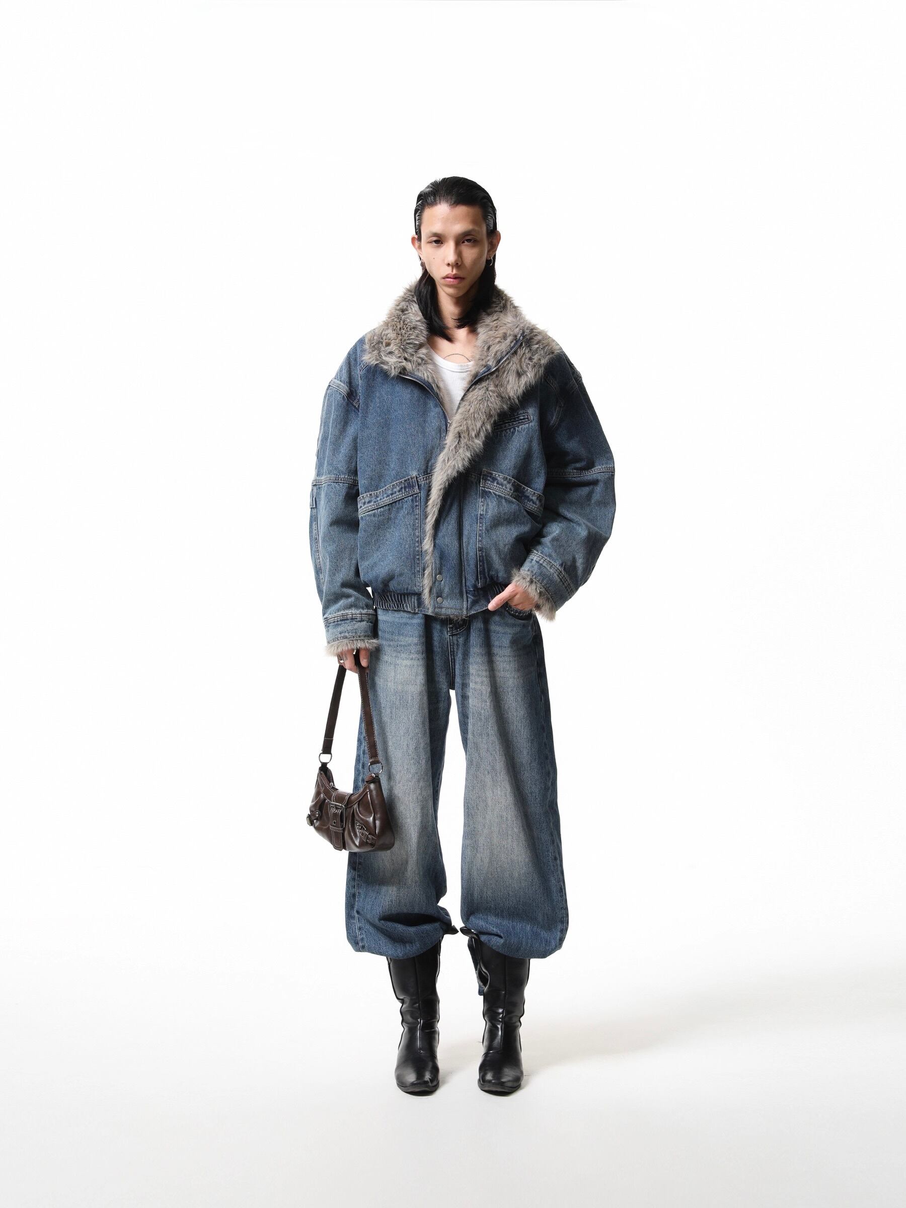 重厚感のあるヘビーウェイトなデニム素材に、ボリュームたっぷりのラグジュアリーなファー襟を組み合わせることで、圧倒的な存在感と高級感を演出しています。